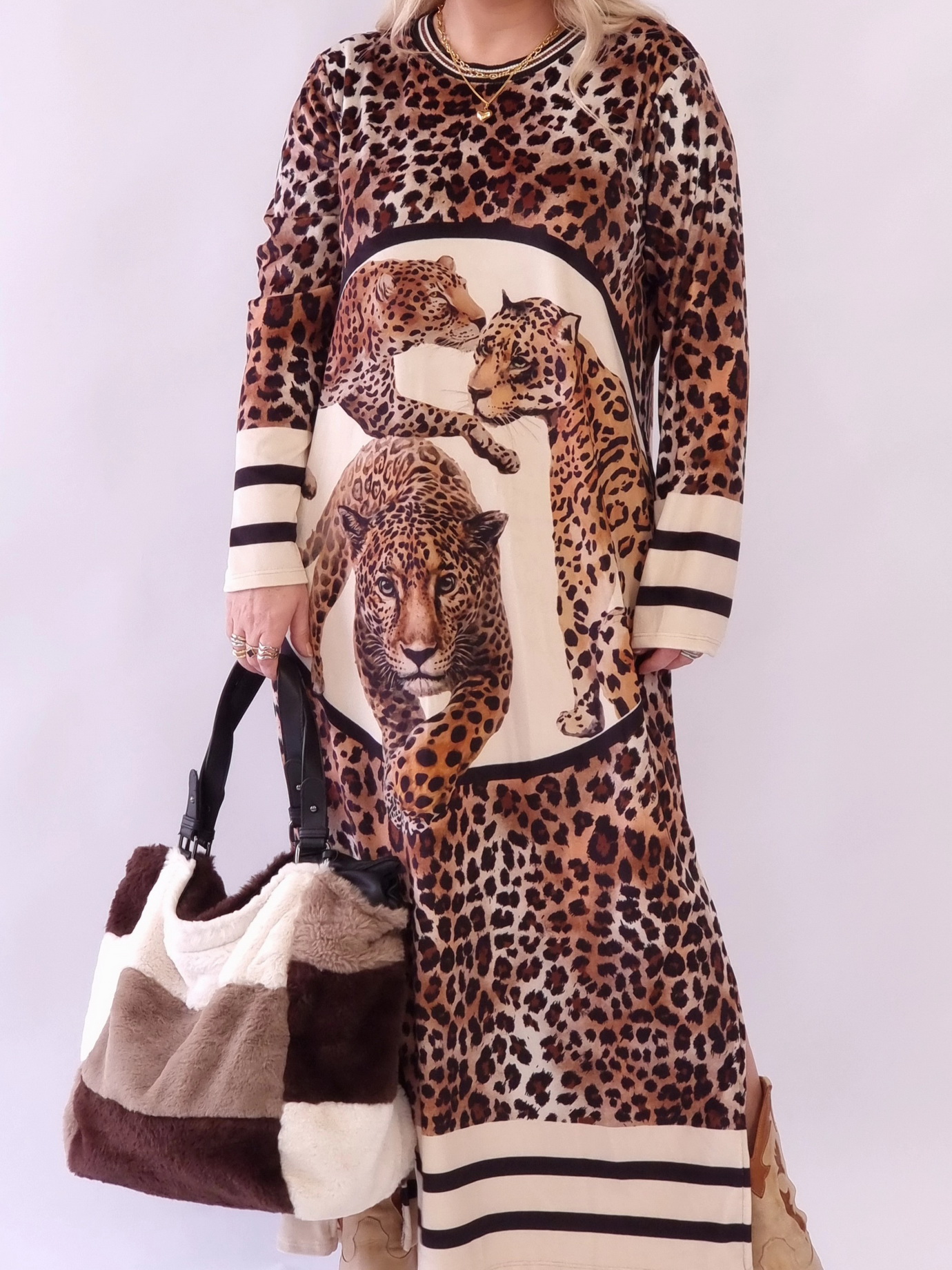 Αφέσου στη ζεστασιά και το στυλ! Ένα βελουτέ φόρεμα που αγκαλιάζει το σώμα με άνεση και ξεχωρίζει με το εντυπωσιακό Leopard print. Oversized γραμμή για άνετες κομψές εμφανίσεις ιδανικό για μέρες που θέλεις να λάμπεις χωρίς προσπάθεια. (Η ζώνη πωλείται χωριστά) Αποστολή σε 24 ώρες.
