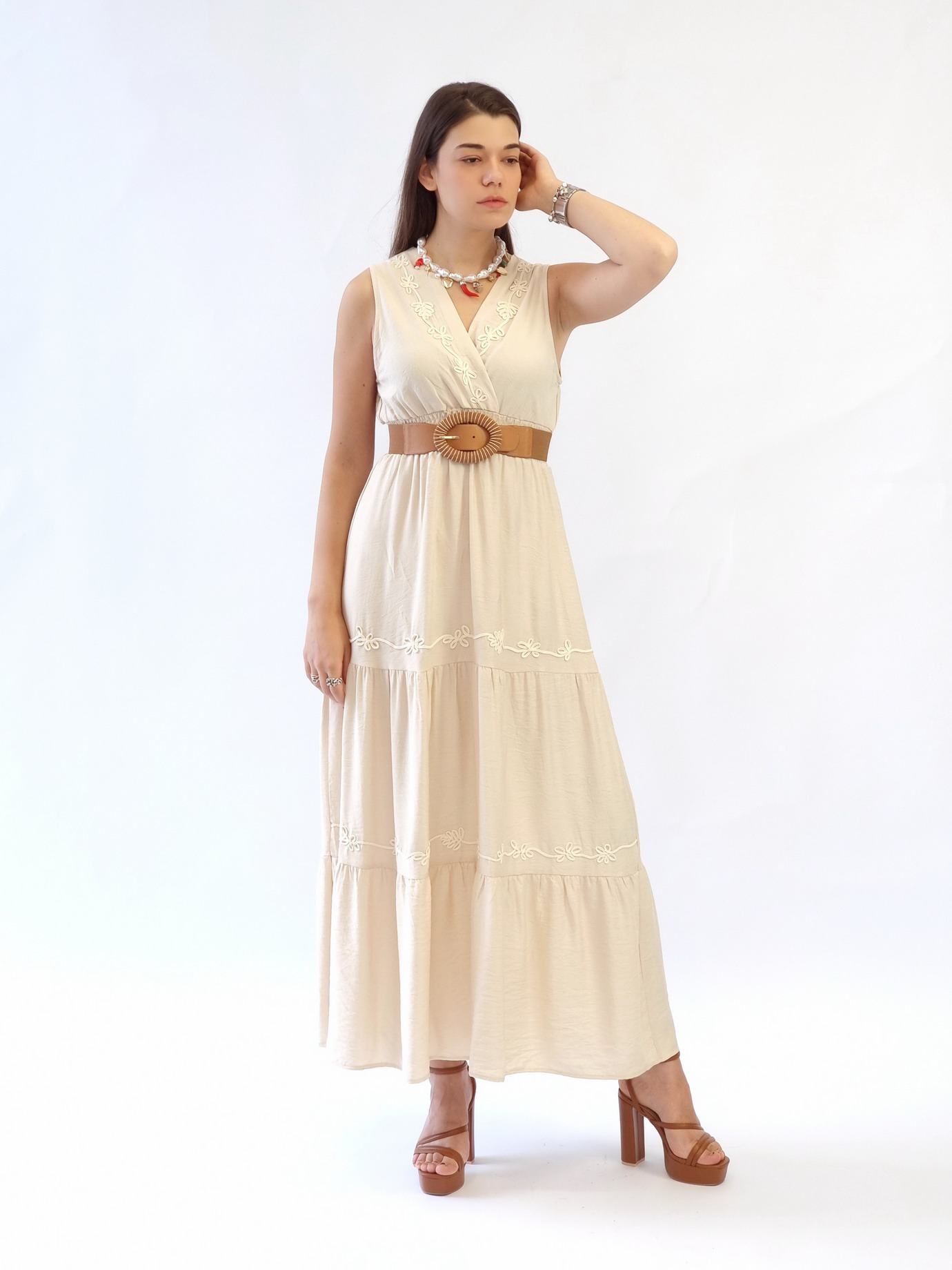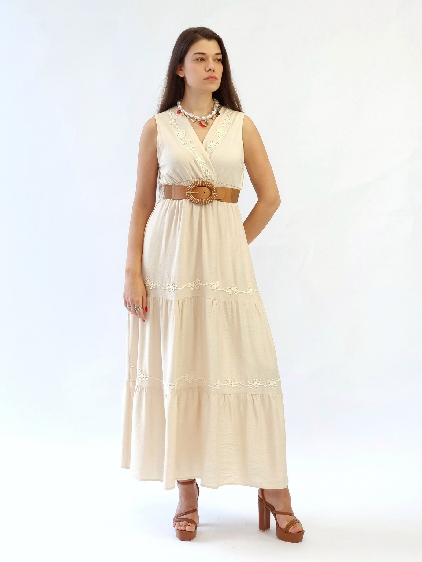 Φόρεμα μάξι κεντημένες λεπτομέρειες-Εκρού