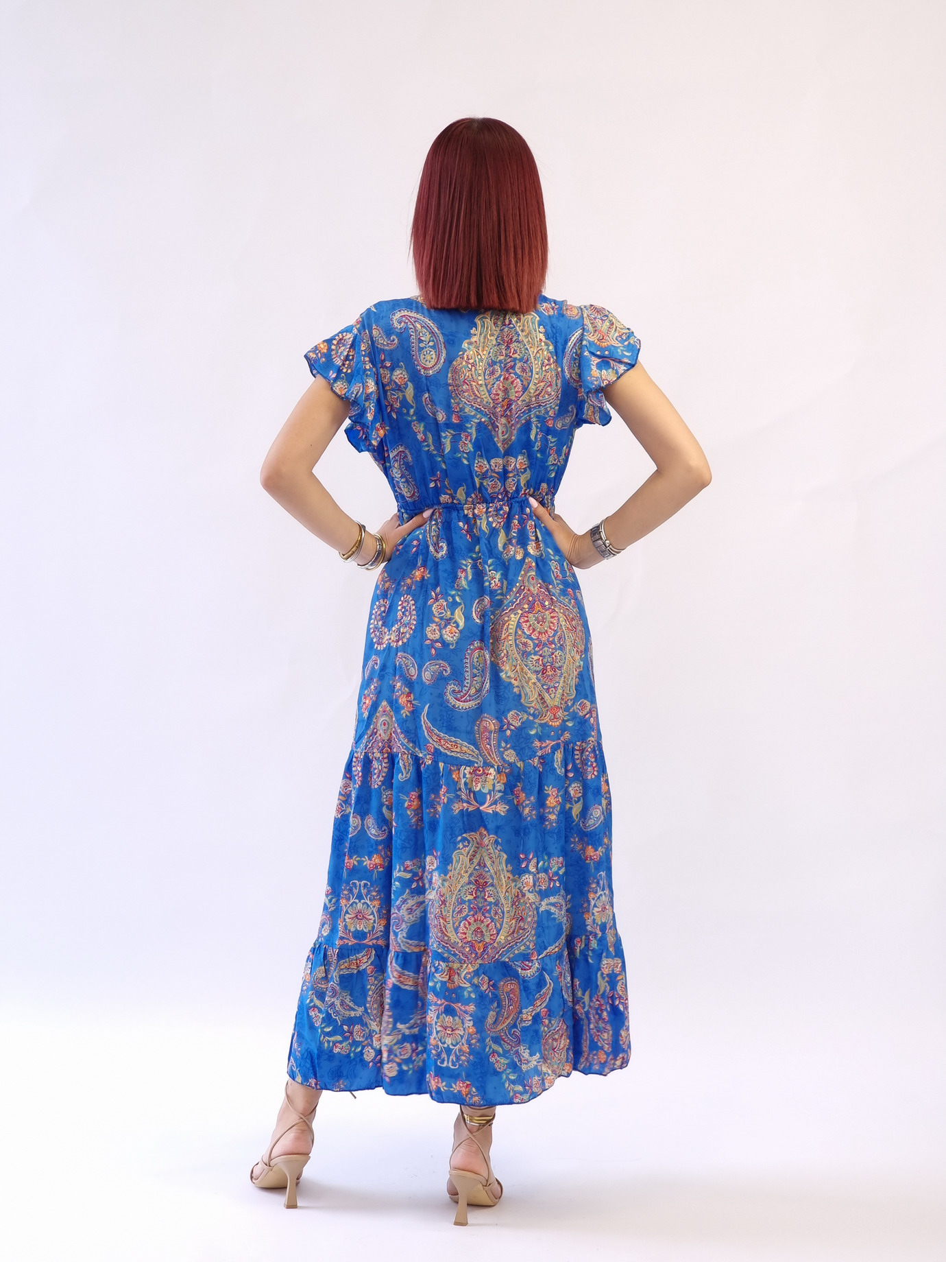• Φόρεμα μάξι κρουαζέ κοντομάνικο-Μπλέ