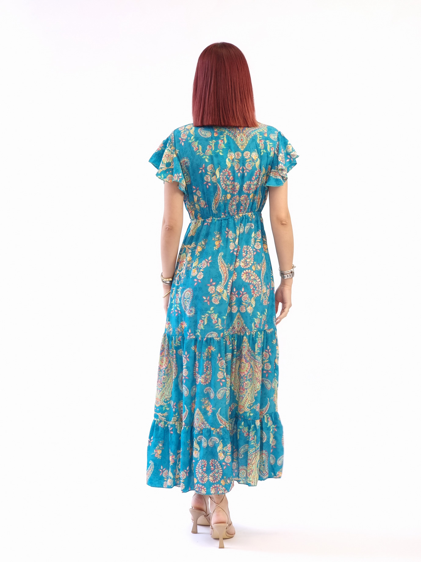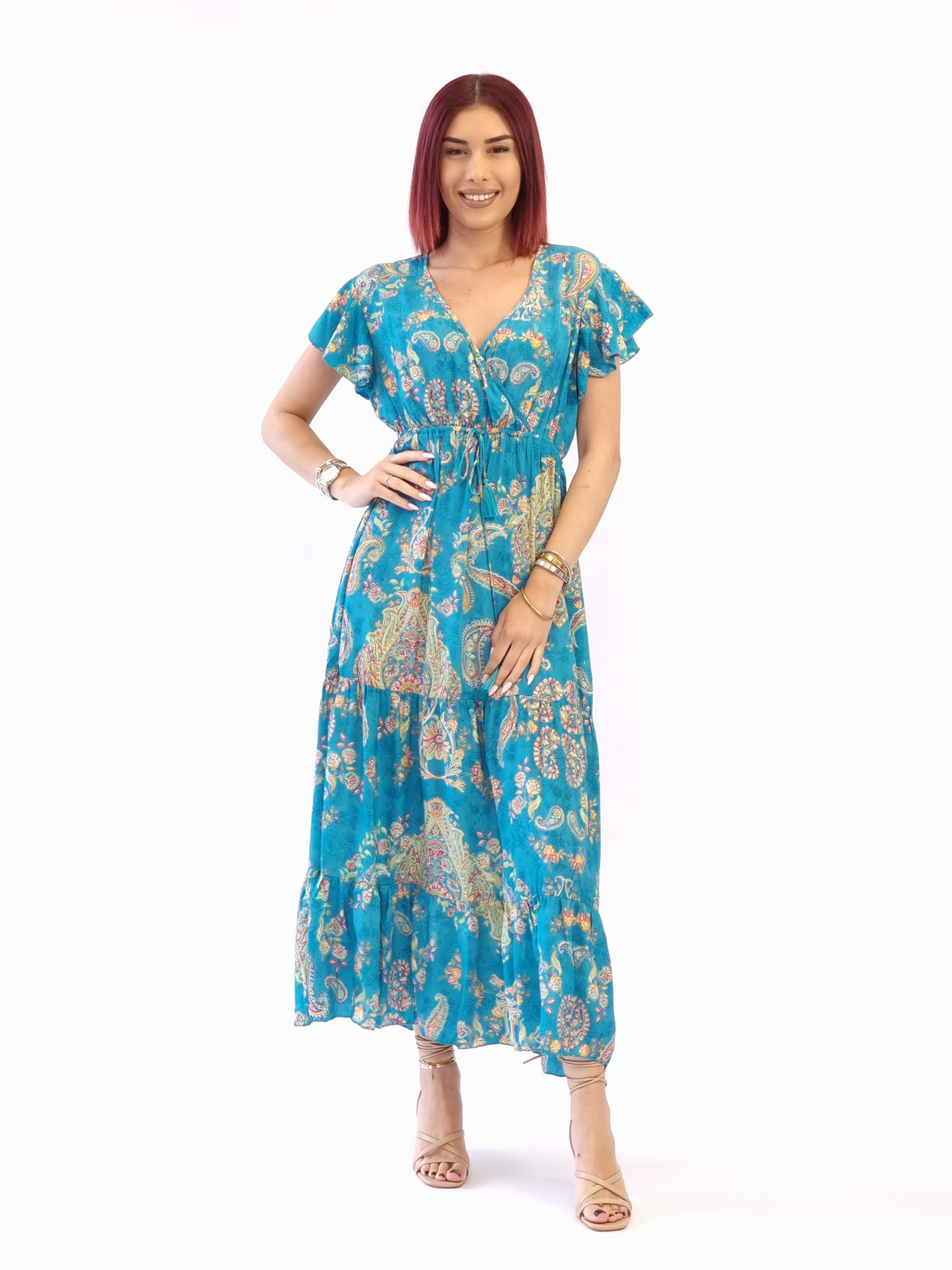 • Φόρεμα μάξι κρουαζέ κοντομάνικο-Τιρκουάζ
