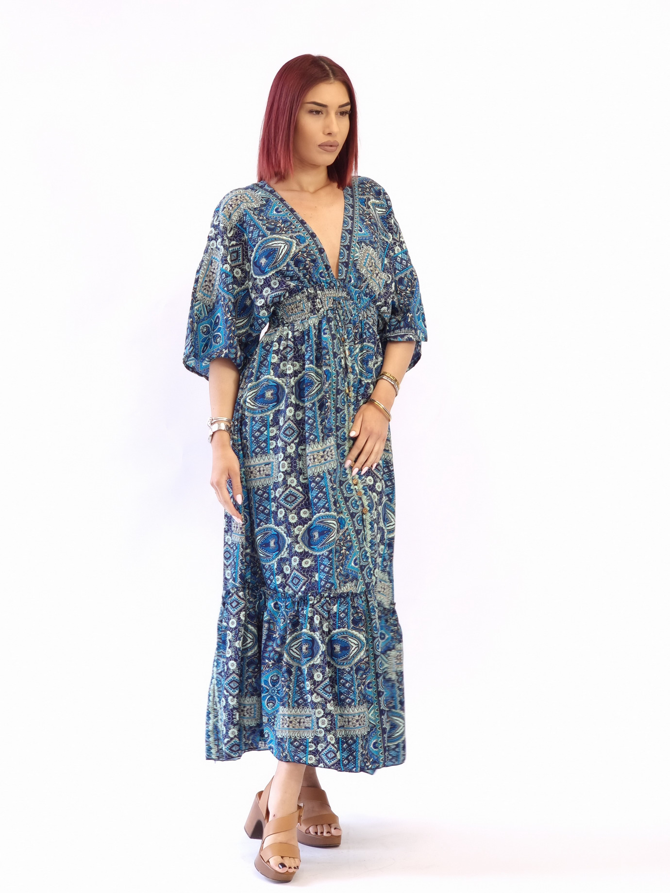 Φόρεμα μάξι λάστιχο και κουμπιά-Μπλέ