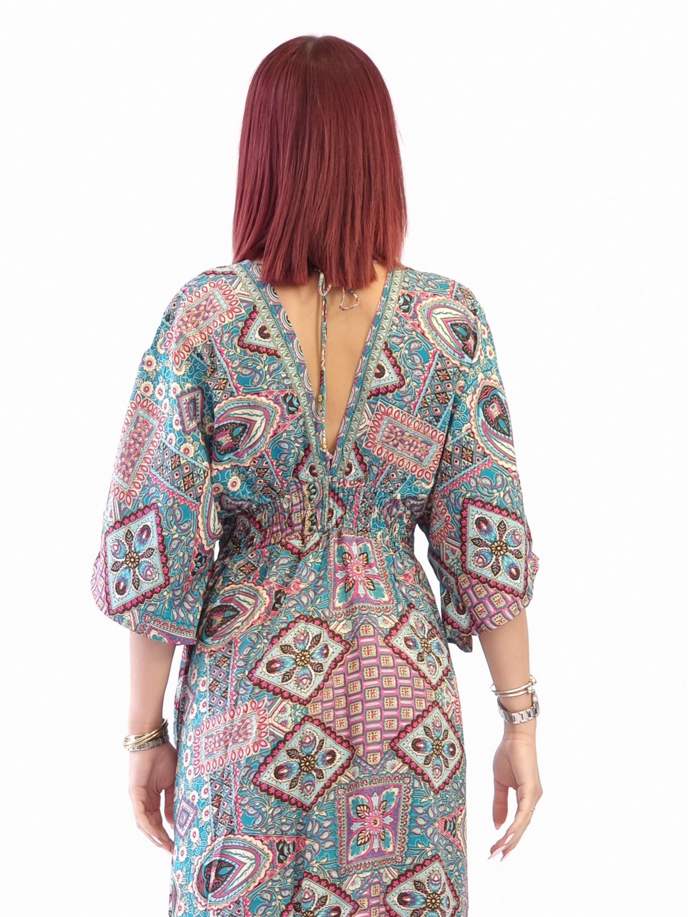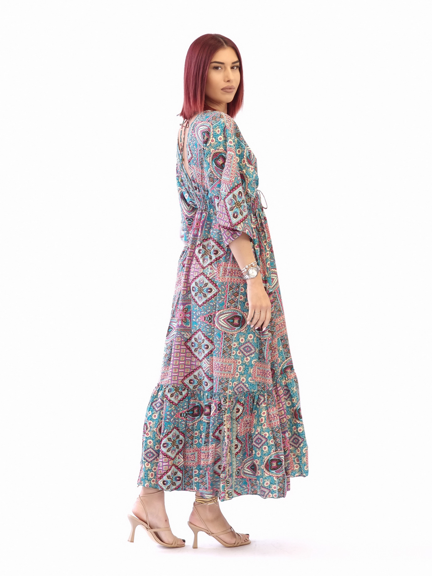 Φόρεμα μάξι λάστιχο και κουμπιά-Τιρκουάζ ροζ