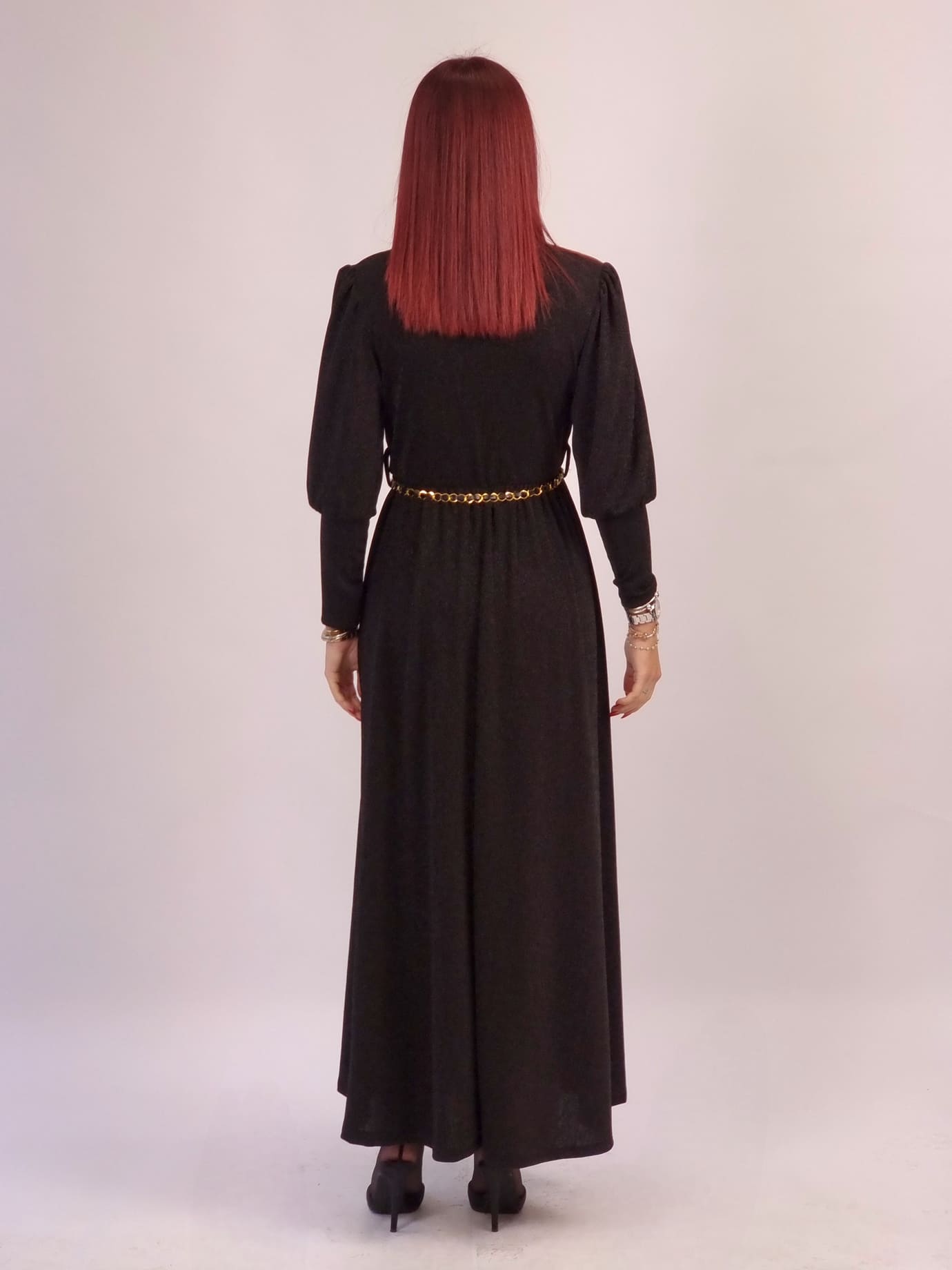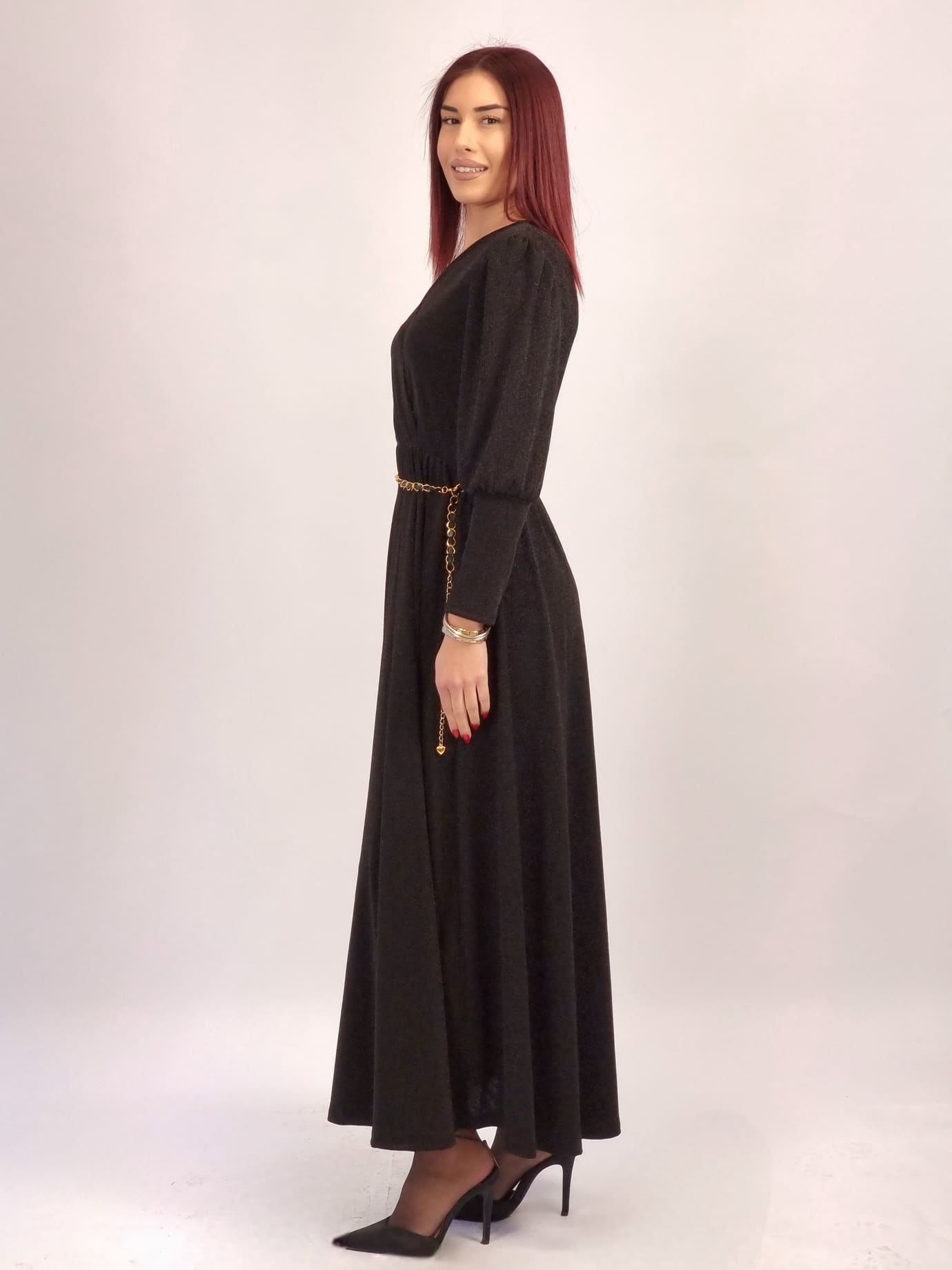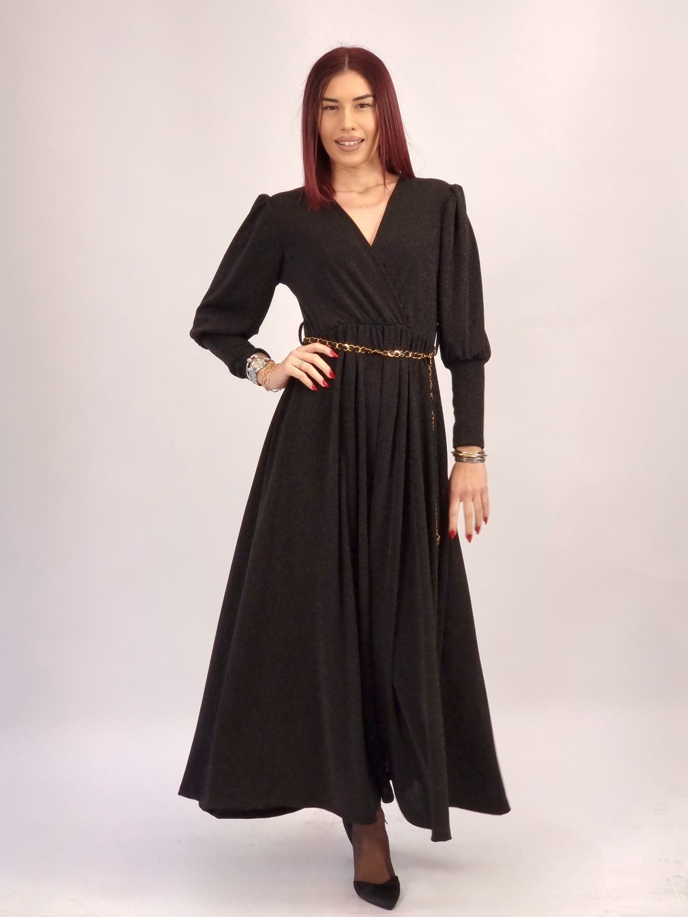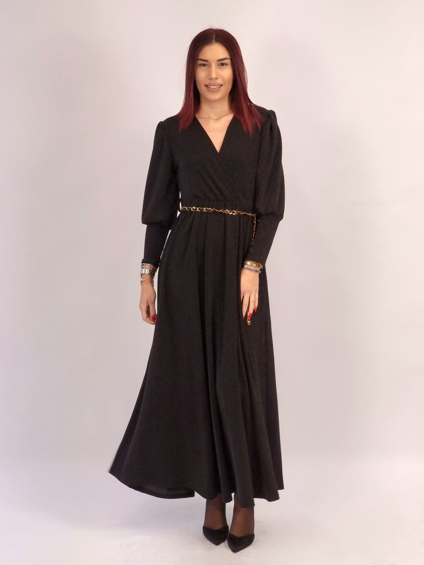 Αέρινο maxi φόρεμα lurex με διακριτική λάμψη, κρουαζέ V ντεκολτέ και μακριά μανίκια για κομψή εφαρμογή χωρίς υπερβολές. Η ζώνη-αλυσίδα είναι δώρο, ώστε να διαμορφώνεις το look όπως θέλεις.