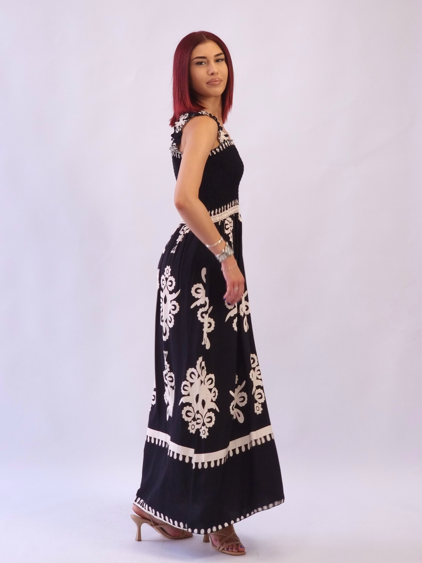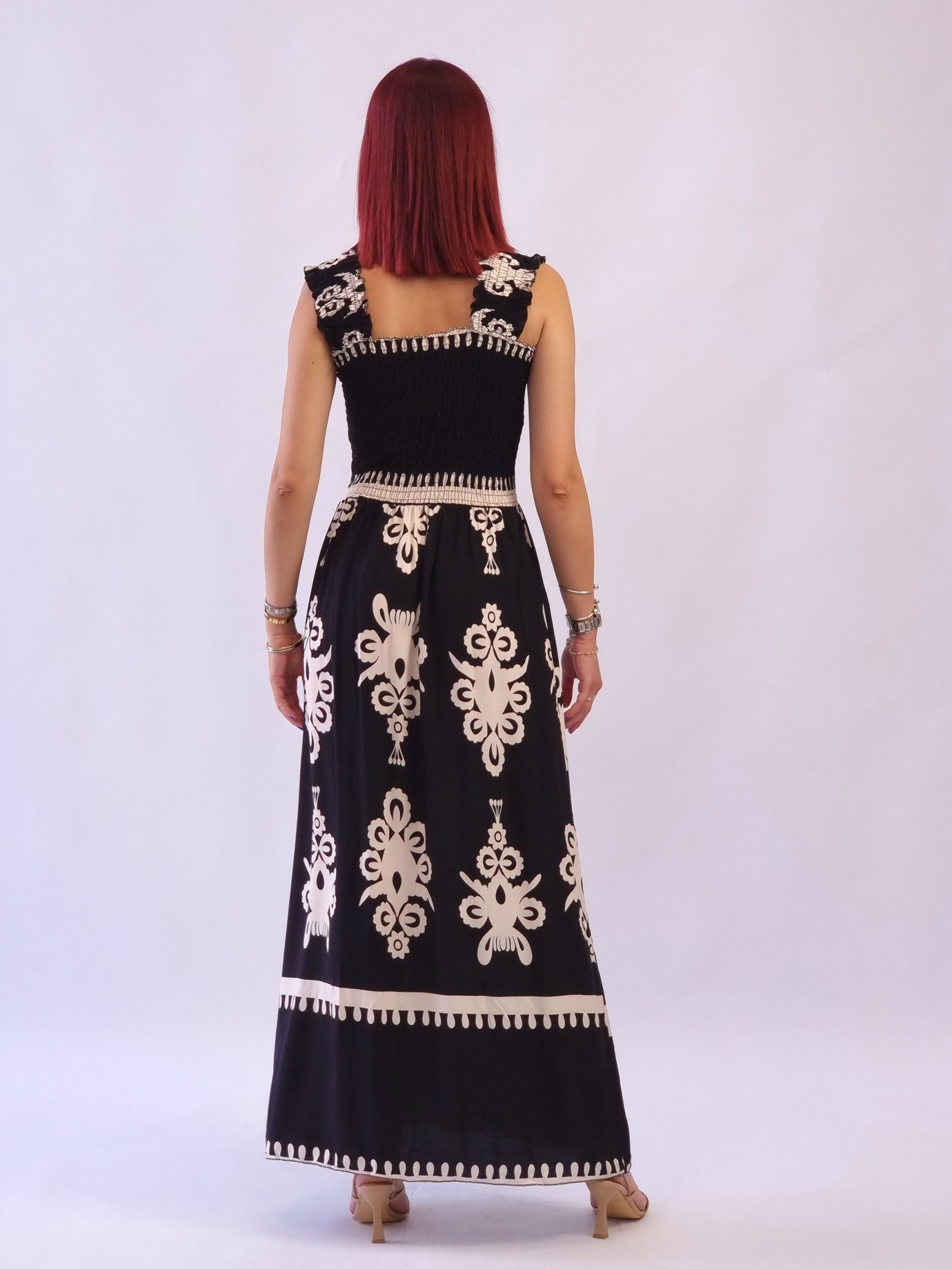 • Φόρεμα μάξι σφηκοφωλιά μαύρα μοτίβα-Μαύρο
