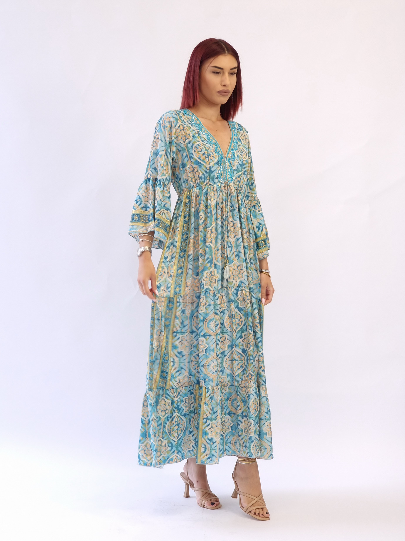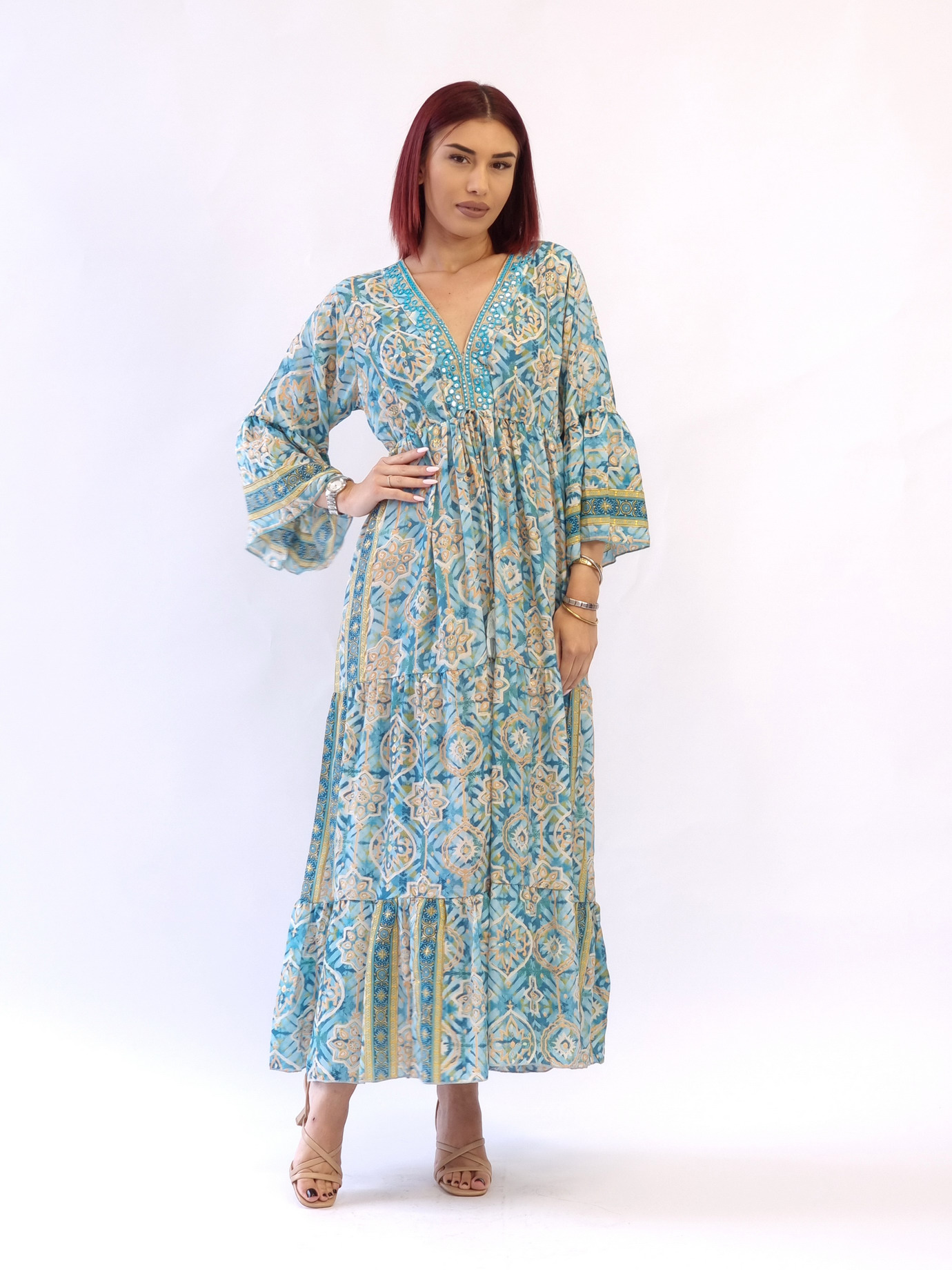 Φόρεμα μεταξωτό καμπάνα μανίκι-Μπλέ ανοιχτό