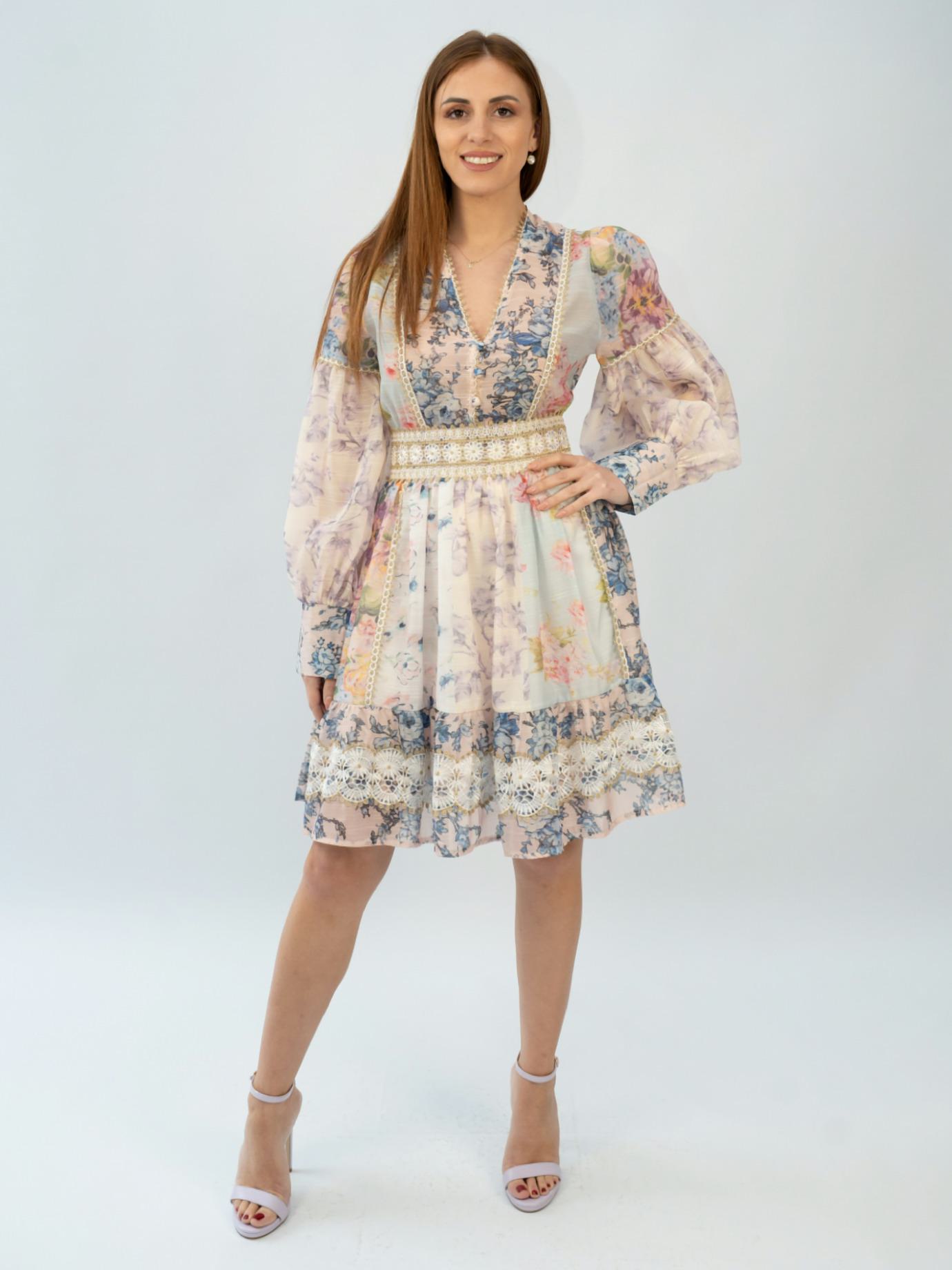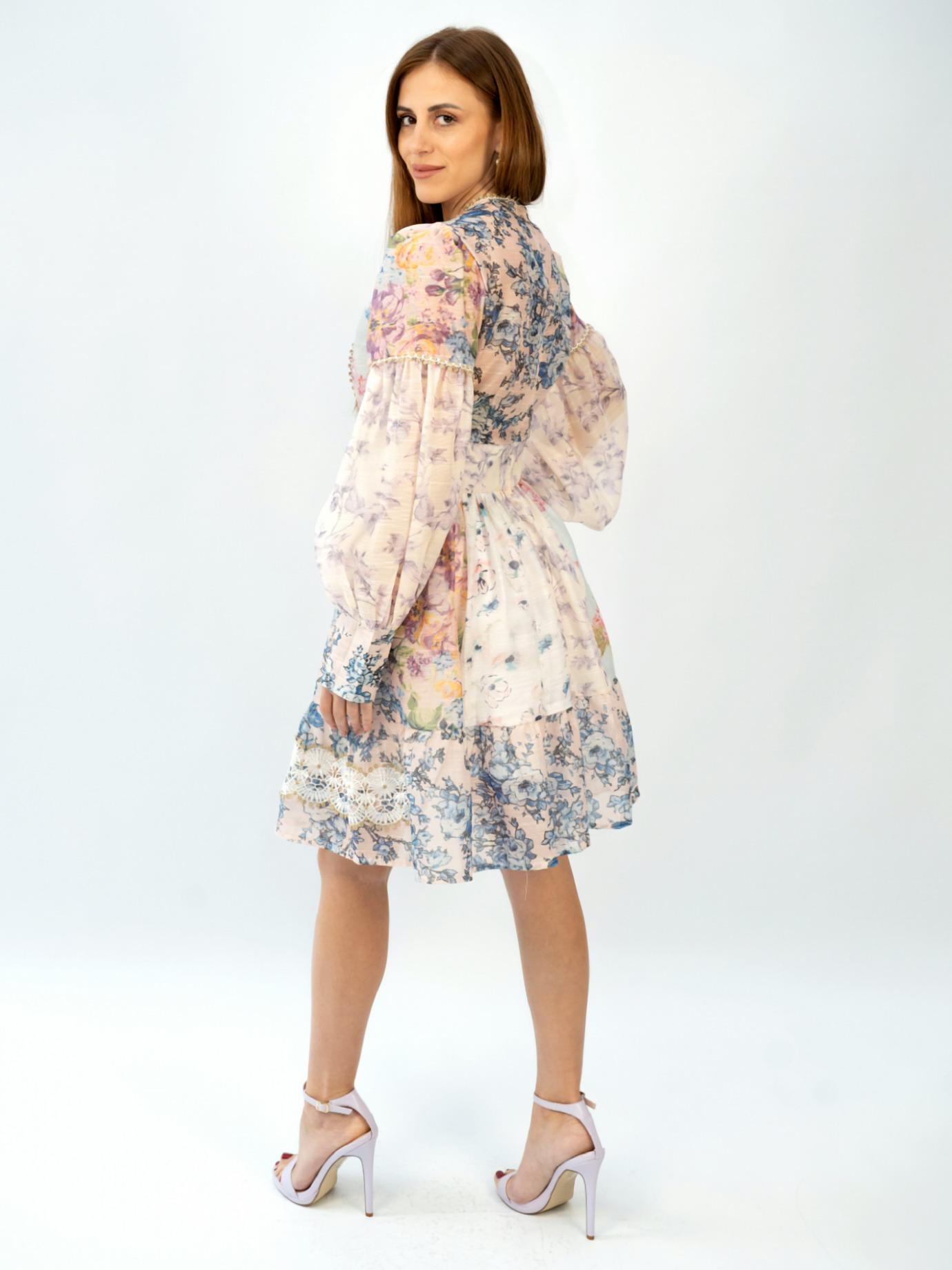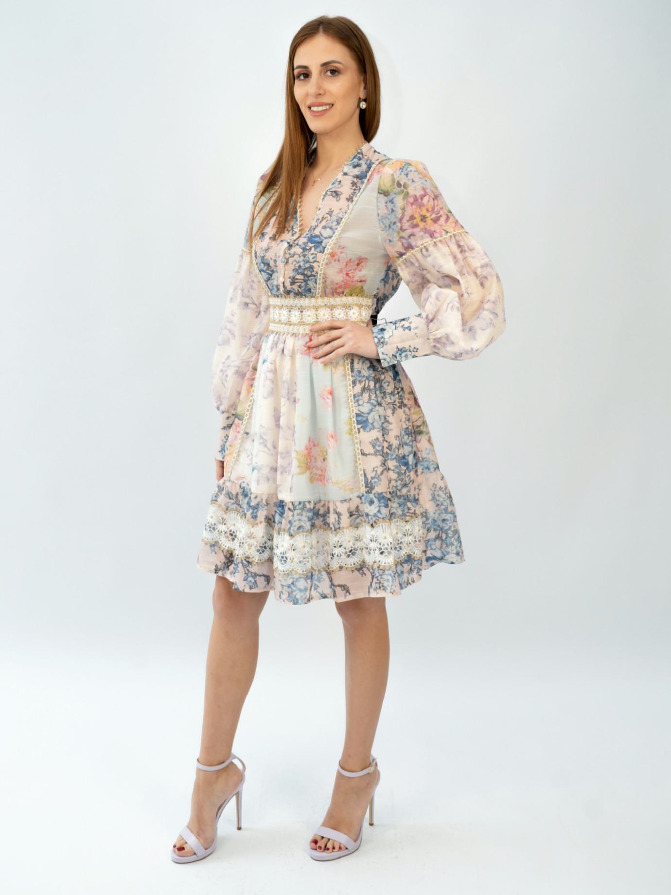Γυναικείο φόρεμα μίνι με υπέροχα παστέλ χρώματα και λεπτομέρειες απο δαντέλα Στο μπούστο έχει κουμπιά Τα μανίκια είναι μπαλού Στο πίσω μέρος έχει φερμουάρ Είναι φοδραρισμένο Σύνθεση προϊόντος: 80% visc, 20% cotton