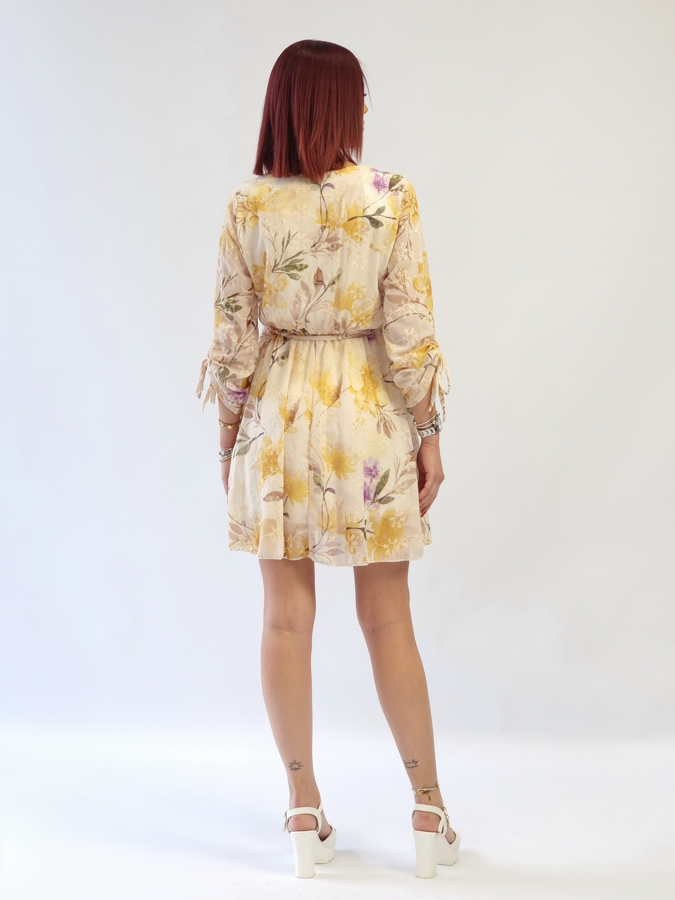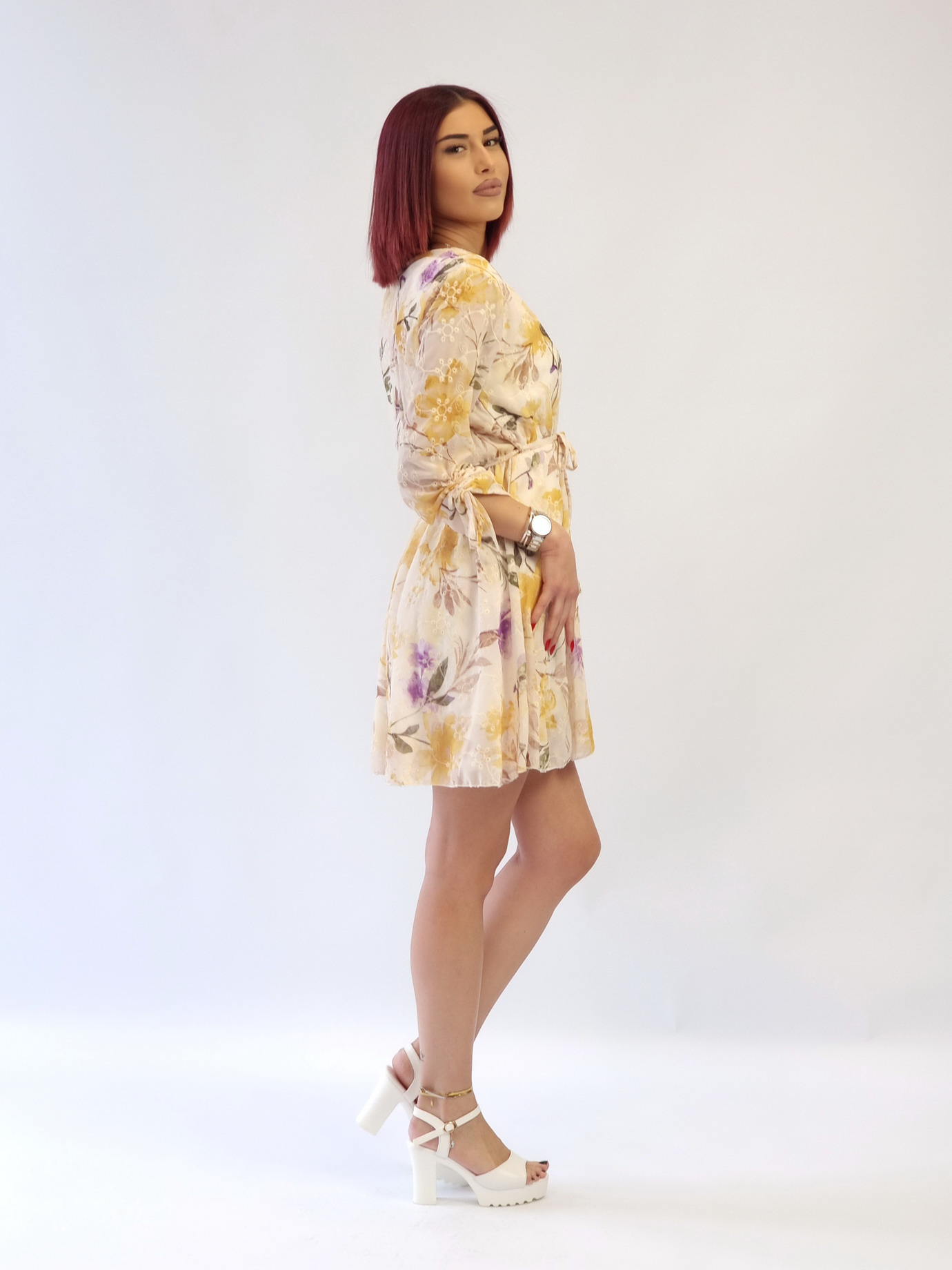 Γυναικείο φόρεμα κρουαζέ με κεντημένες λεπτομέρειες η βάση του είναι εκρού χρωμα και τα λουλούδια ειναι κίτρινα και λιλά Λάστιχο και ζωνάκι στη μέση Στα μανίκια έχει κορδόνι για να μαζέυουν Είναι φοδραρισμένο Σύνθεση προϊόντος: 100% pol, 95% visc, 5% elast