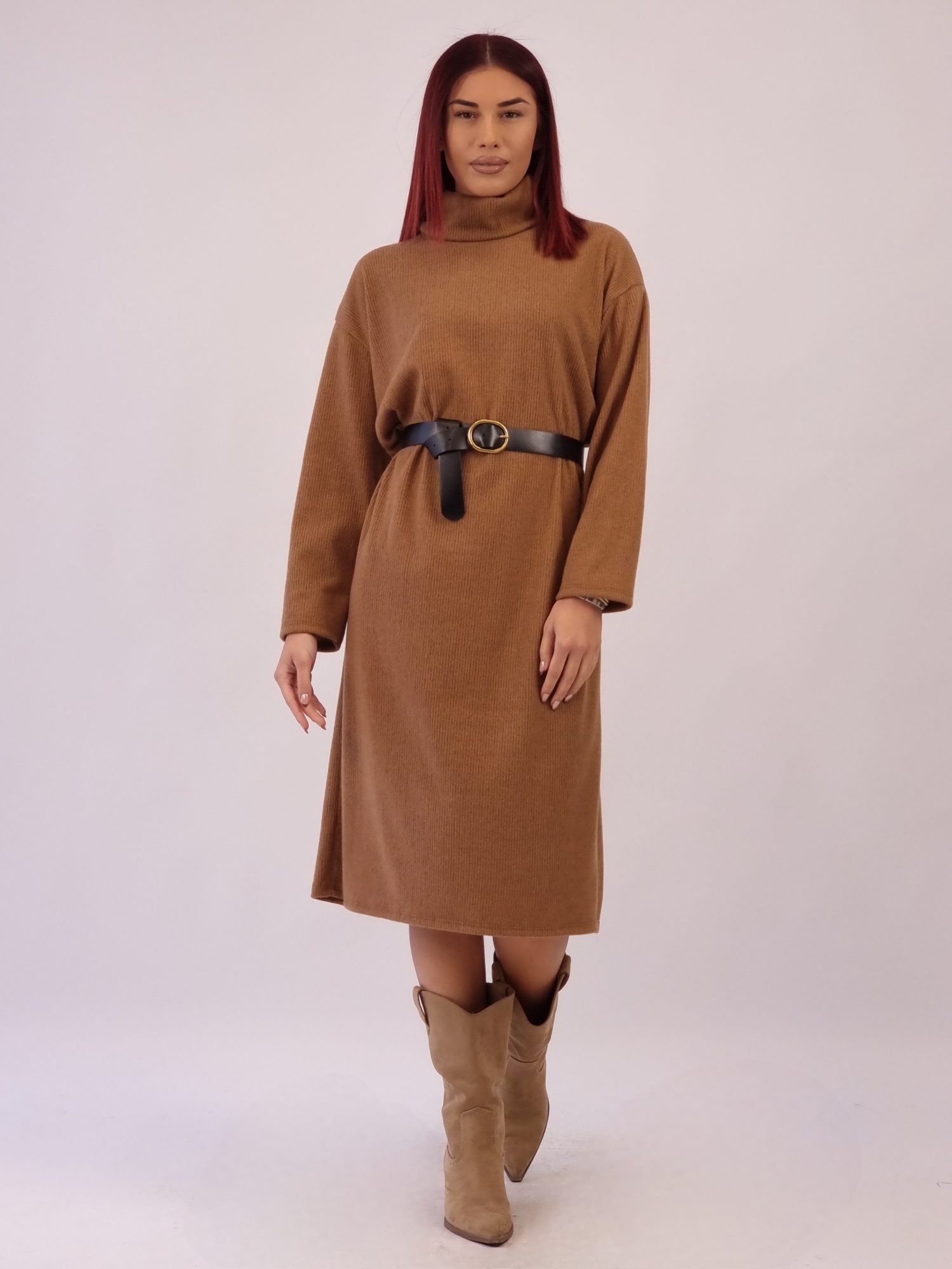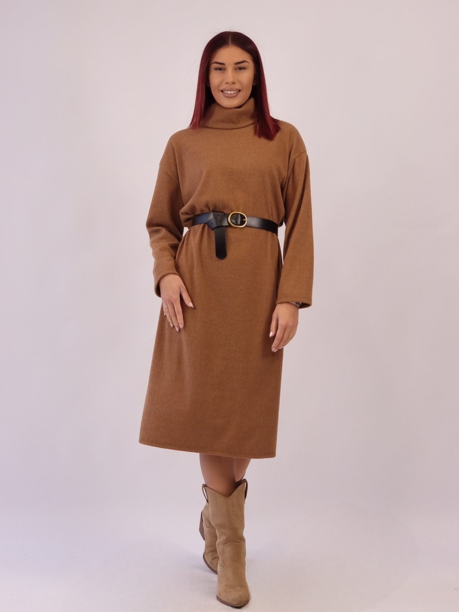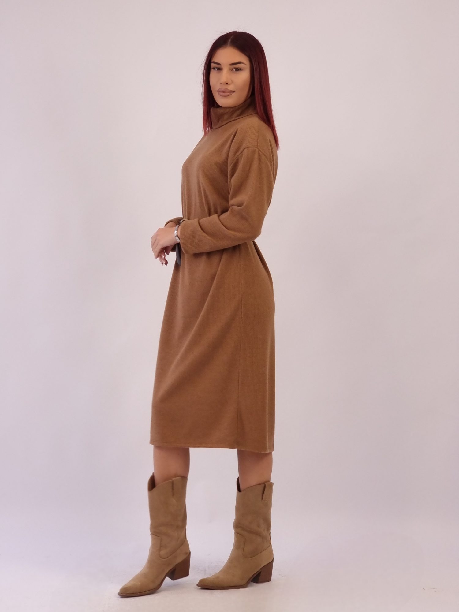 Ζεστό, μαλακό και άψογα θηλυκό — το φόρεμα σε ταμπά απόχρωση είναι η επιτομή της κομψής άνεσης, θα γίνει το αγαπημένο σου κομμάτι για κάθε μέρα.