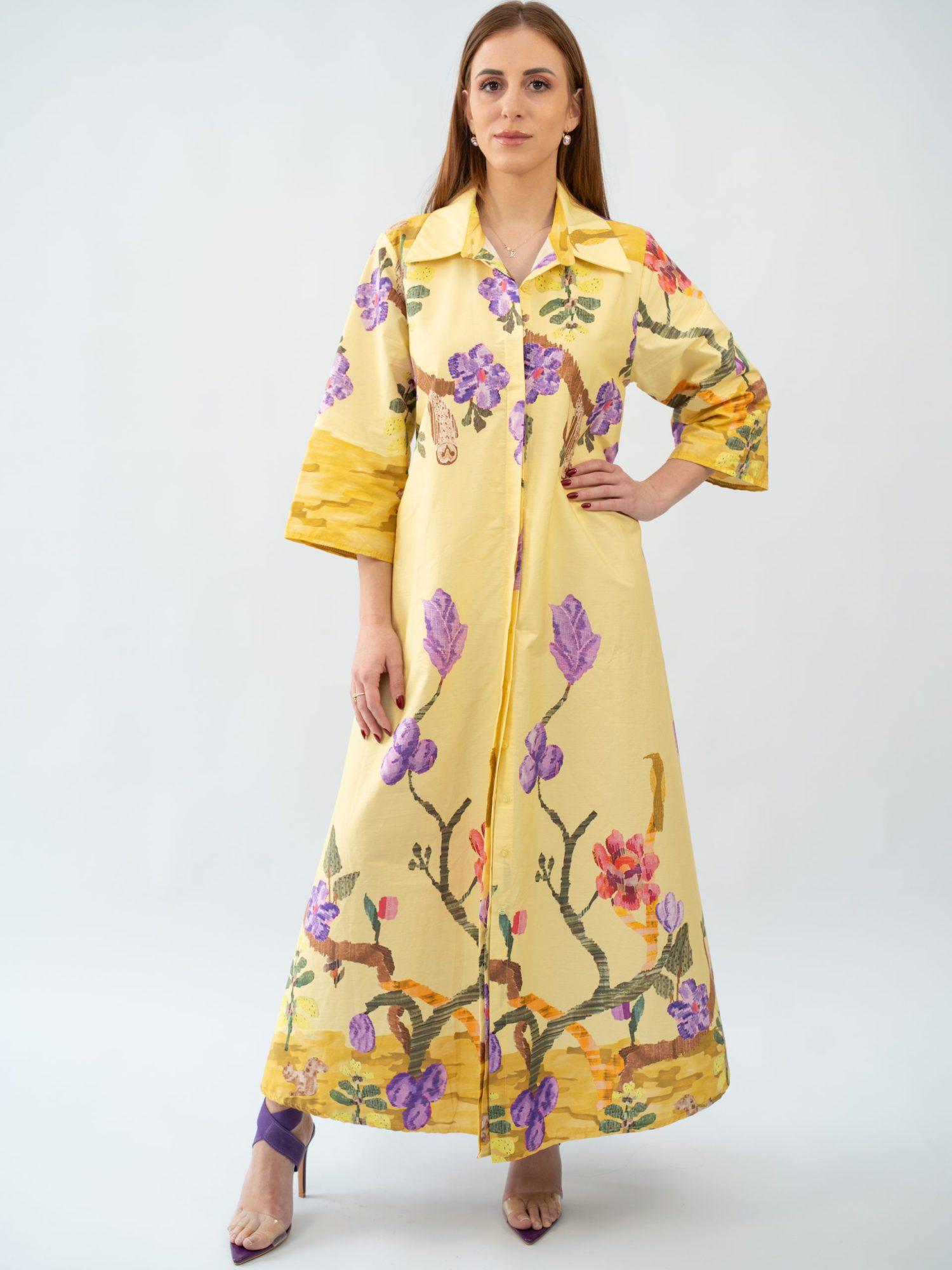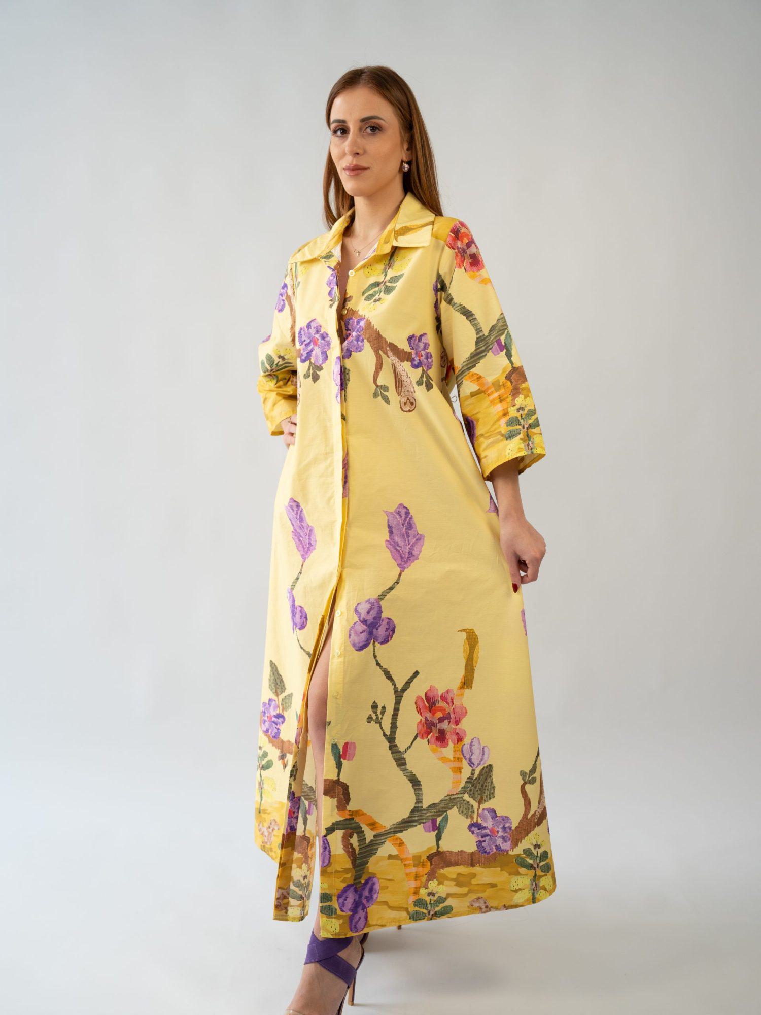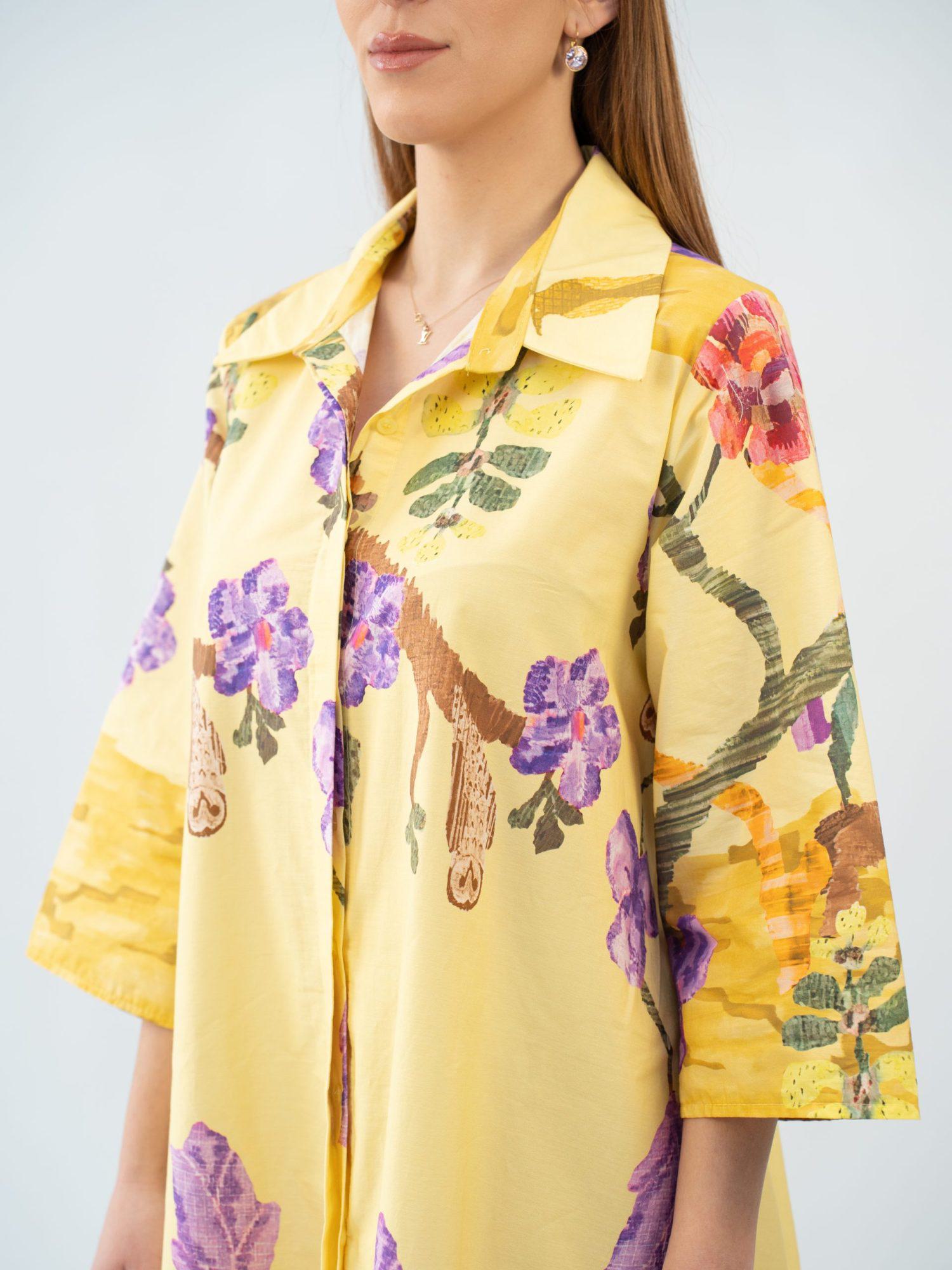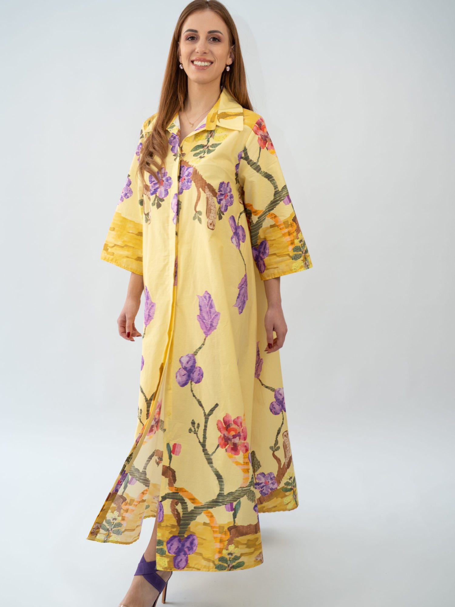 Κίτρινο γυναικείο φόρεμα βαμβακερό φλοράλ Έχει κουμπιά κατα μήκος με πατιλέτα 3/4 μακίκια καμπάνα Σύνθεση προϊόντος: 100% cotton