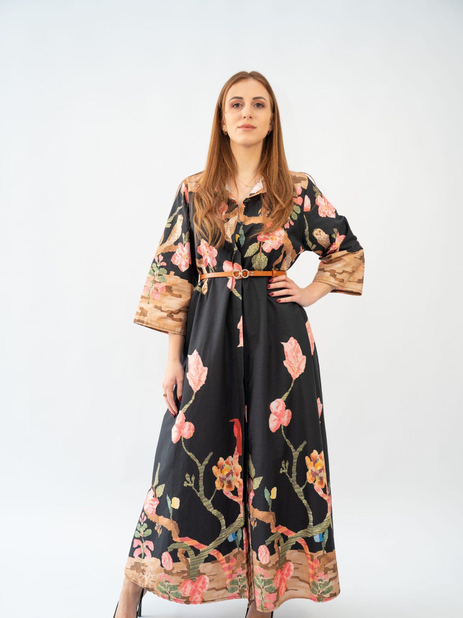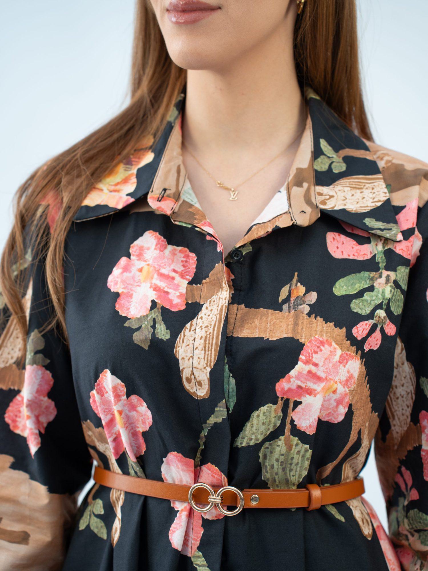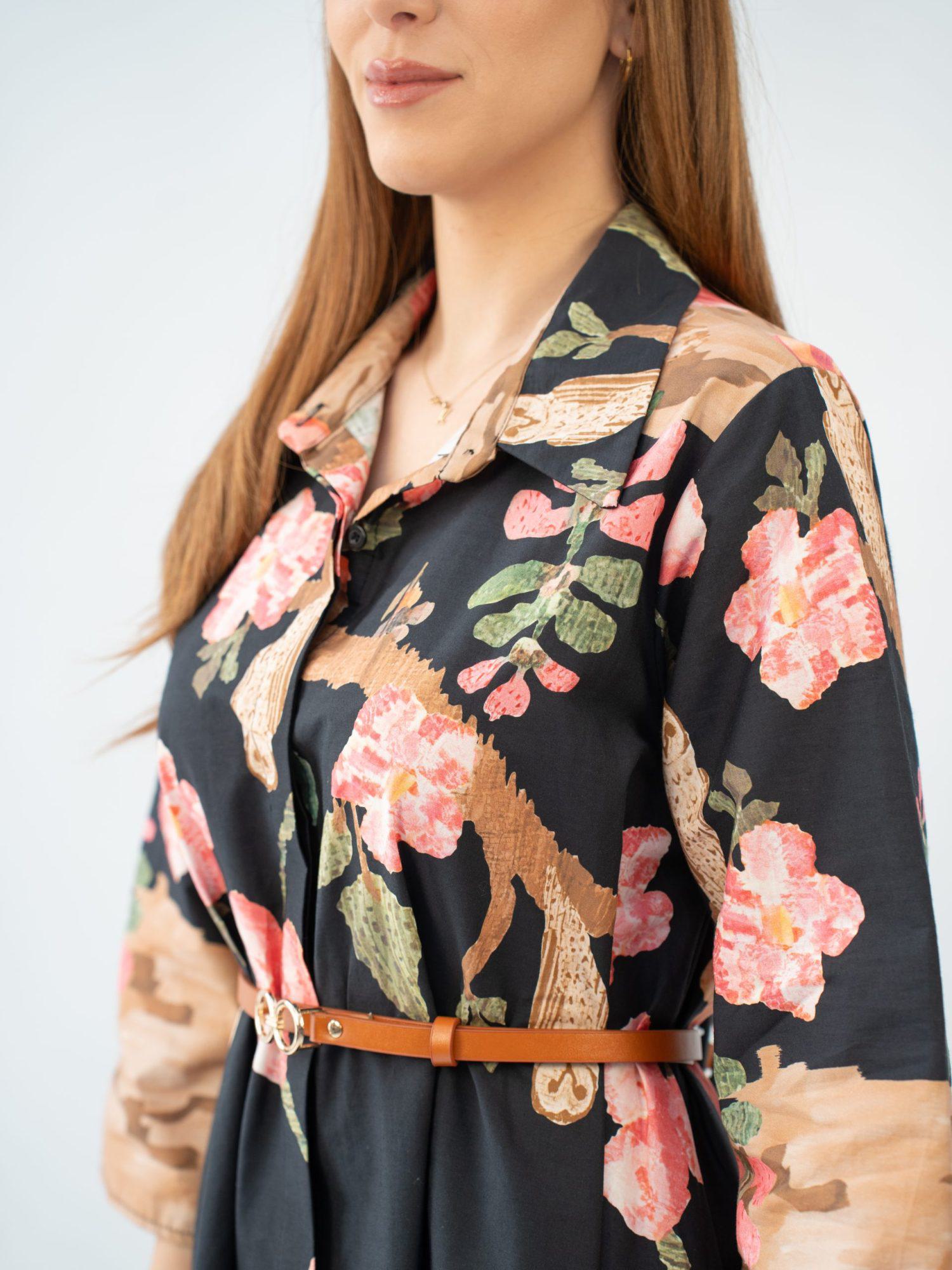 Μαύρο γυναικείο φόρεμα βαμβακερό φλοράλ Έχει κουμπιά κατα μήκος με πατιλέτα 3/4 μακίκια καμπάνα Σύνθεση προϊόντος: 100% cotton