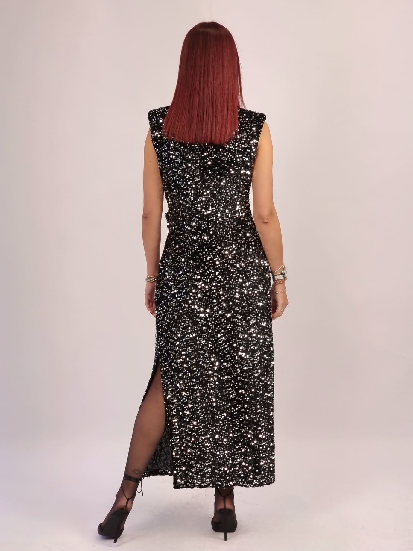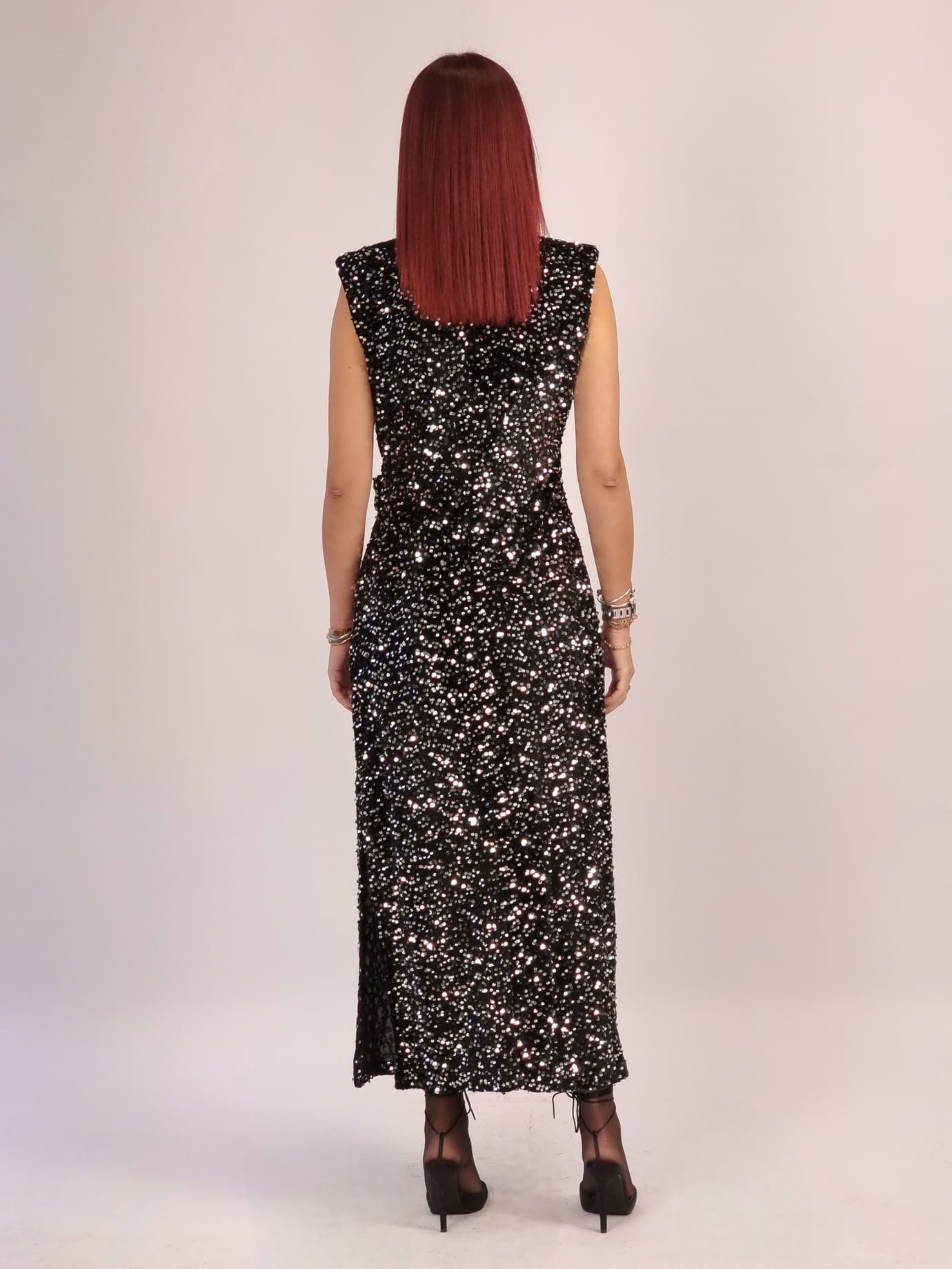 Λαμπερό φόρεμα από βελούδο με παγιέτες, σε κανονική γραμμή που χαρίζει εντυπωσιακό αποτέλεσμα χωρίς κόπο. Το άνοιγμα στο πλάι και οι βάτες στους ώμους δημιουργούν καθαρές γραμμές και chic attitude.