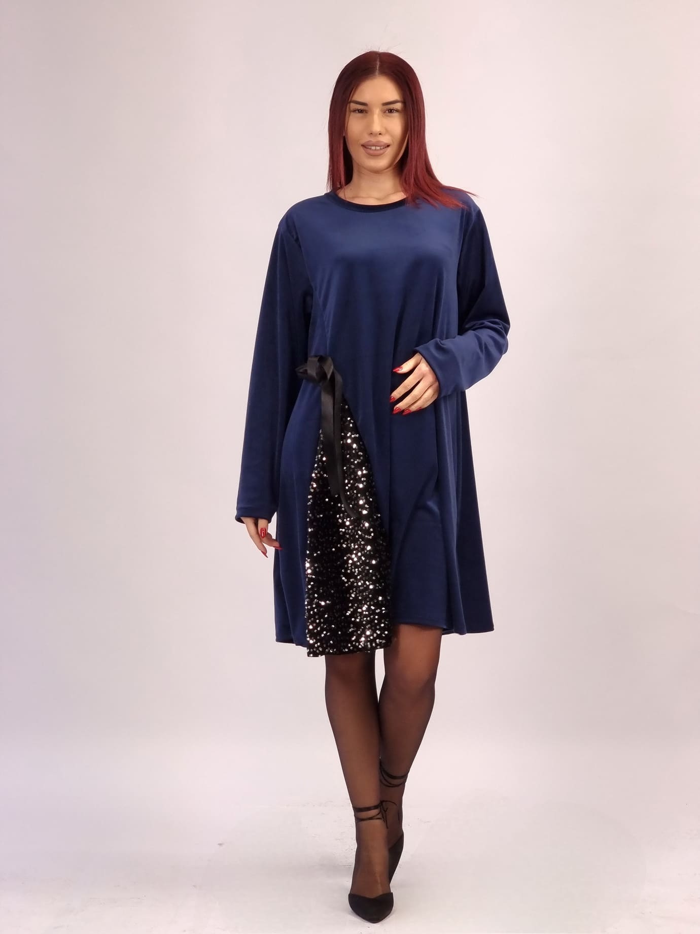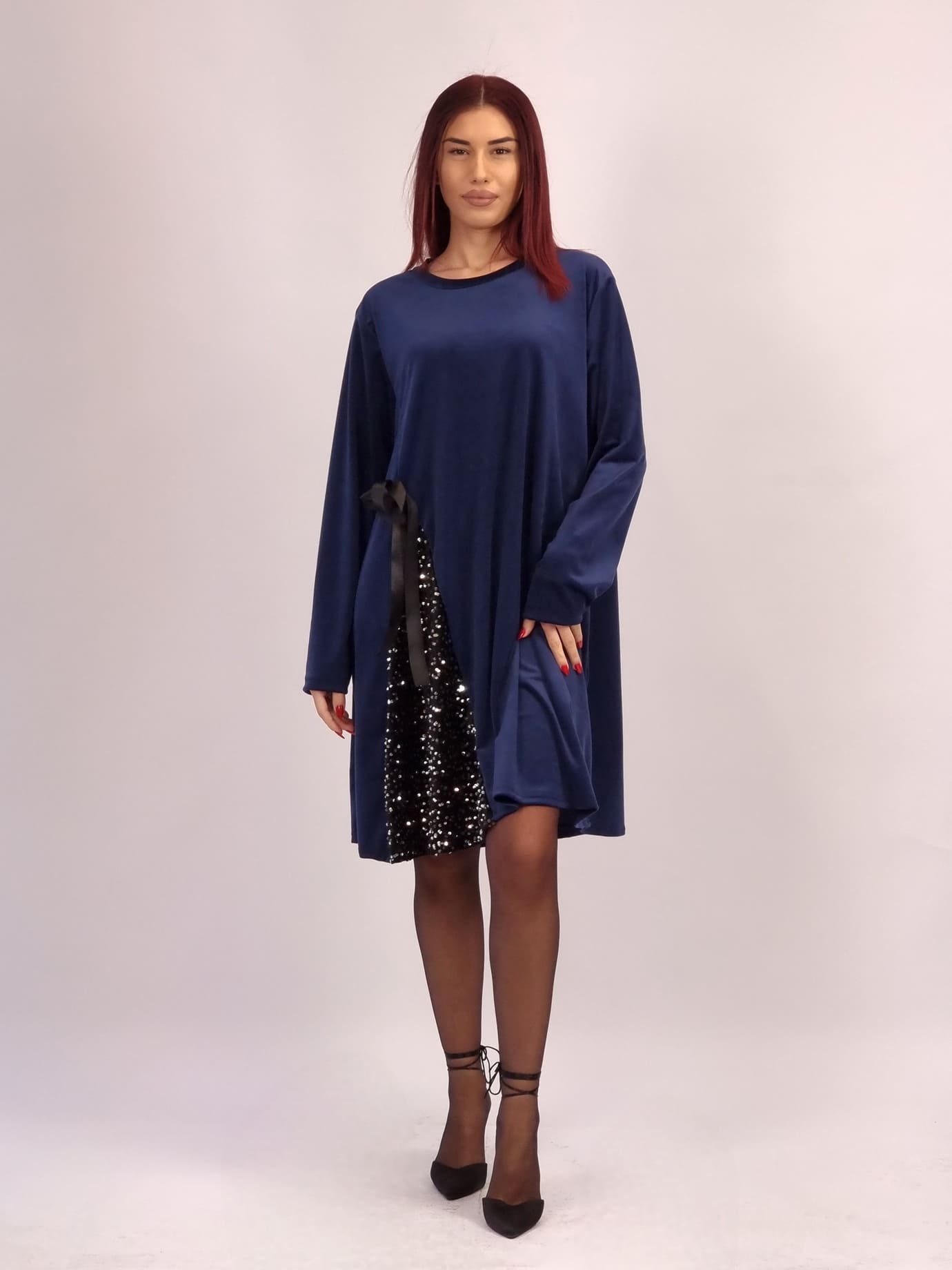 Oversized βελουτέ φόρεμα με εντυπωσιακό κομμάτι παγιέτας στο πλάι και διακοσμητική κορδέλα. Απαλή υφή, άνετη εφαρμογή και glam πινελιά που δεν περνάει απαρατήρητη.