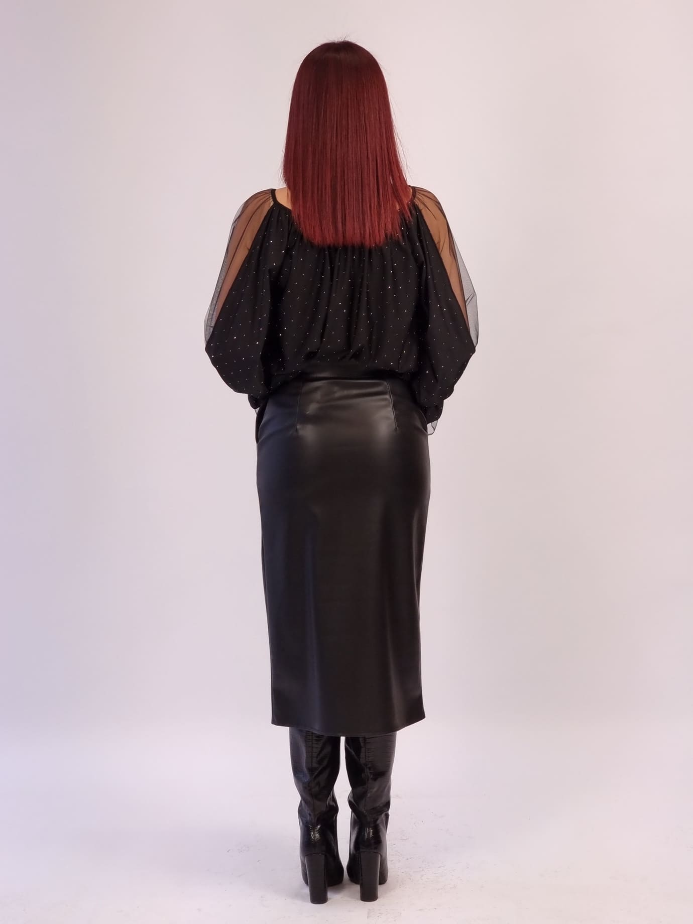 Μαύρη δερματίνη φούστα σε midi γραμμή, με σκίσιμο μπροστά για elegant αλλά και δυναμική εμφάνιση. Κανονική εφαρμογή, μαλακή υφή και εύκολος συνδυασμός από πρωί μέχρι βράδυ.