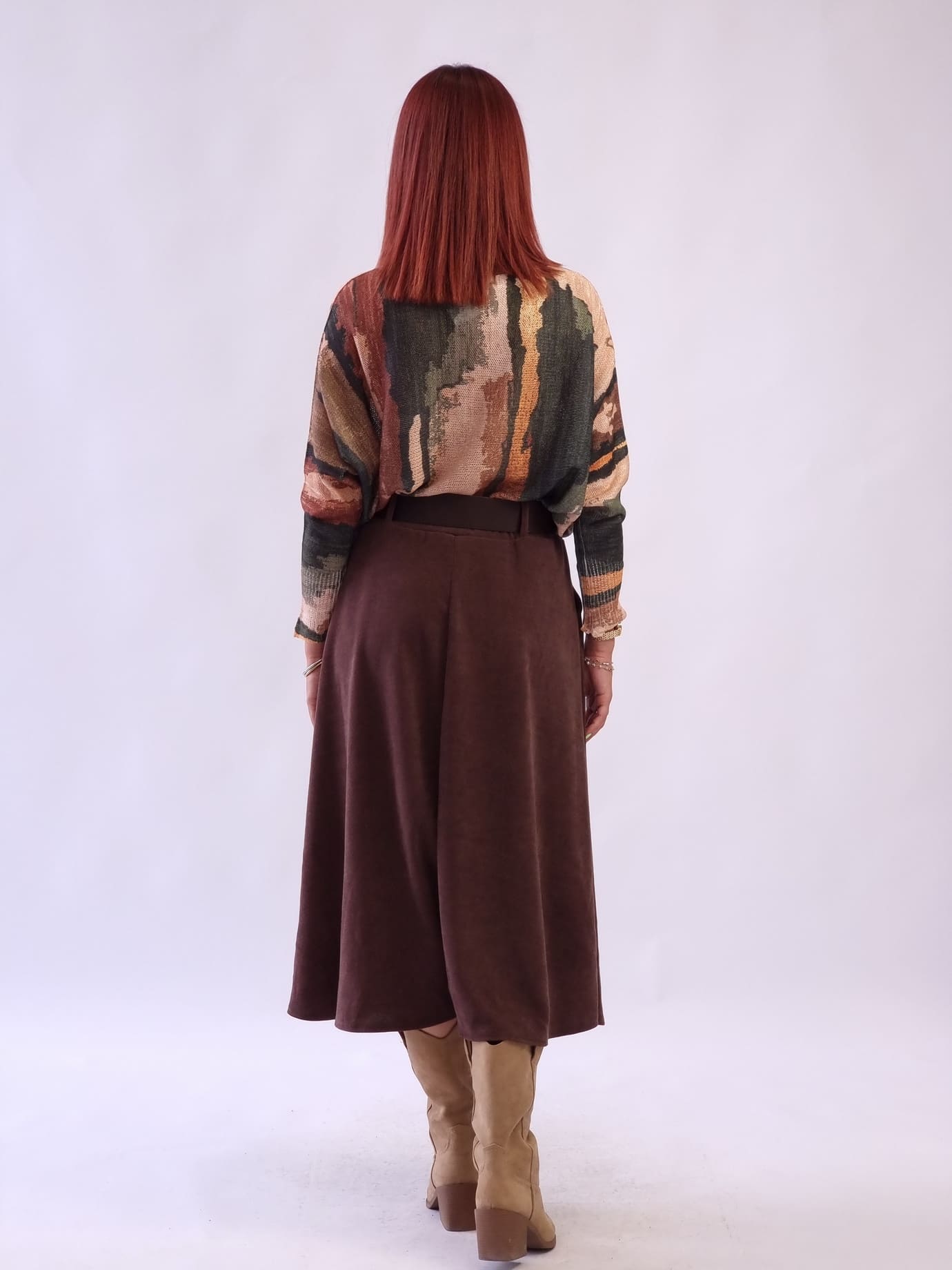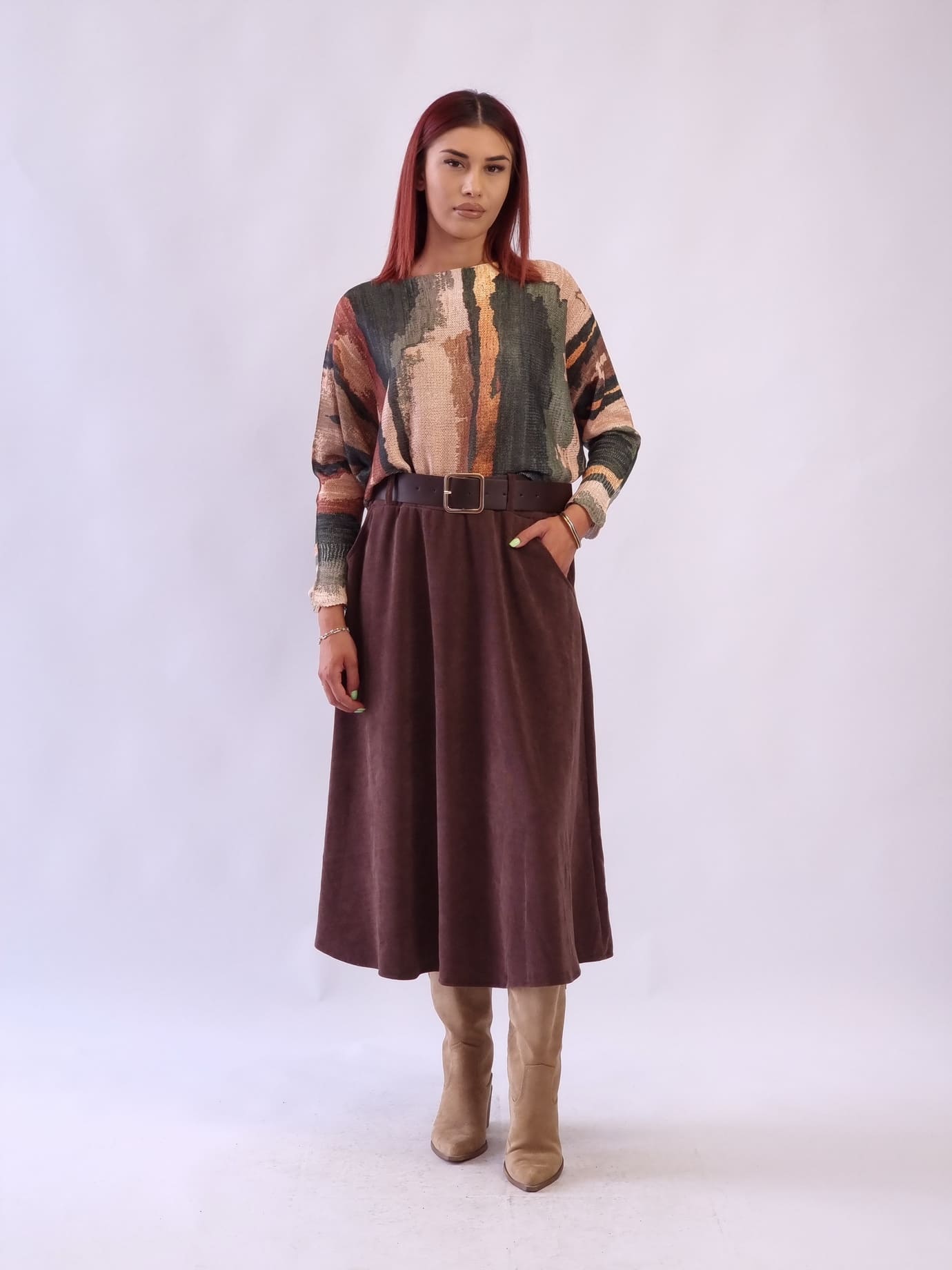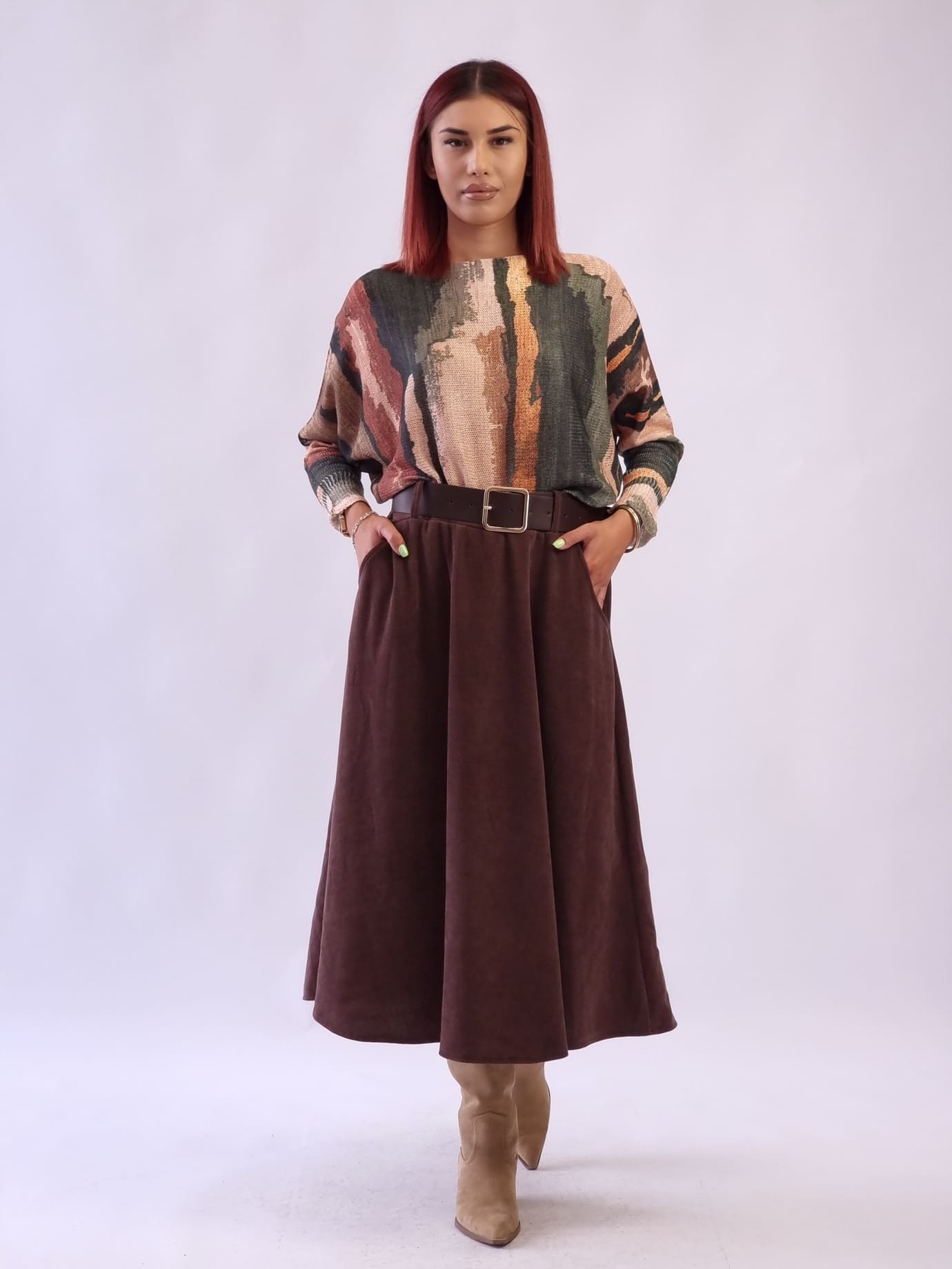 Γυναικεία μίντι φούστα με λάστιχο και ζώνη Καφέ