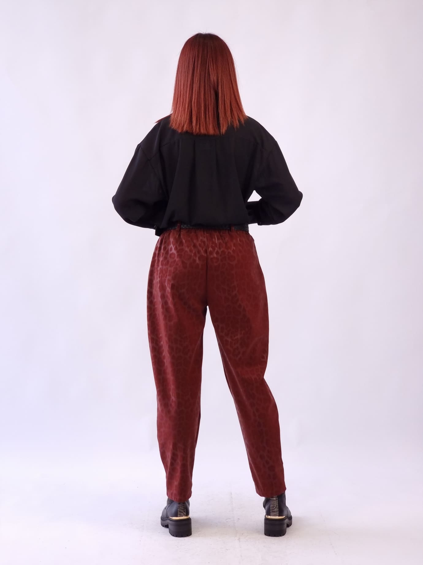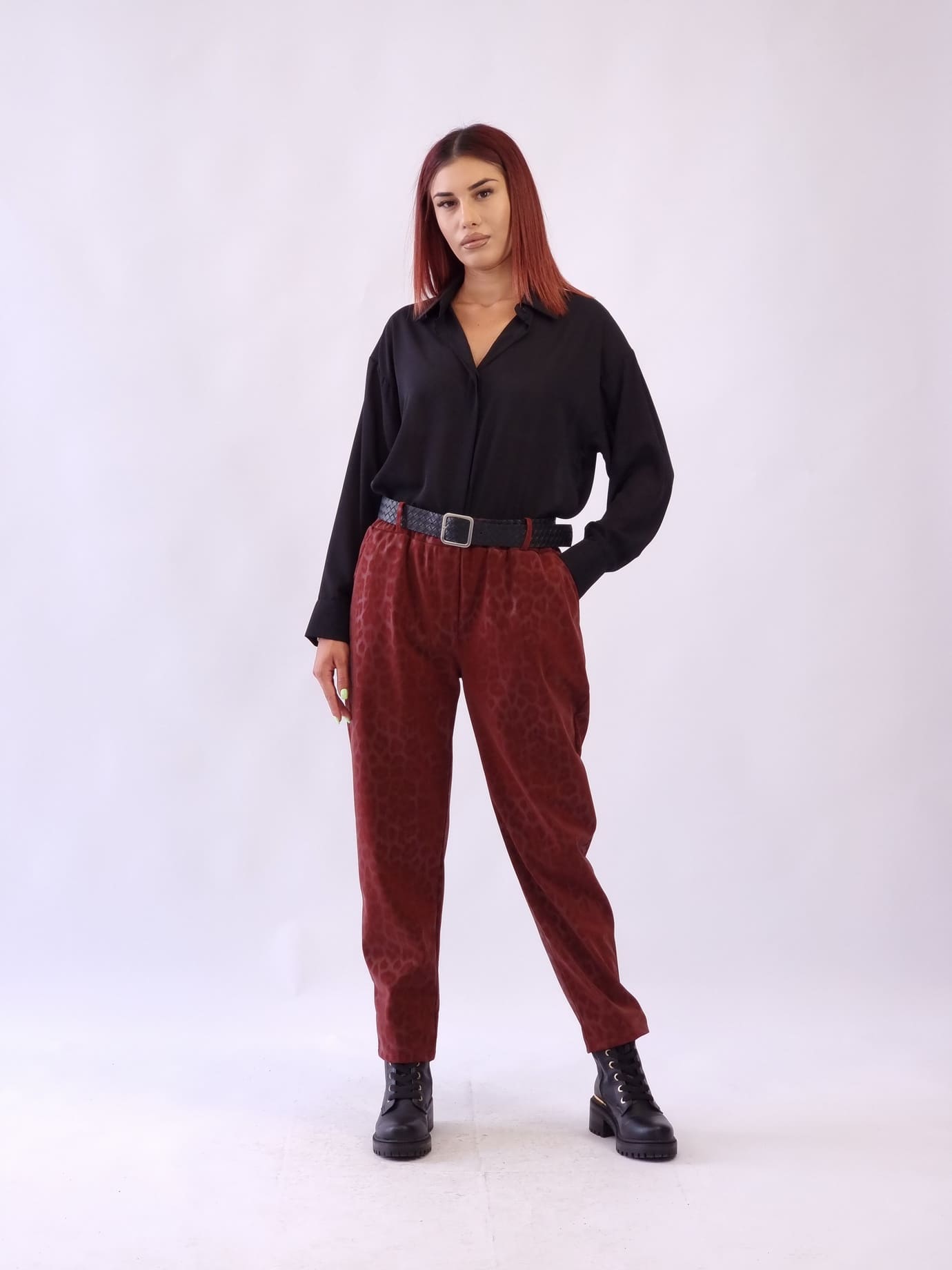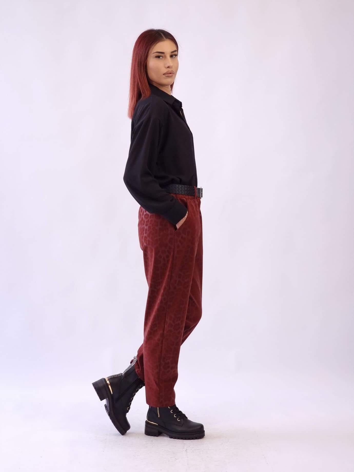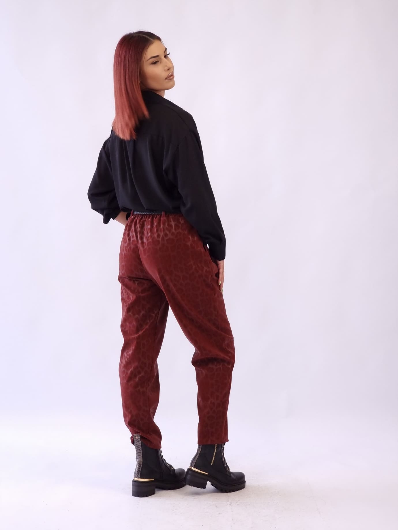 • Γυναικείο παντελόνι δερματίνη με εφέ λεοπάρ Μπορντό