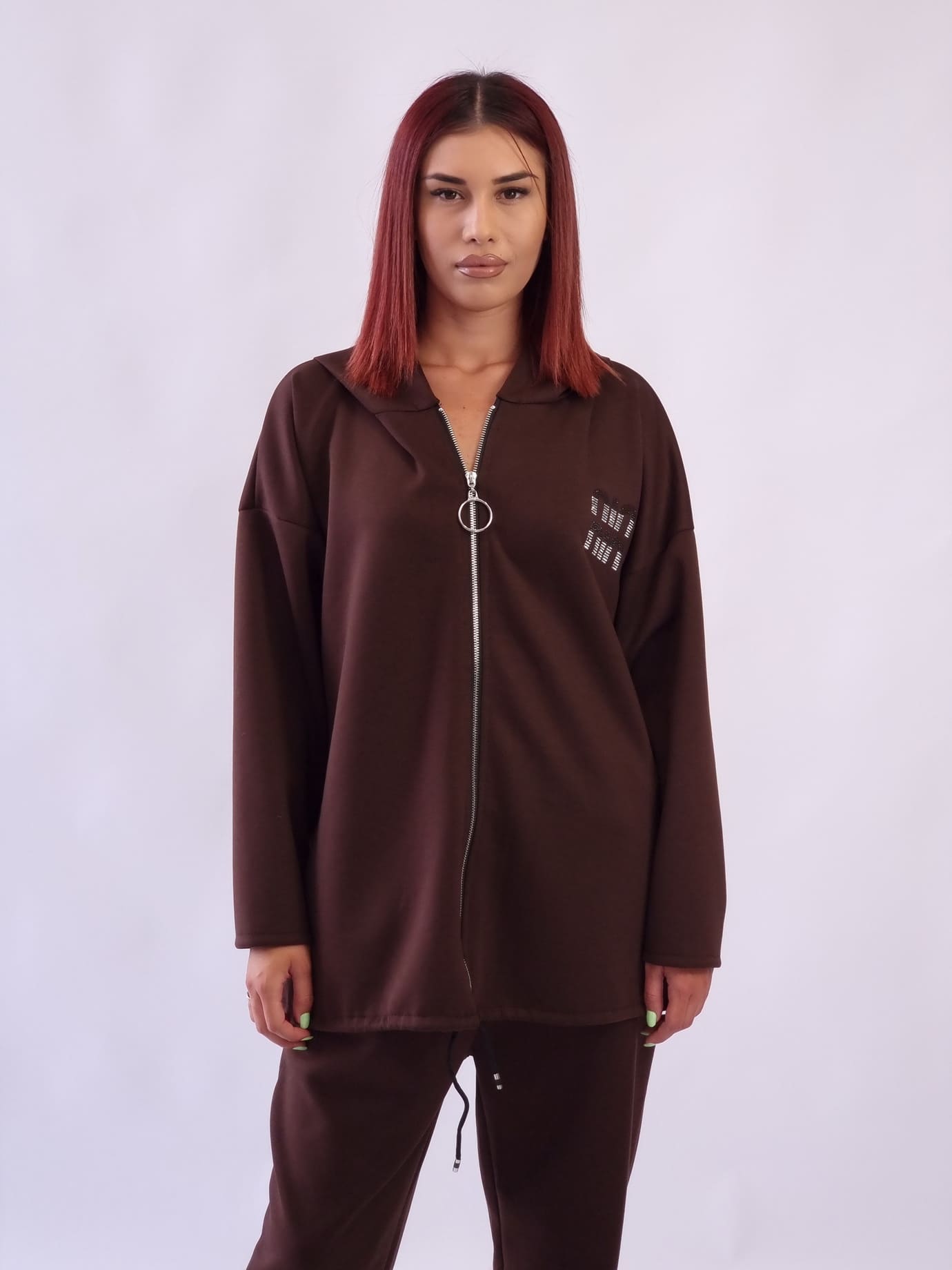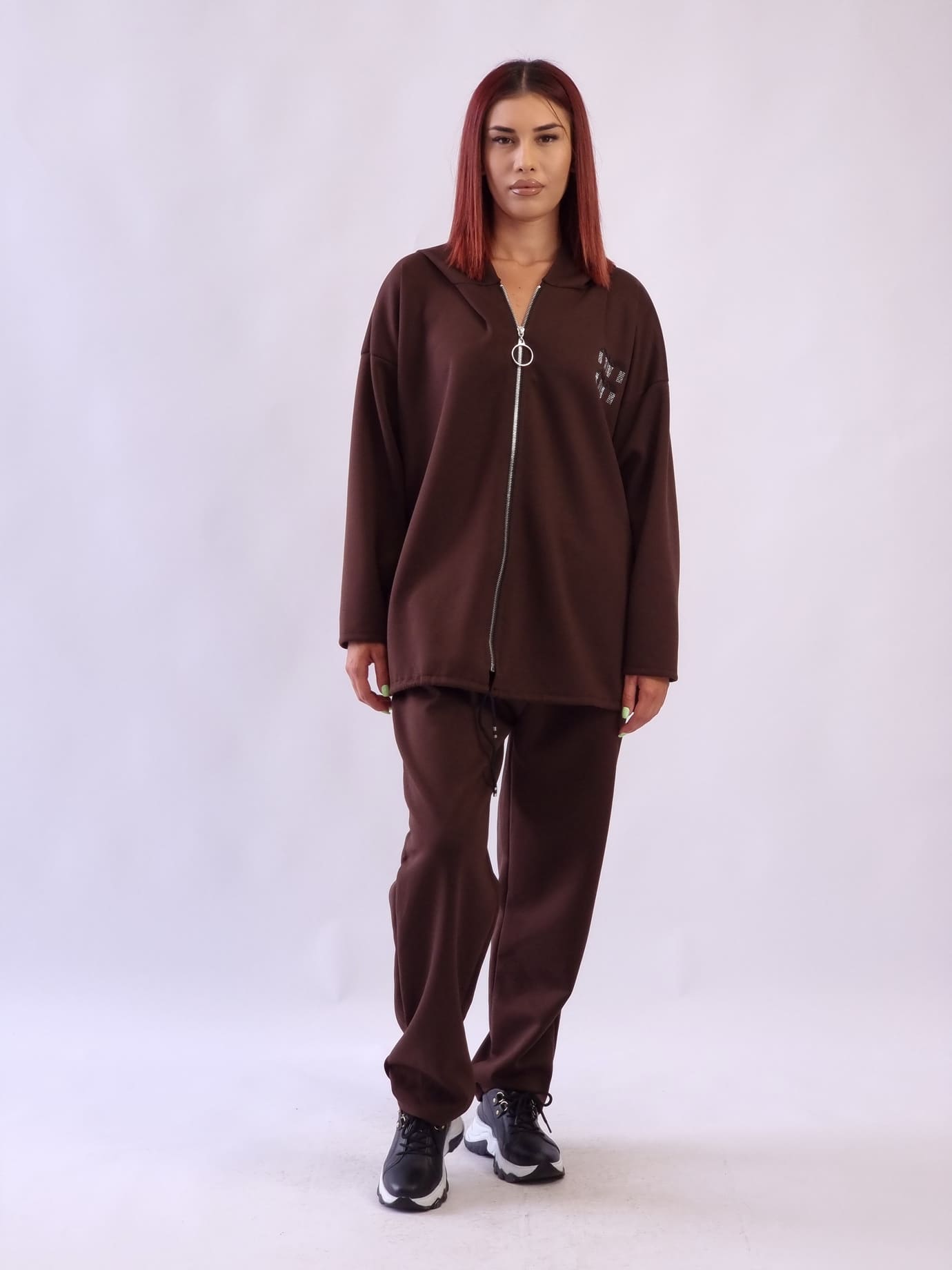 Γυναικείο σετ ζακέτα με κουκούλα παντελόνι Καφέ