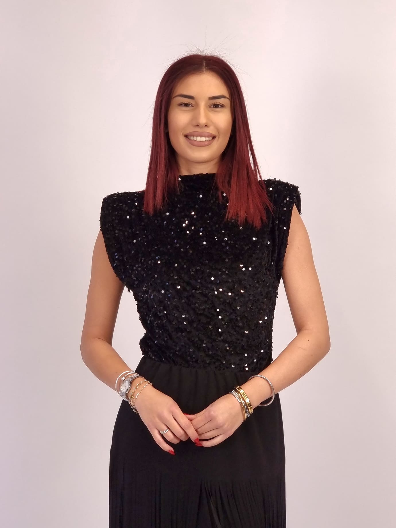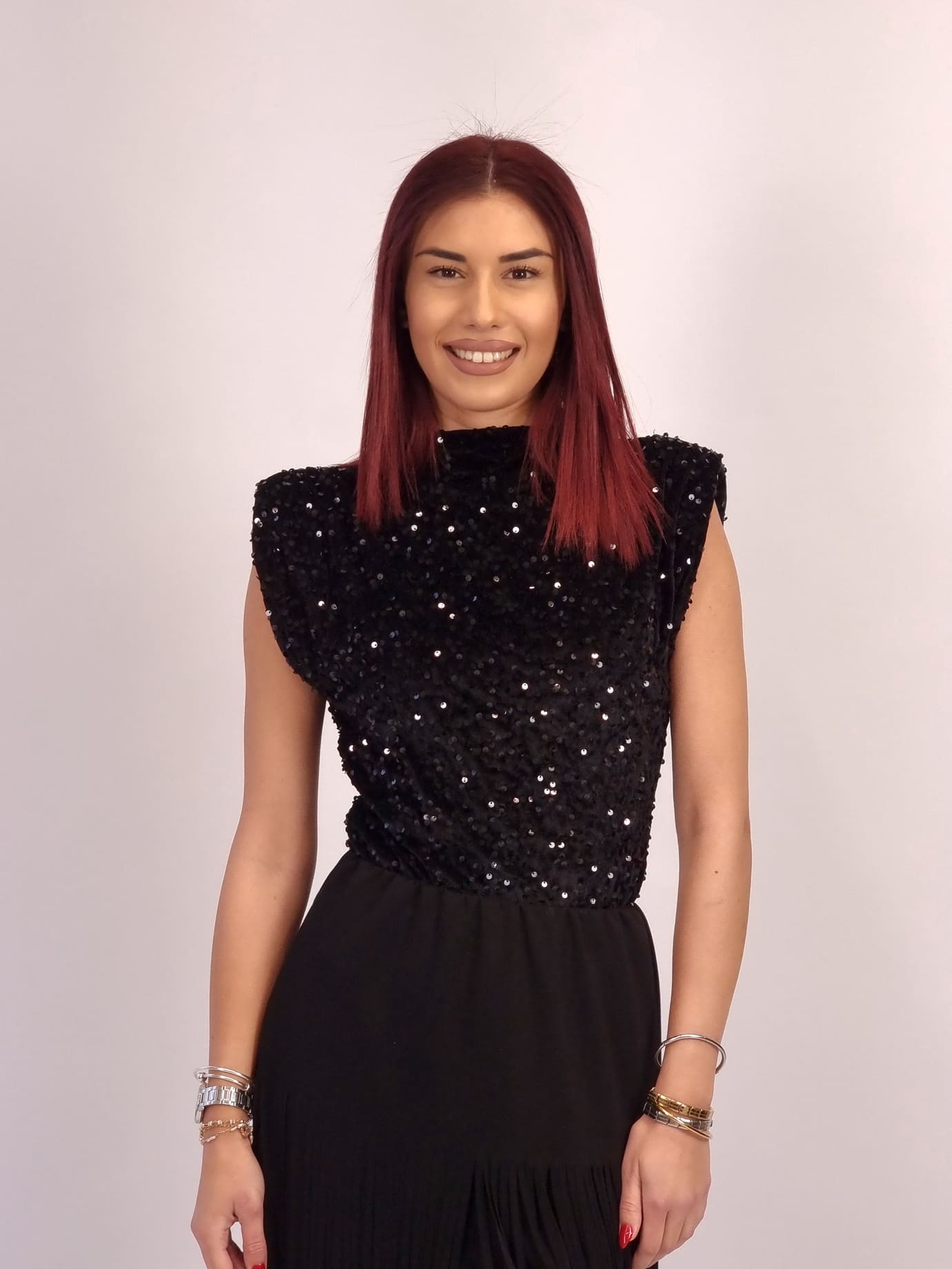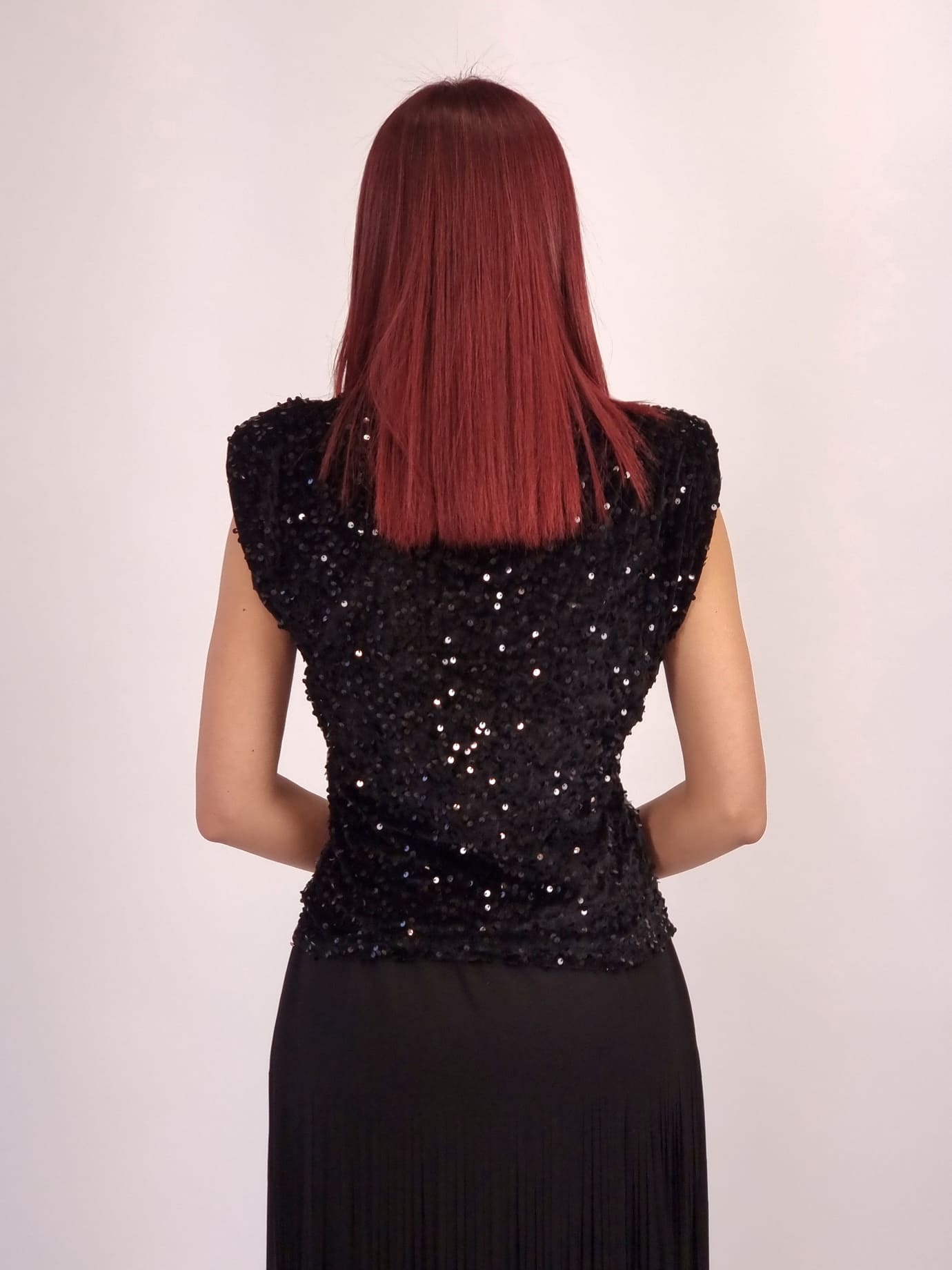 Εντυπωσιακό top από βελούδο με πυκνή παγιέτα, σε γραμμή που αγκαλιάζει όμορφα το σώμα και δίνει premium glam χωρίς υπερβολές. Μαλακή υφή, σταθερή εφαρμογή και ιδανικό για all–glam εμφανίσεις.