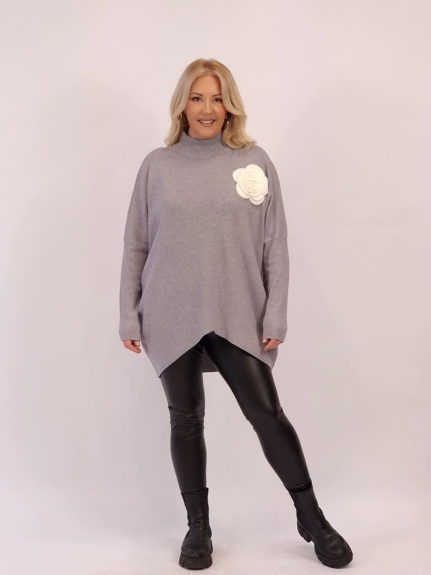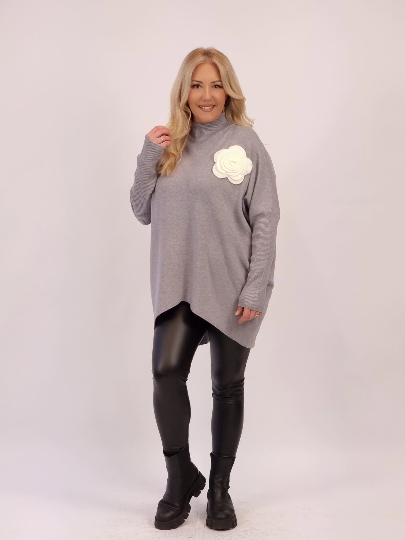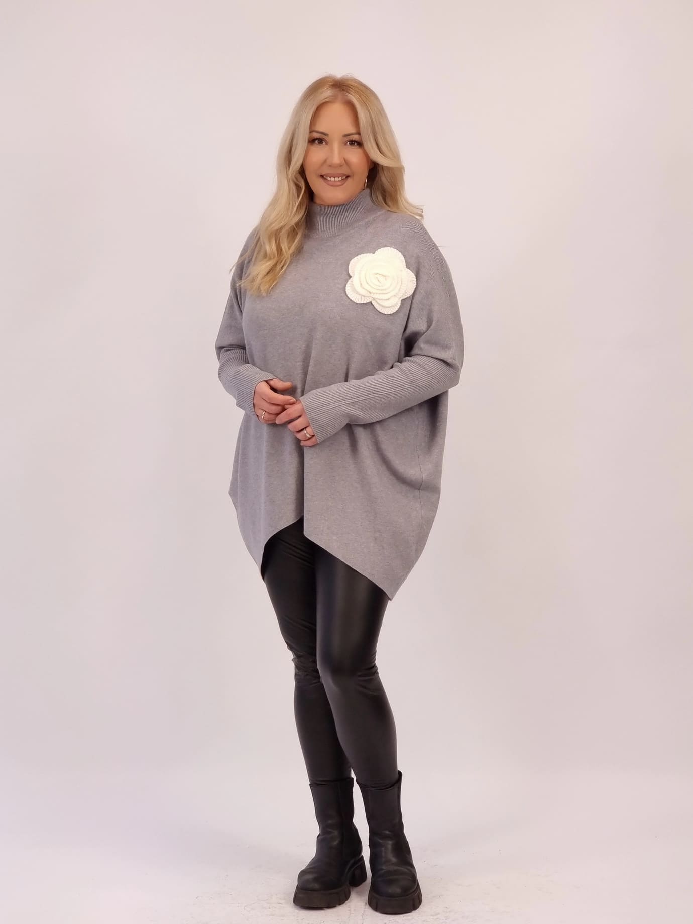 Oversize νήματινη μπλούζα με απαλή υφή και χαλαρή εφαρμογή που δεν πιέζει. Διαθέτει διακοσμητικό λουλούδι στο επάνω μέρος για κομψή, θηλυκή πινελιά. Άνετη, ζεστή και εύκολη στο styling για all-day εμφανίσεις.