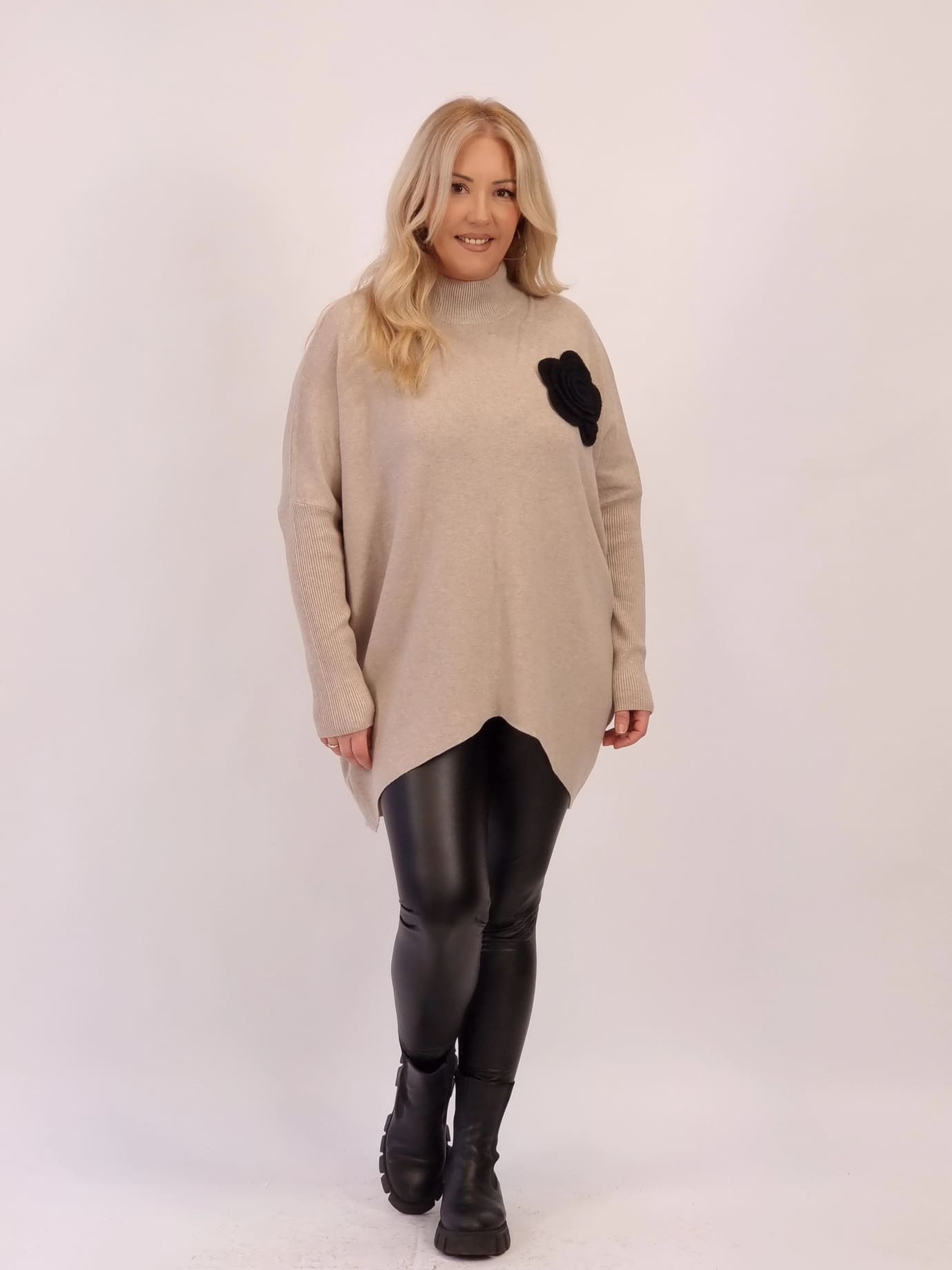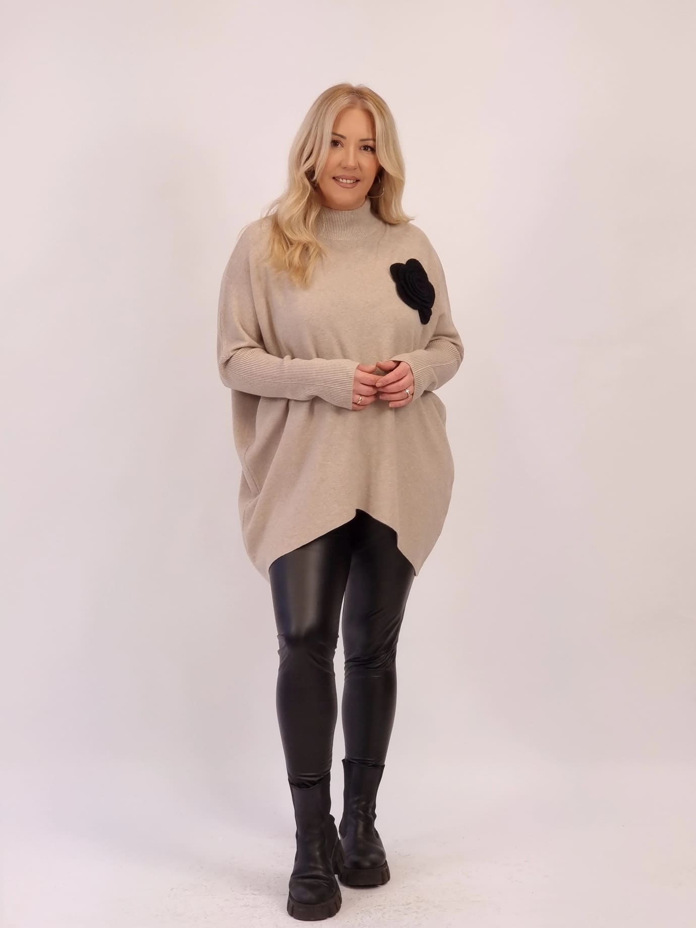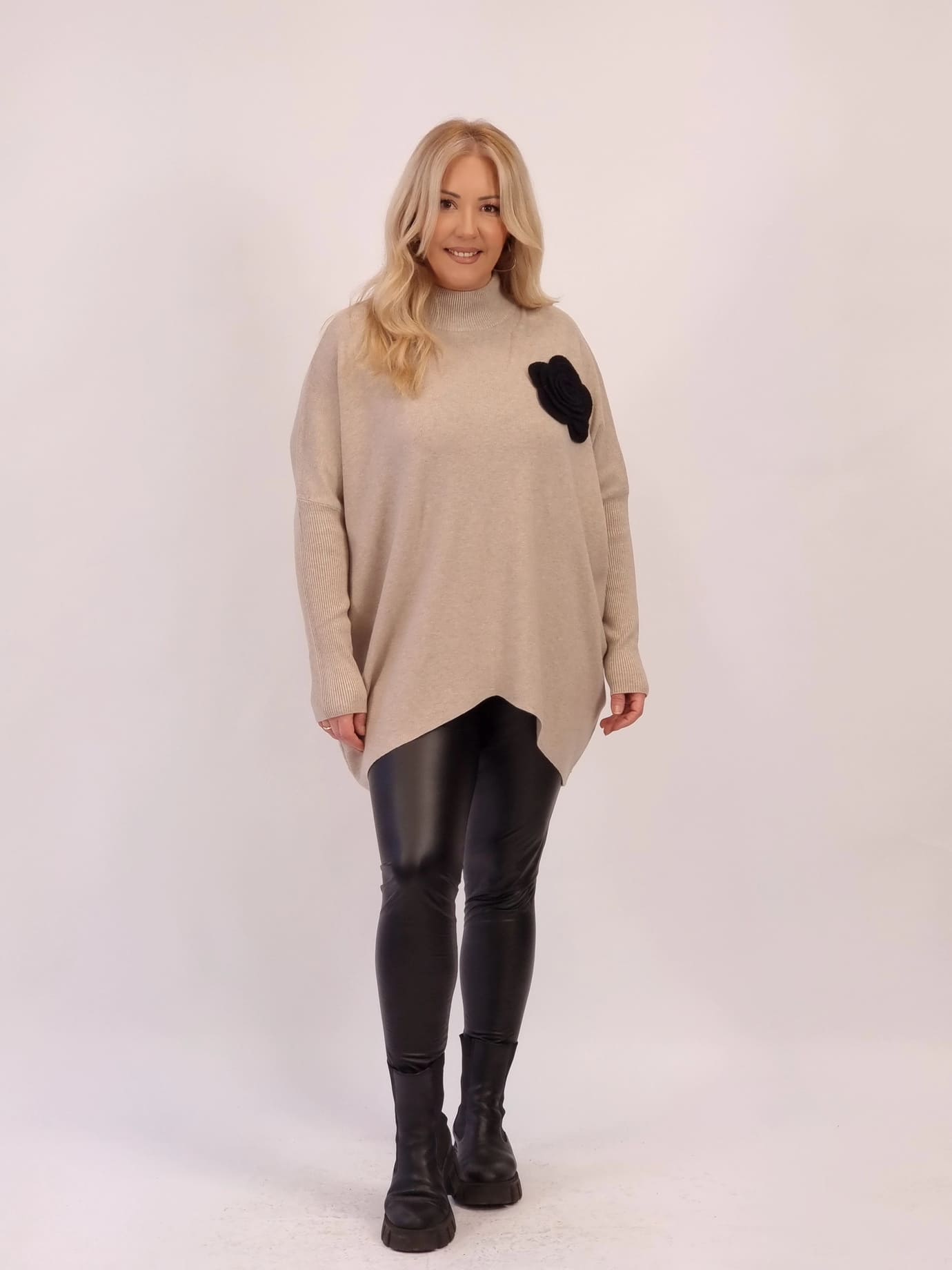 Oversize νήματινη μπλούζα με απαλή υφή και χαλαρή εφαρμογή που δεν πιέζει. Διαθέτει διακοσμητικό λουλούδι στο επάνω μέρος για κομψή, θηλυκή πινελιά. Άνετη, ζεστή και εύκολη στο styling για all-day εμφανίσεις.