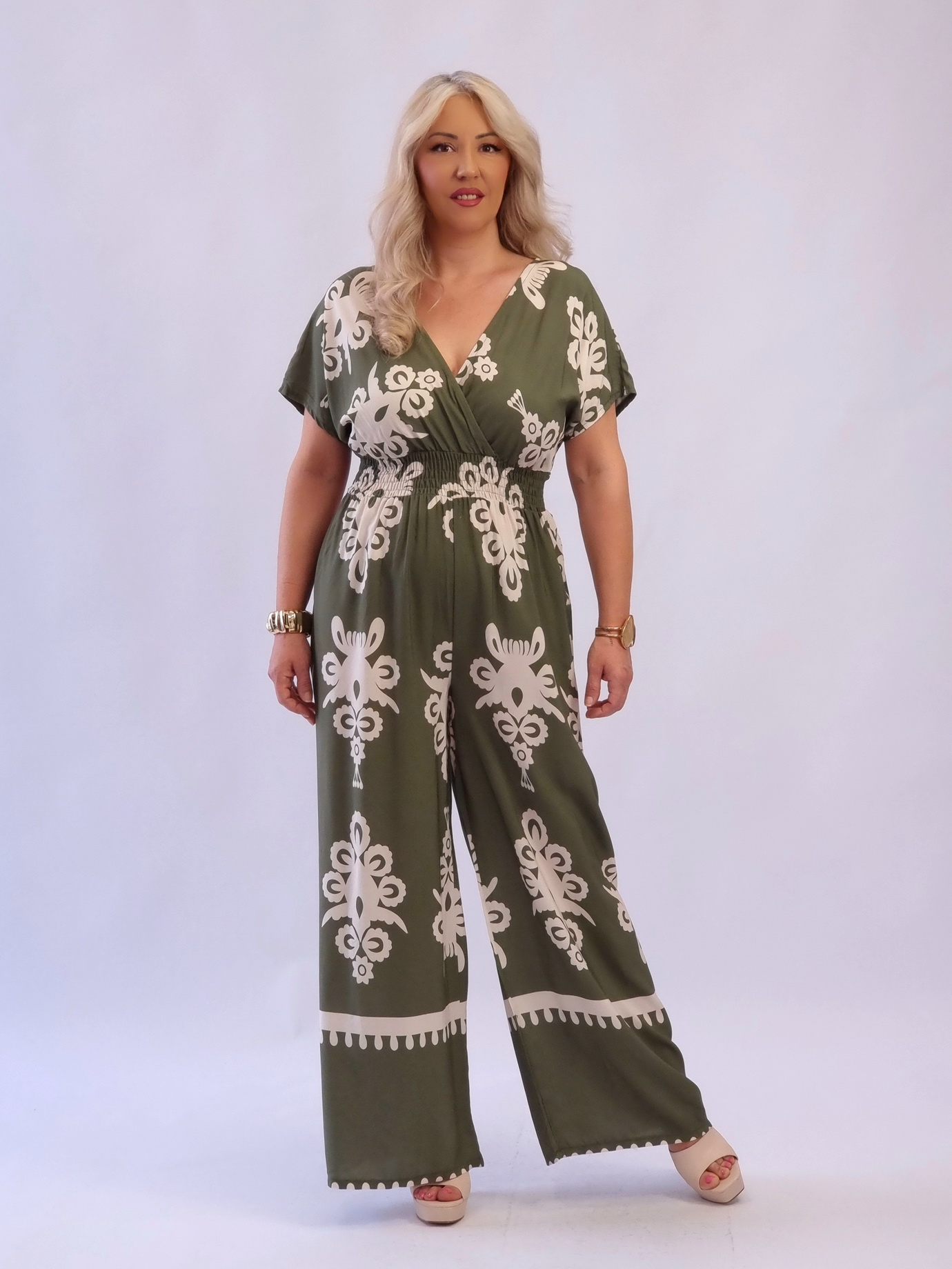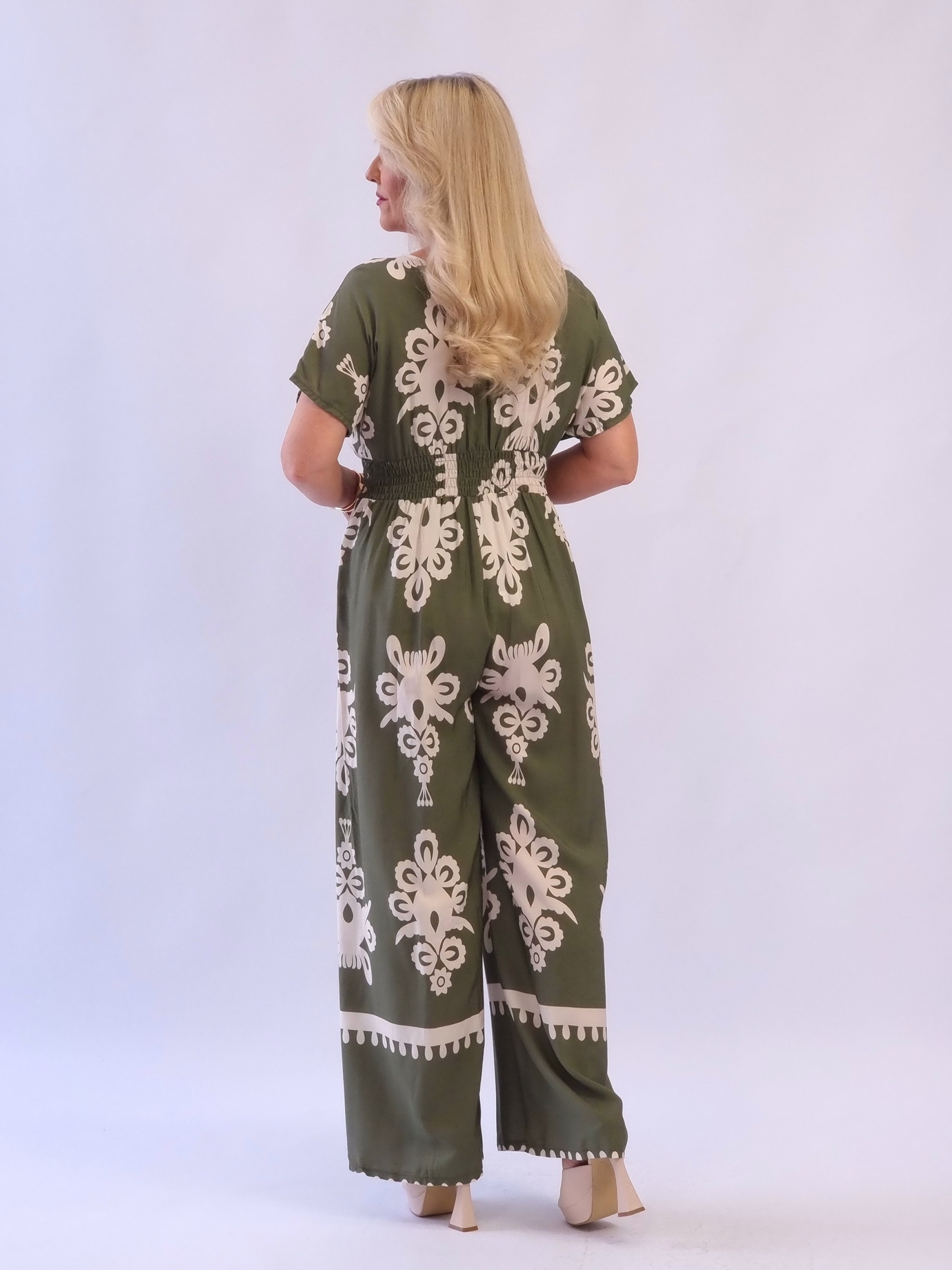 Ολόσωμη παντελόνα λάστιχο στη μέση με μοτίβα-Χακί