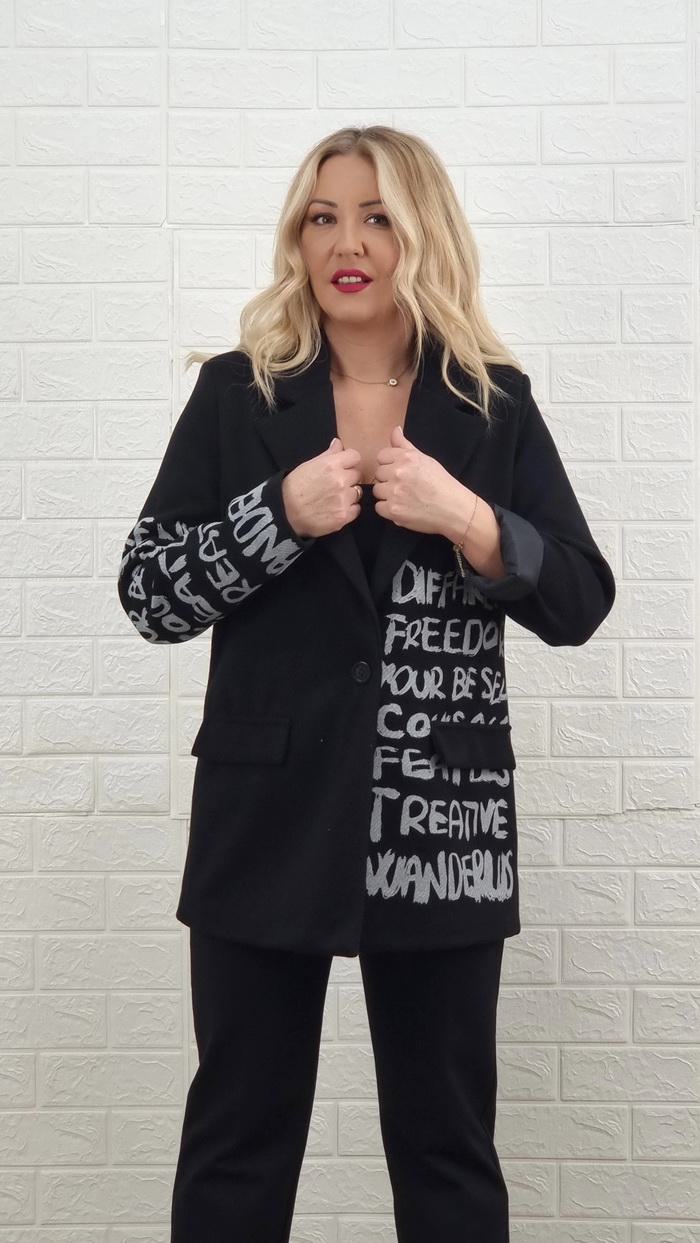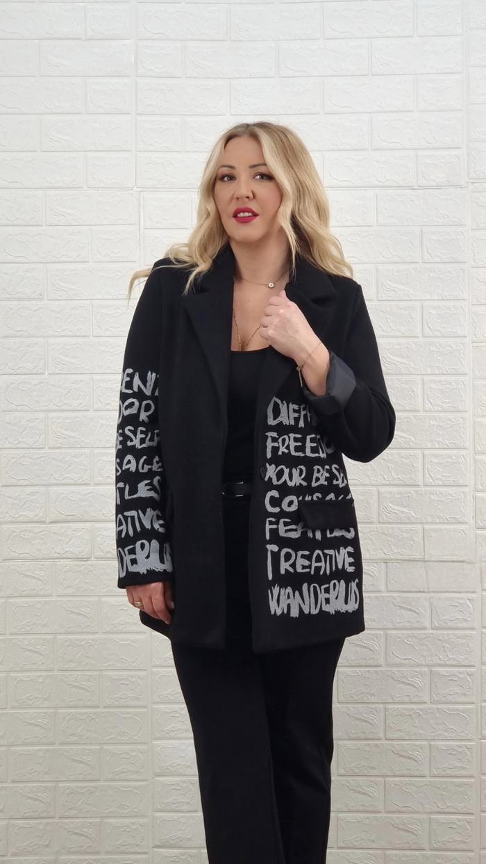 Πανωφόρι, σακάκι/παλτό. Έχει γιακά και κλείνει με ένα κουμπί. Είναι φοδραρισμένο και έχει σχέδιο με γράμματα στο δεξί μανίκι και στην αριστερή πλευρά. Οι τσέπες είναι εικονικές. 100%pol Οι μετρήσεις του πίνακα είναι αντιπροσωπευτικές για κάθε προϊόν.