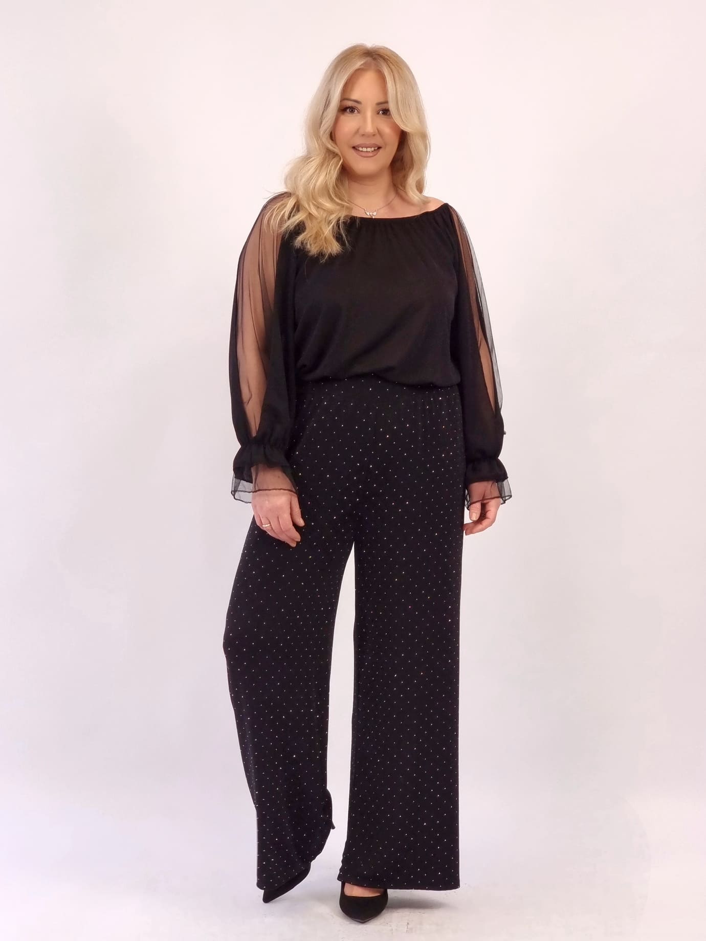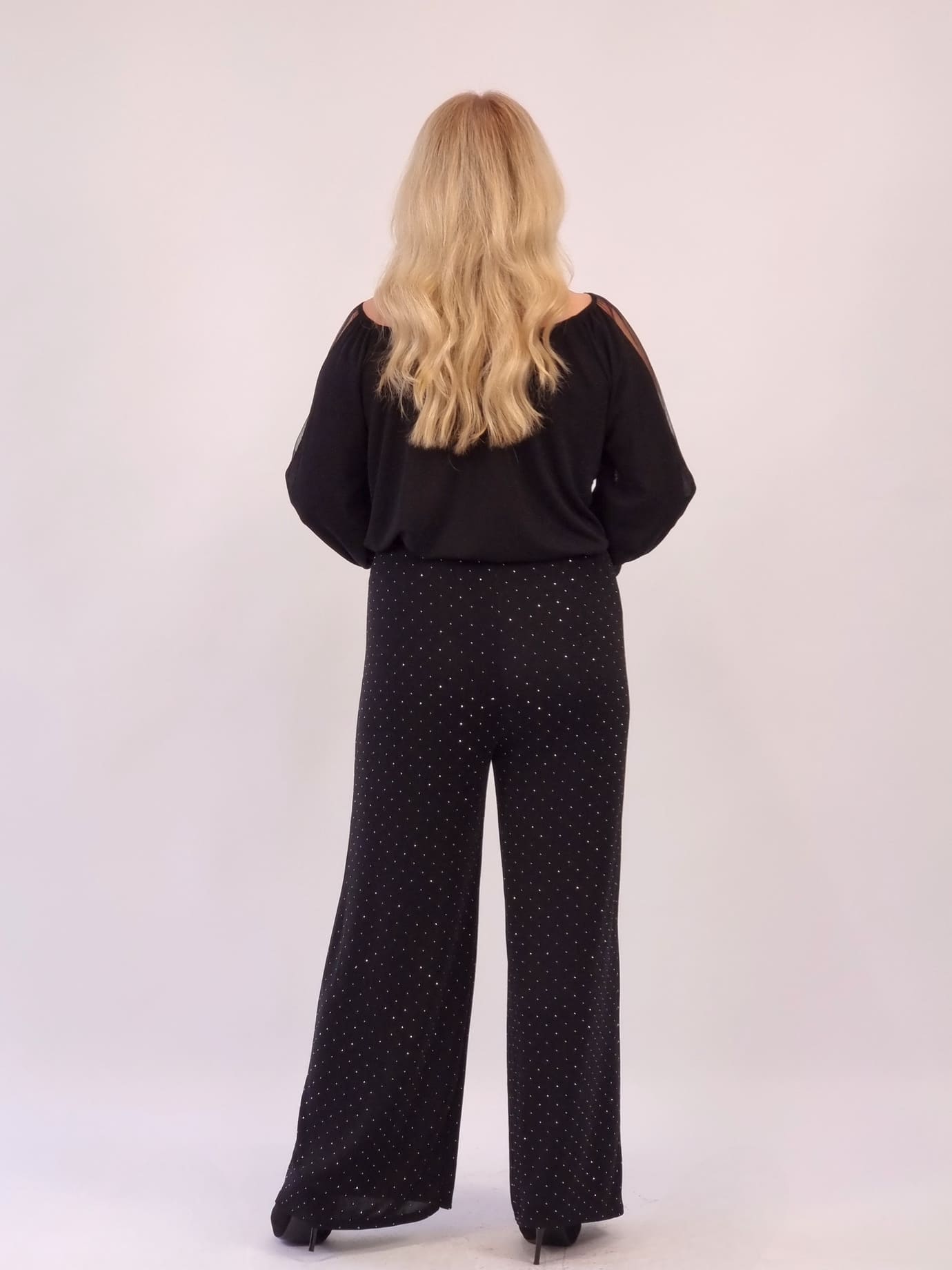 Ανάλαφρη, εντυπωσιακή παντελόνα με λούρεξ και μικρά στρασ που δίνουν διακριτική λάμψη χωρίς υπερβολές. Φαρδιά γραμμή, λάστιχο στη μέση για άνετη εφαρμογή και look που δουλεύει από πρωί μέχρι βράδυ.