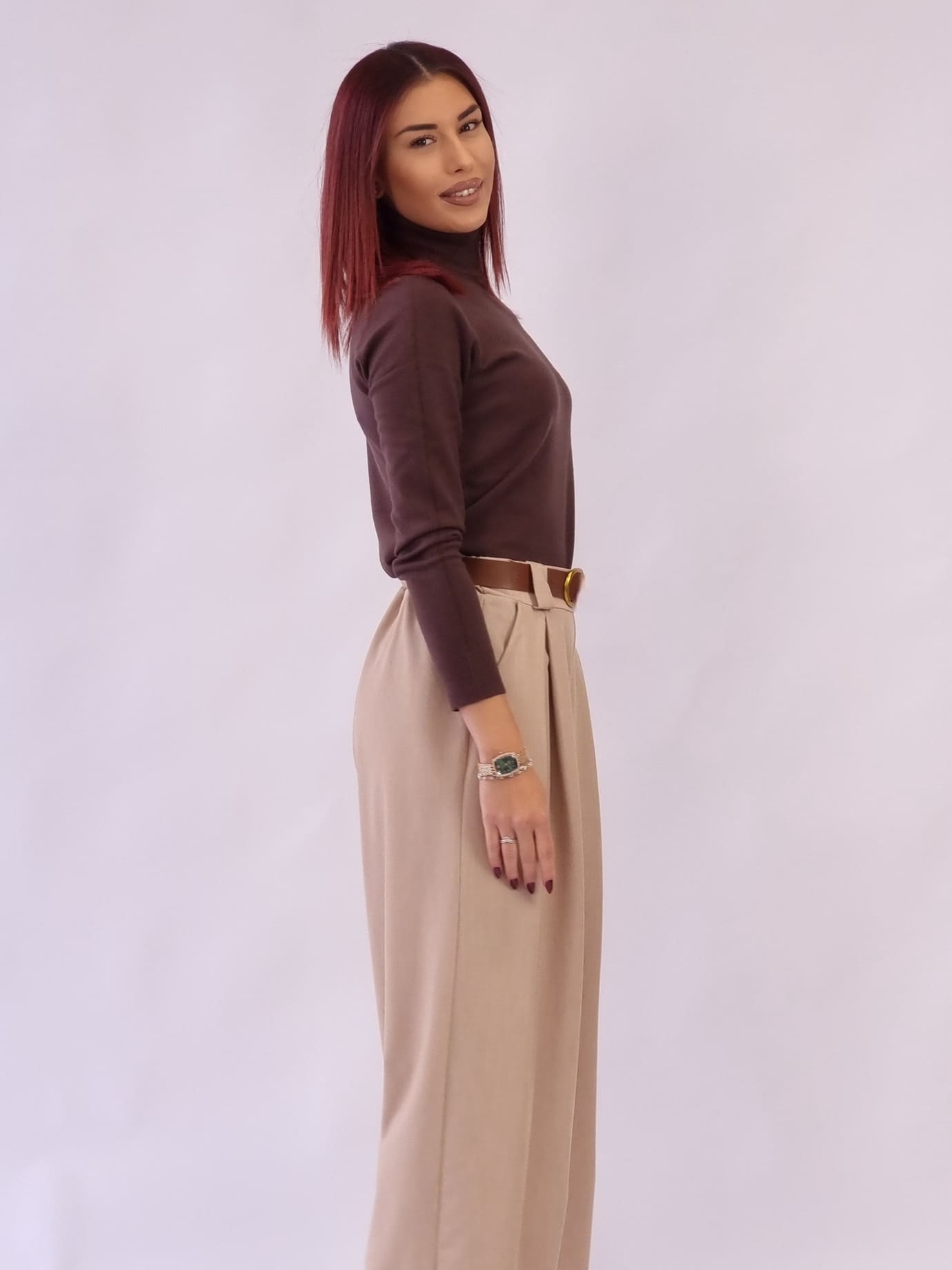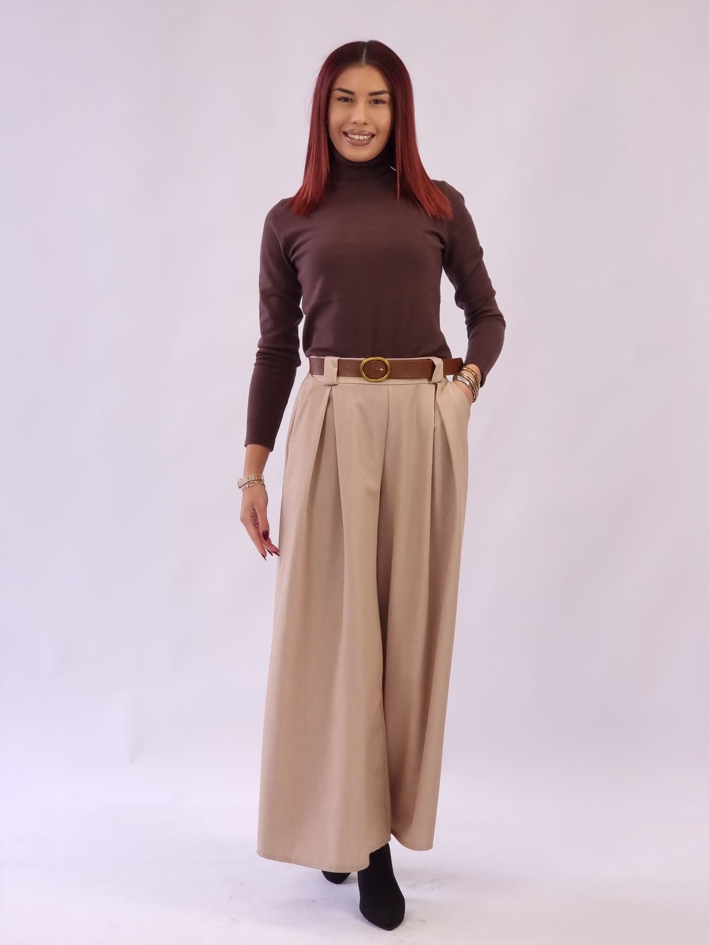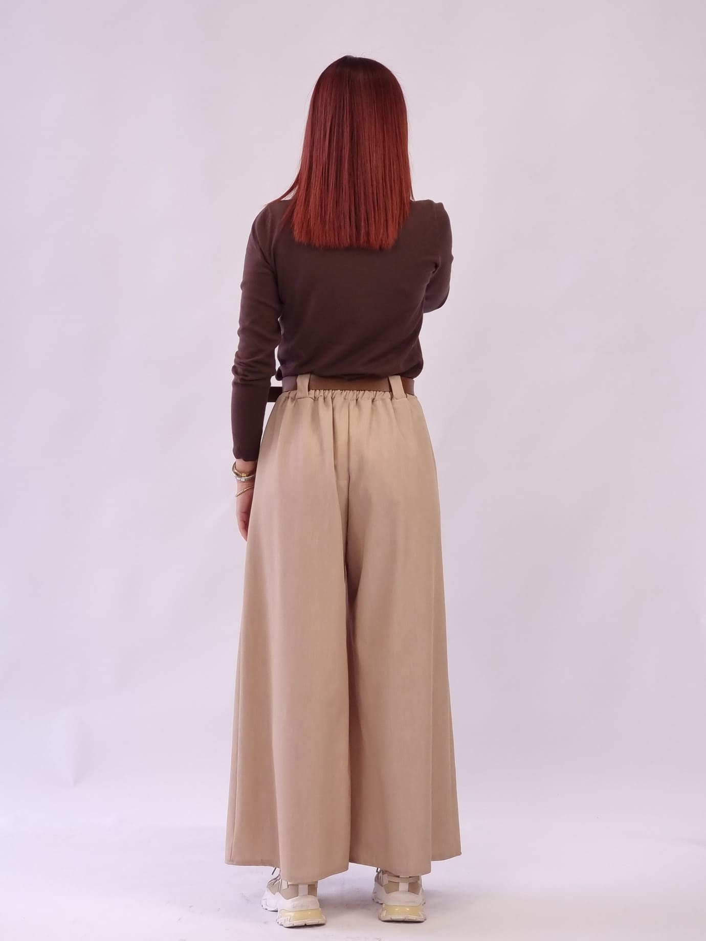 Άνετο ψηλόμεση παντελόνα με λάστιχο στη μέση και δώρο ζώνη.