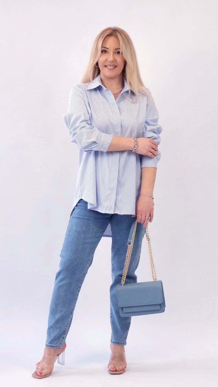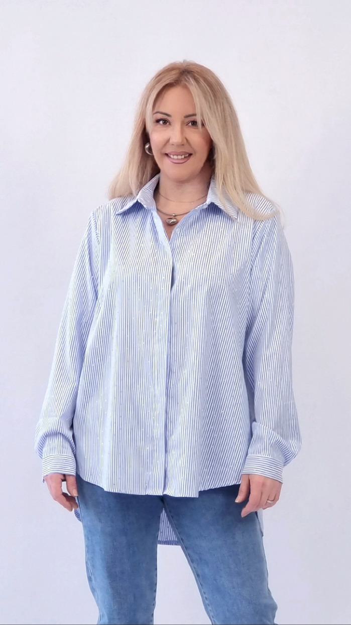 Σιέλ με λευκή ρίγα πουκαμίσα με κουμπιά και πατηλέτα, μικρό στρασάκι, oversized γραμμή Έχει κουμπί στις μανσέτες Σύνθεση προϊόντος: 90% pol 10% cotton