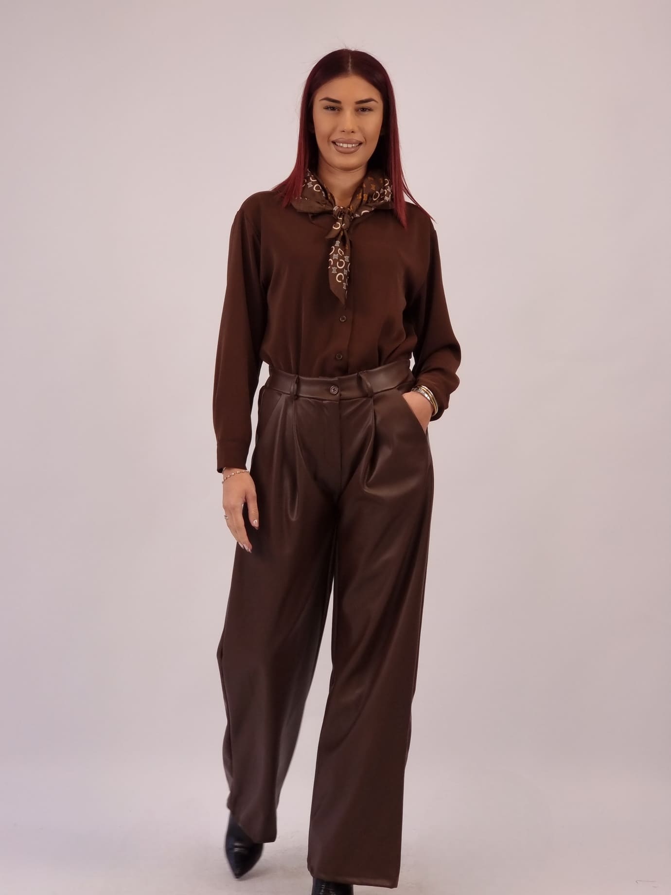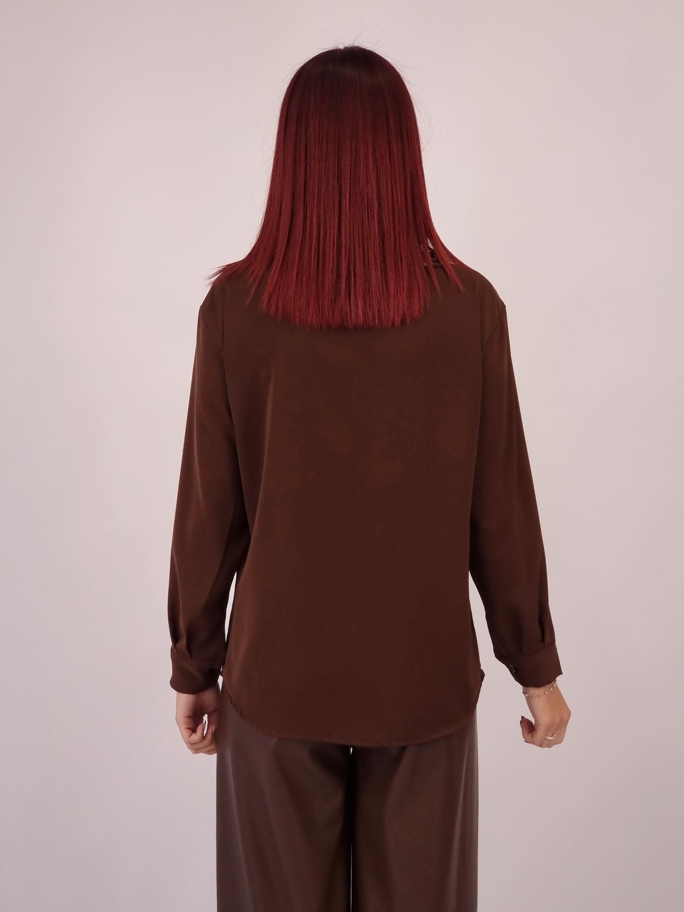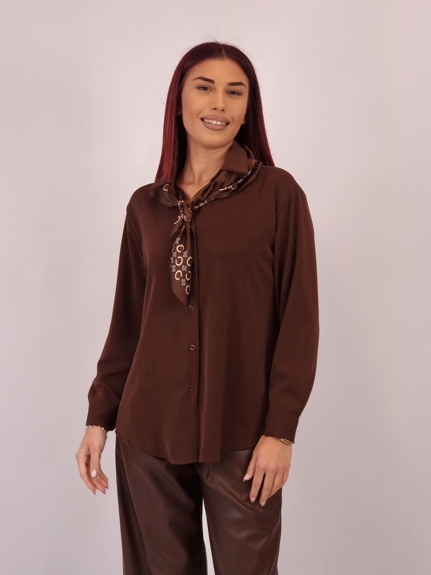Κομψό σοκολά πουκάμισο με μαλακή υφή και φουλάρι για stylish αποτέλεσμα χωρίς προσπάθεια. Το ύφασμά του είναι απαλό, άνετο και πέφτει όμορφα στο σώμα, προσφέροντας άνεση όλη την ημέρα χωρίς να κολλάει.