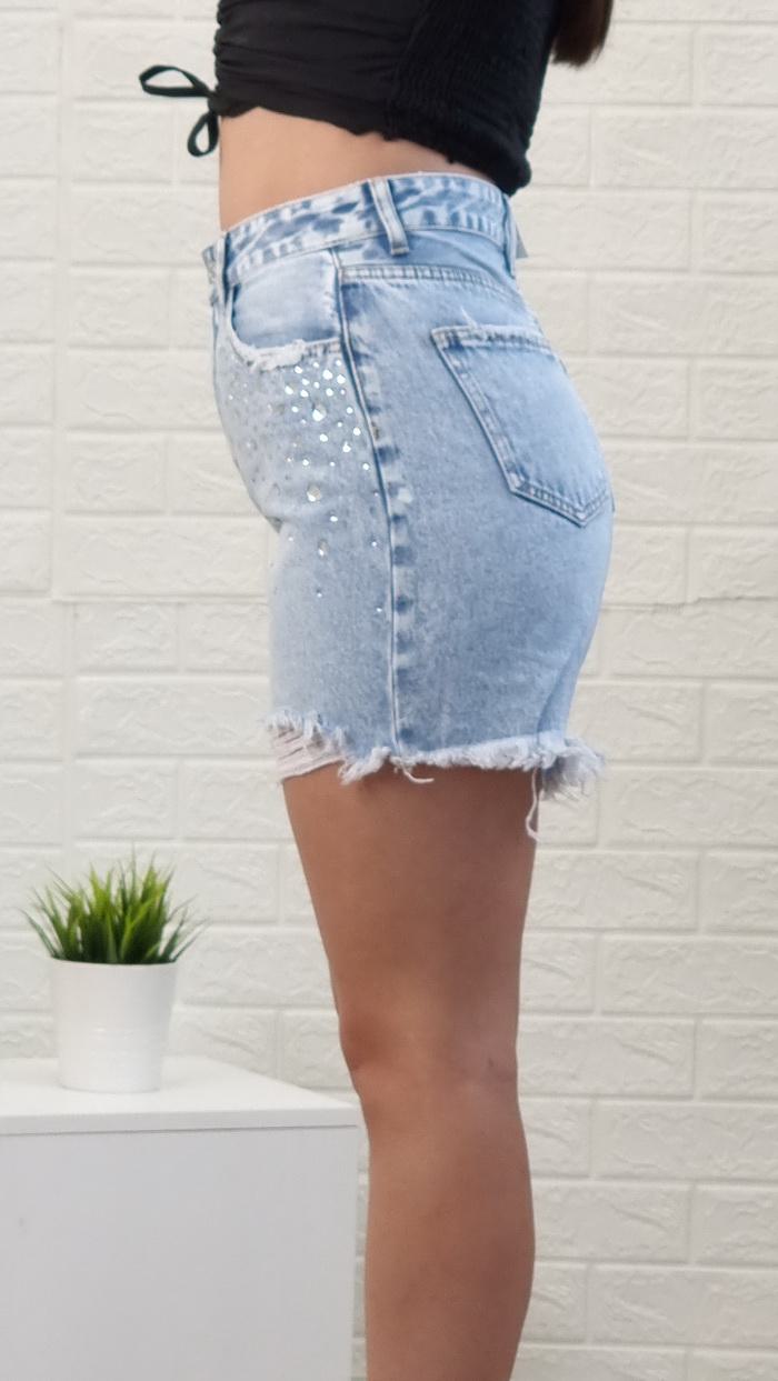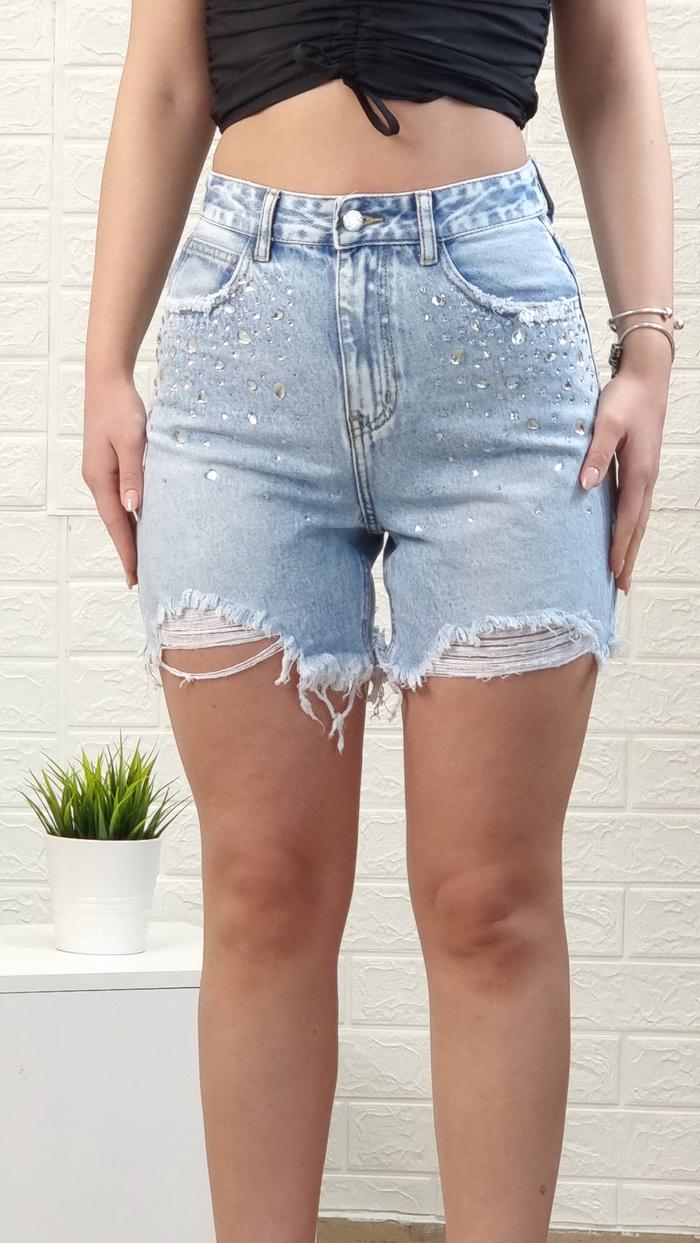 • Ψηλόμεσο σόρτς τζίν με στρας και ξέφτια