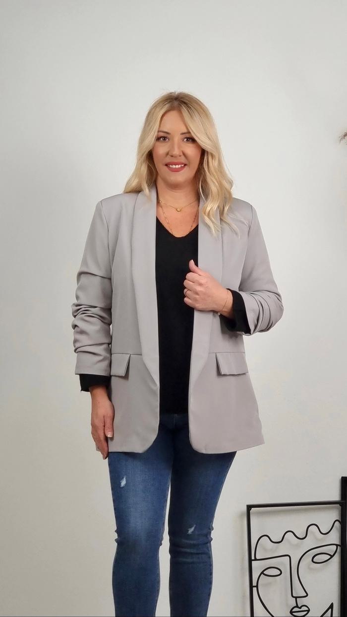 • Γκρί Σακάκι oversized φοδραρισμένο με βάτες στους ώμους και σούρα στα μανίκια.