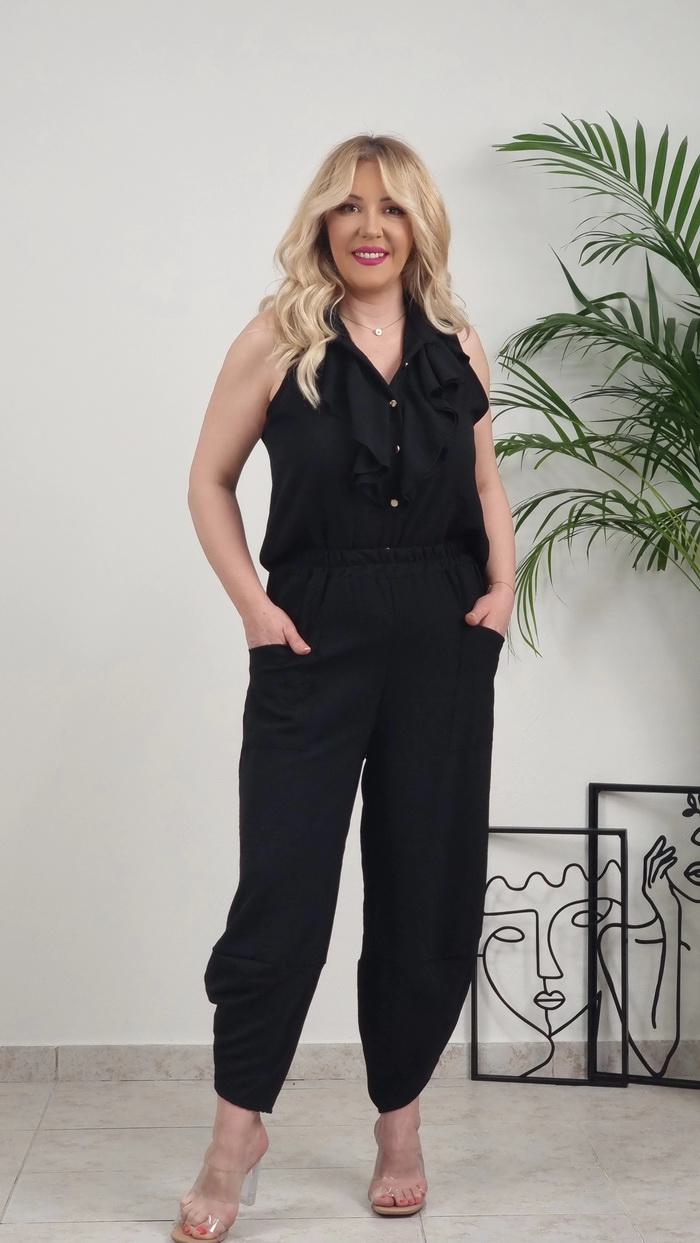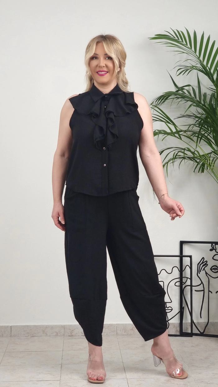 Σετ πουκάμισο-παντελόνι. Το πουκάμισο είναι αμάνικο, με κλασσικό γιακά και κουμπιά από πάνω έως κάτω. Στο στήθος έχει βολάν. Το παντελόνι είναι τύπου σαλβάρι, λάστιχο στη μέση και μπροστινές τσέπες. Καλύπτει τα μεγέθη S,M,L. 100%pol Οι μετρήσεις του πίνακα είναι αντιπροσωπευτικές για κάθε προϊόν.