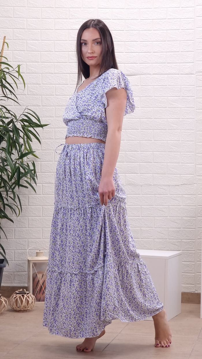 • Η φούστα  είναι μακριά με βολάν και λάστιχο στη μέση