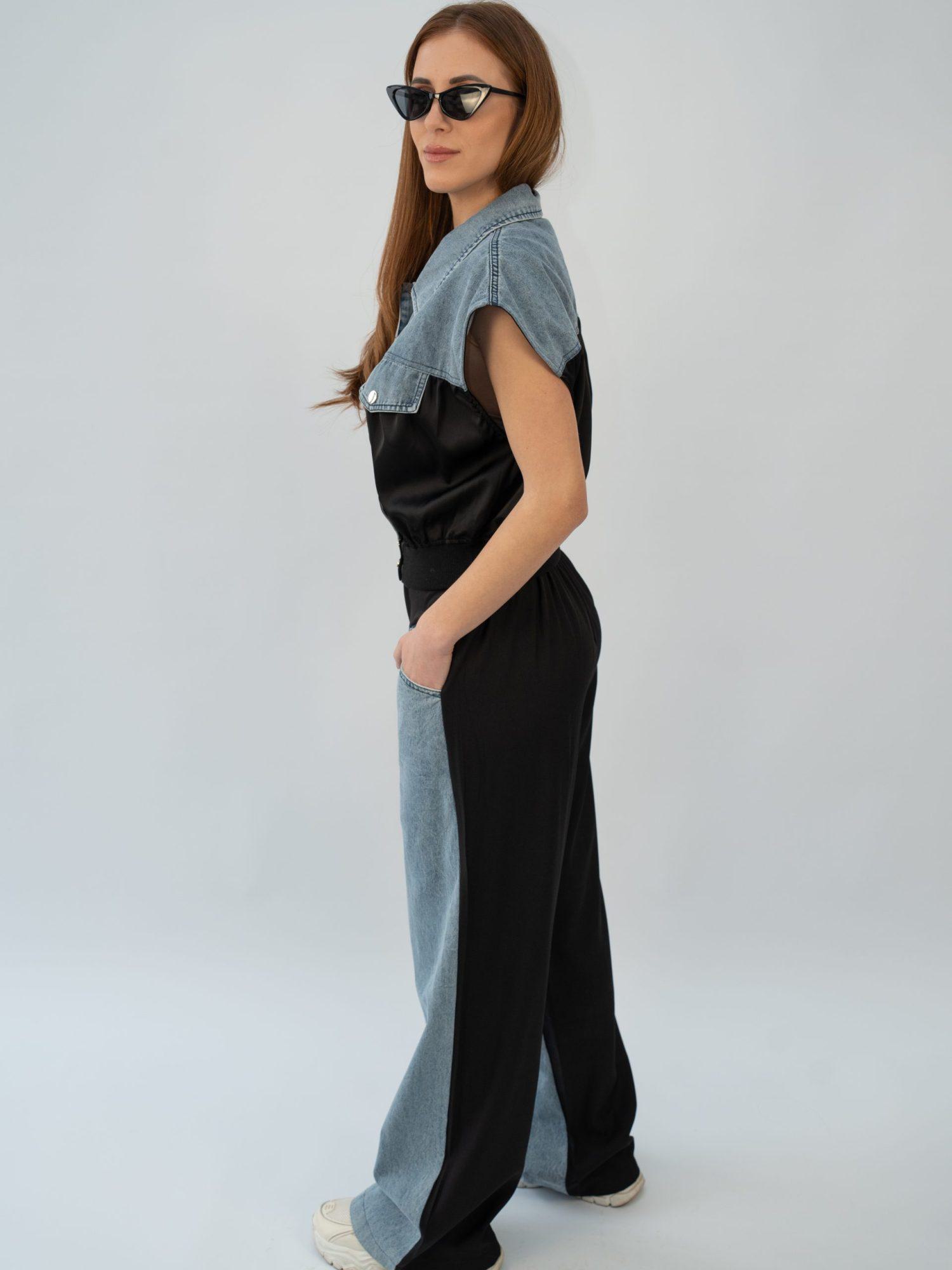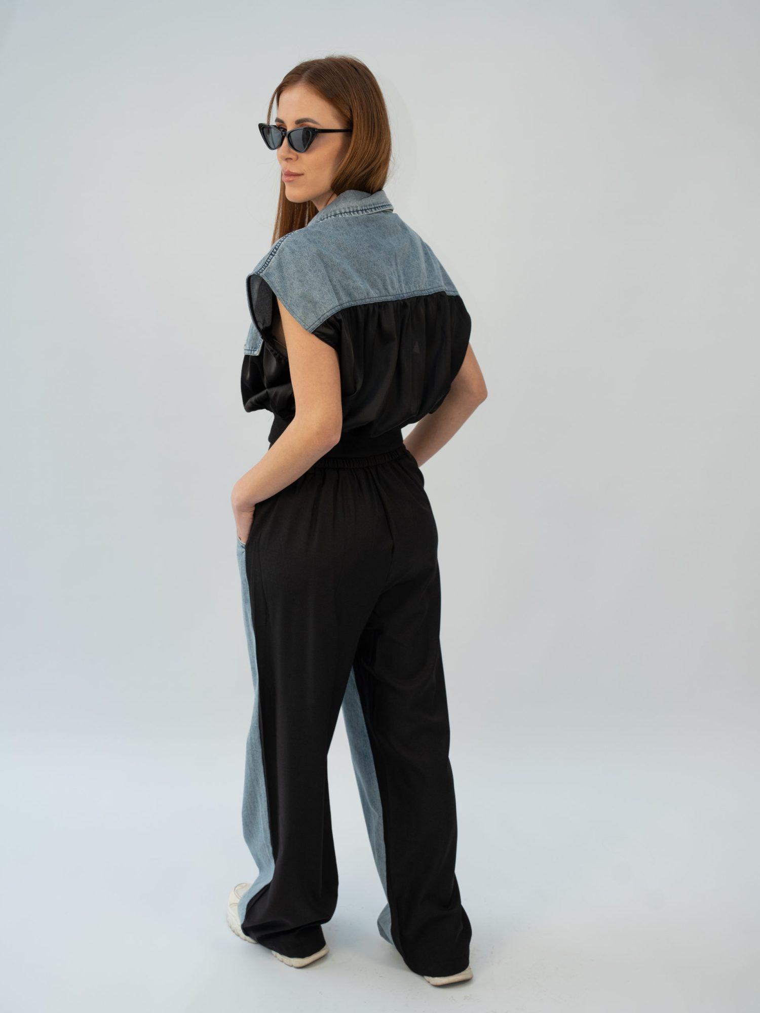 Μαύρο Σετ που αποτελείται από γιλέκο και παντελόνι. Το γιλέκο κλείνει με κουμπιά, διαθέτει εικονικές τσέπες και γιακά έχει λάστιχο στο τελείωμα του και λεπτομέρειες μαλακό τζίν στο επάνω μέρος. Το παντελόνι στην μπροστινή όψη είναι μαλακό τζίν και πίσω είναι ύφασμα Κλείνει με κουμπιά και φερμουάρ. Διαθέτει τσέπες στο μπροστινό μέρος και λάστιχο στο πίσω μέρος της μέσης. Σύνθεση προϊόντος: 50% cotton, 50% pol Οι μετρήσεις του πίνακα είναι αντιπροσωπευτικές για κάθε προϊόν.
