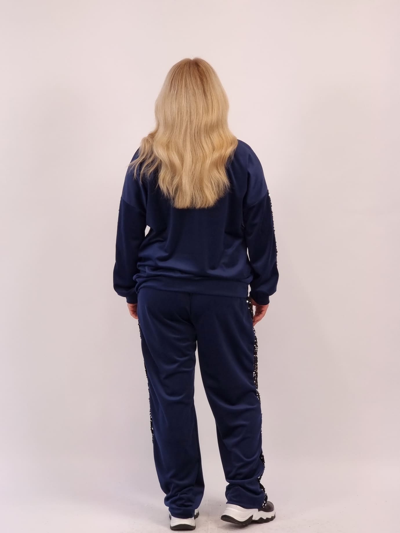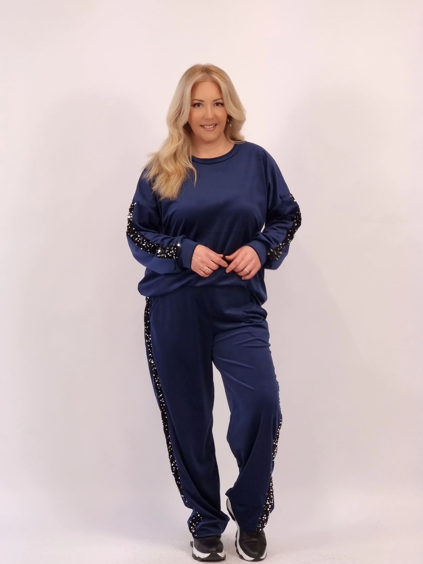 Oversized σετ από μαλακό βελούτε ύφασμα, με εντυπωσιακή παγιέτα στη μπλούζα και στο πλάι του παντελονιού. Προσφέρει άνεση, στυλ και κίνηση χωρίς περιορισμούς.