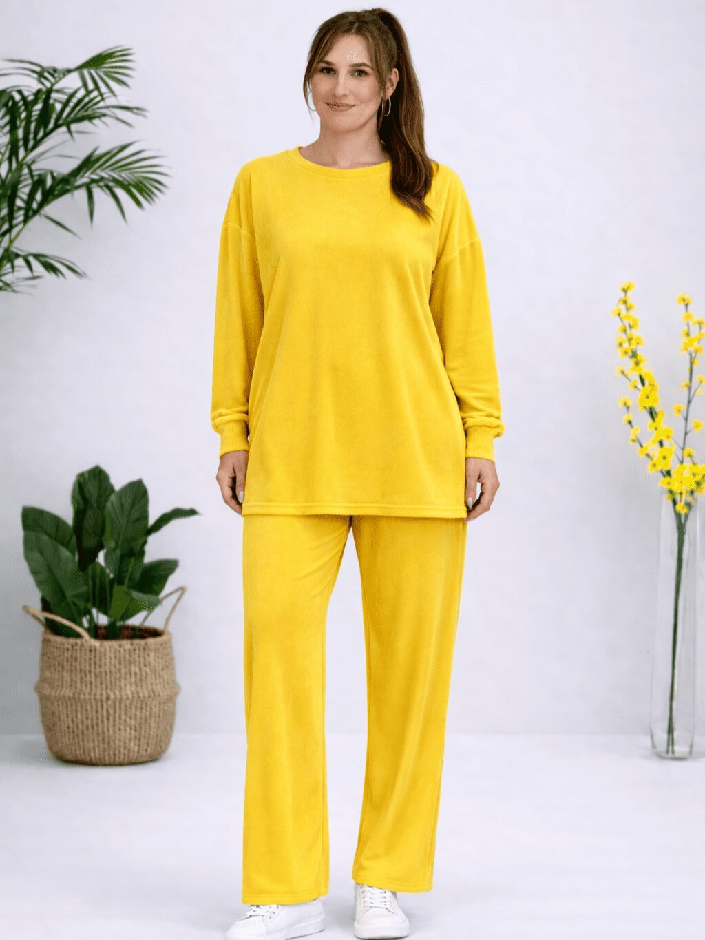 Άνετο velvet σετ με κομψή V λαιμόκοψη και φαρδιά γραμμή.