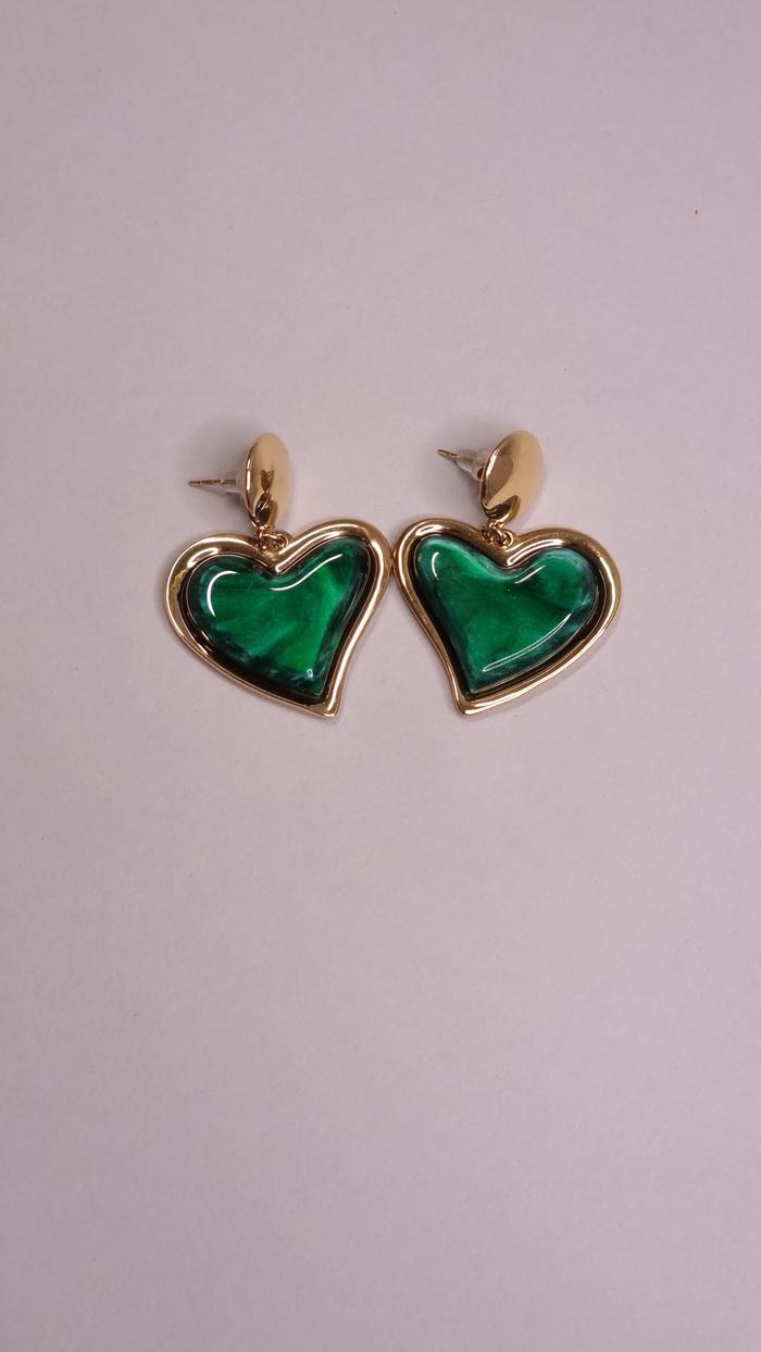 • Σκουλαρίκια κρεμαστά καρφωτά, ατσάλινα σε χρυσή απόχρωση με κυπαρισσί πέτρα καρδιά.