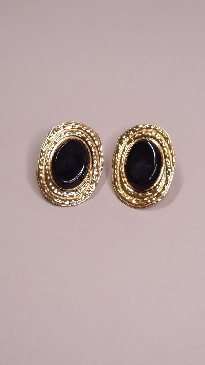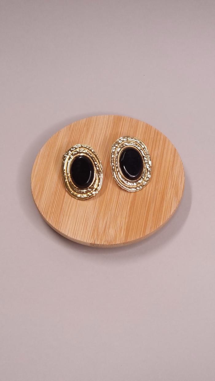 • Σκουλαρίκια ατσάλι καρφωτά, σχήμα οβάλ με μαύρη πέτρα και σφυρήλατο σχέδιο χρώμα χρυσό.