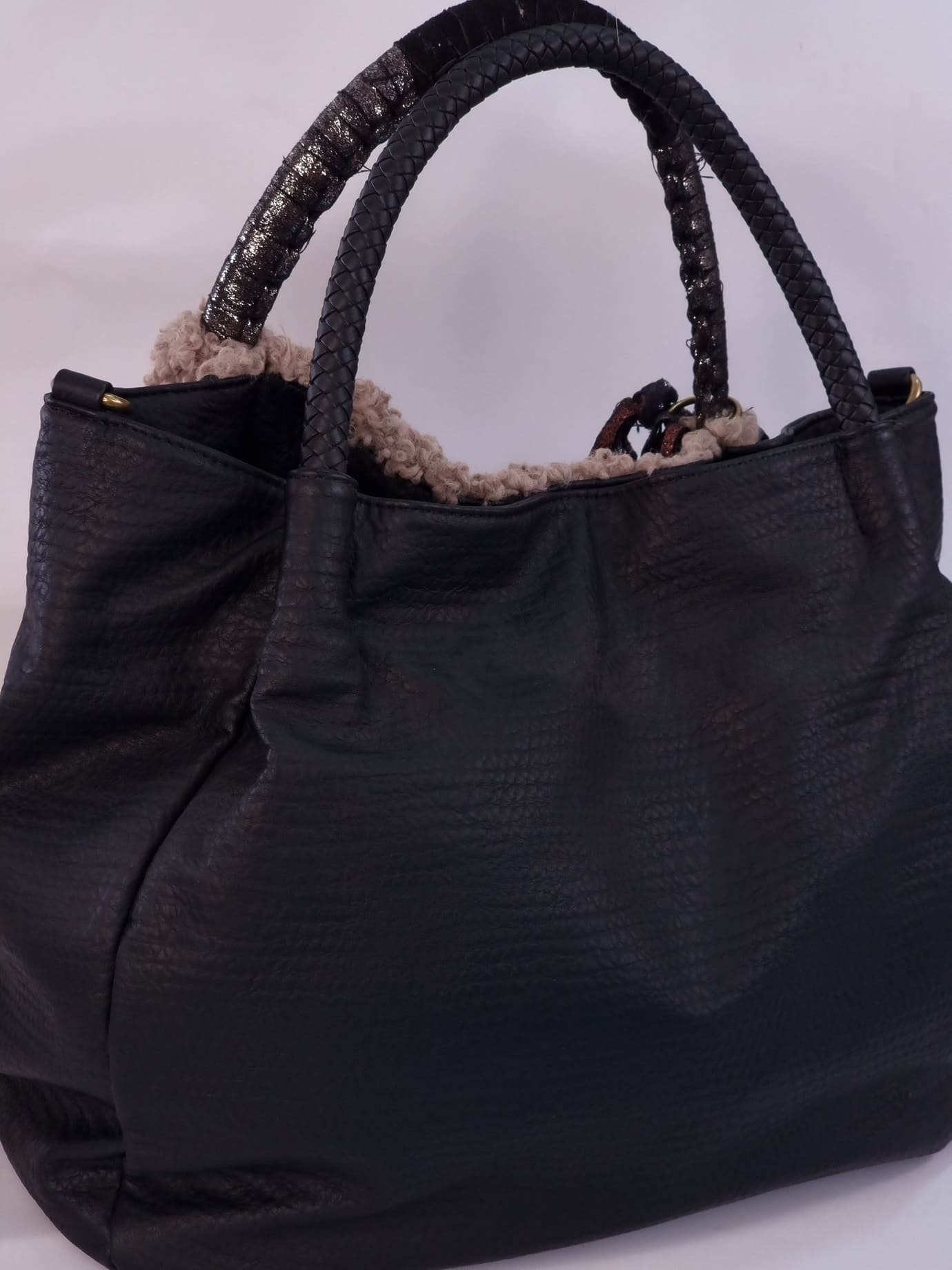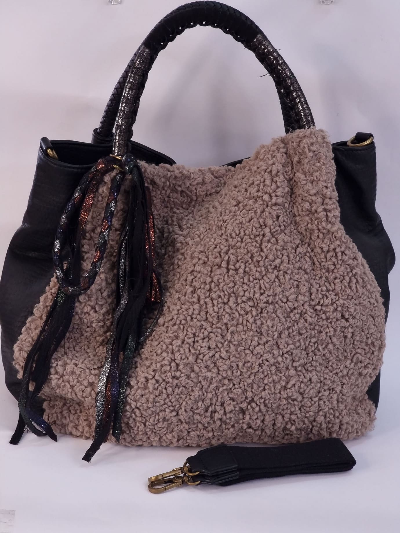 Τσάντα ώμου & χειρός απο εξαιρετική ποιότητα συνθετική γούνα πρόβατο και δερματίνη, χρώμα μαύρο- μπεζ. κλείνει με φερμουάρ και κουμπί. Διαθέτει αποσπώμενο λουράκι και διακοσμητικά κρόσσια που αφαιρούνται. ΔΙΑΣΤΑΣΕΙΣ: 37x40x15