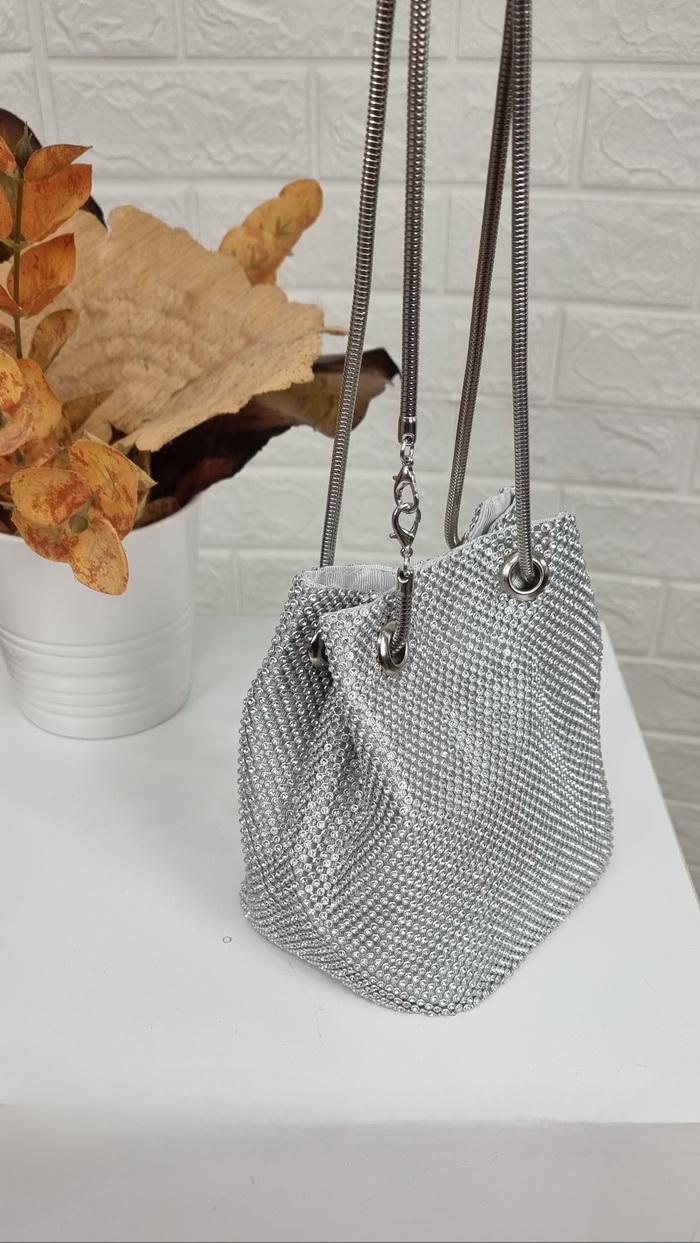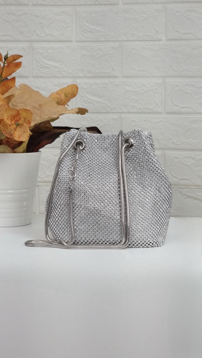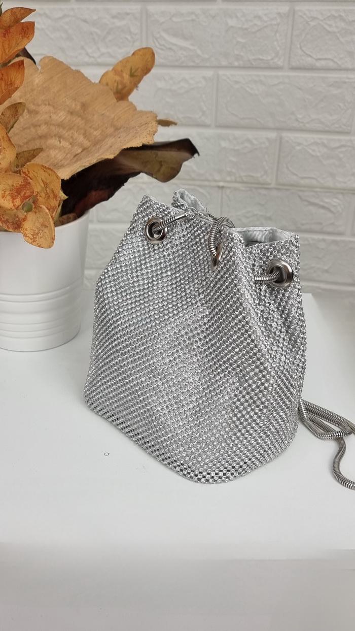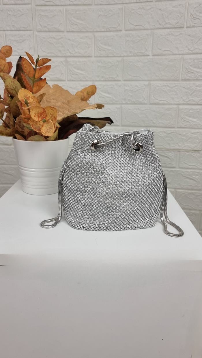 Τσάντα βραδινή πουγκί με στρας. Ένα πολύ ιδιαίτερο και μοδάτο τσαντάκι για εντυπωσιακές βραδινές εμφανίσεις. Διαθέτει μια κύρια θήκη που κλείνει με μαγνήτη. Με ρυθμιζόμενη μεταλλική αλυσίδα. Μπορεί να φορεθεί στον ώμο ή χιαστί. Διαστάσεις: 15x5x10 cm