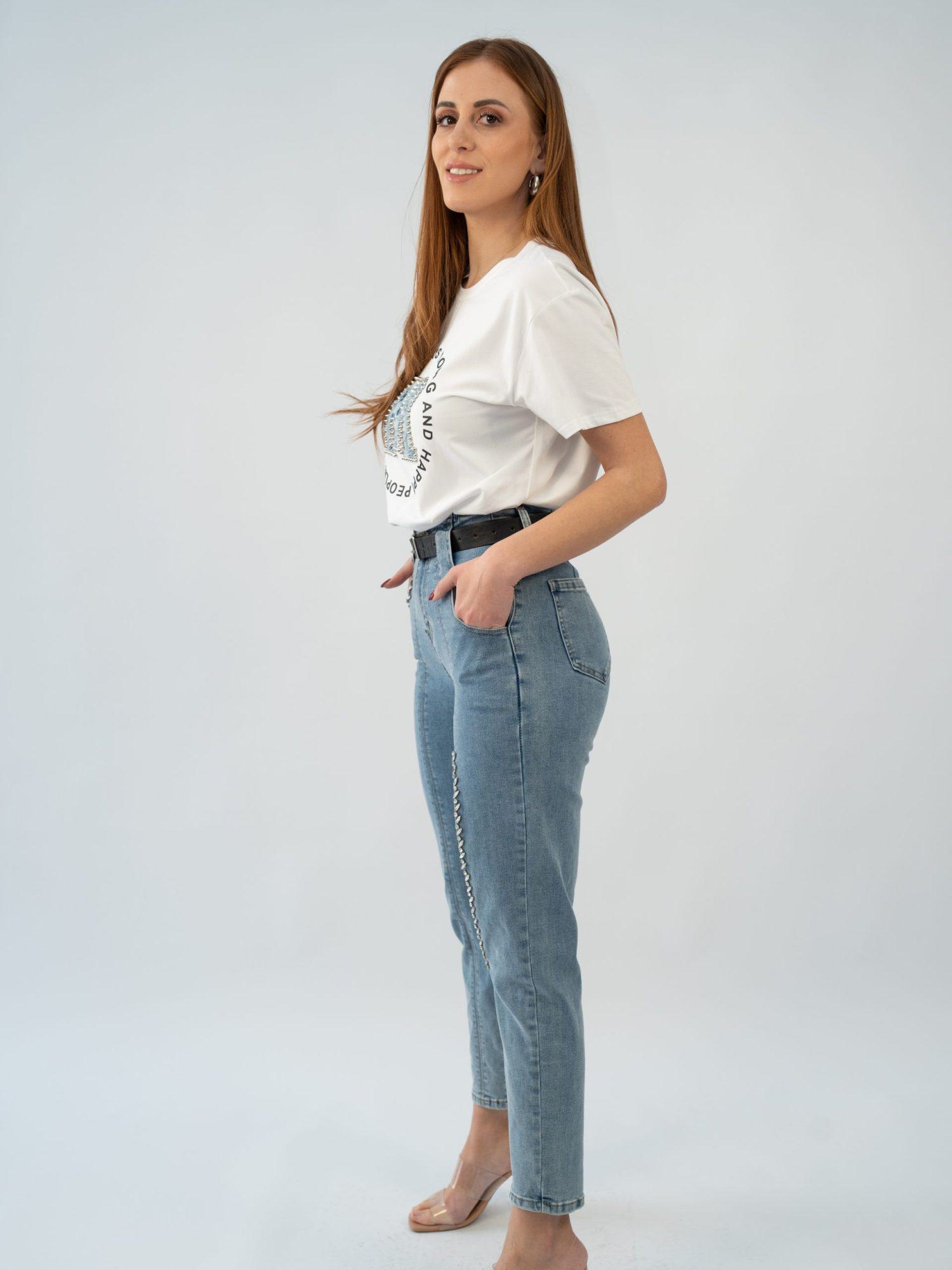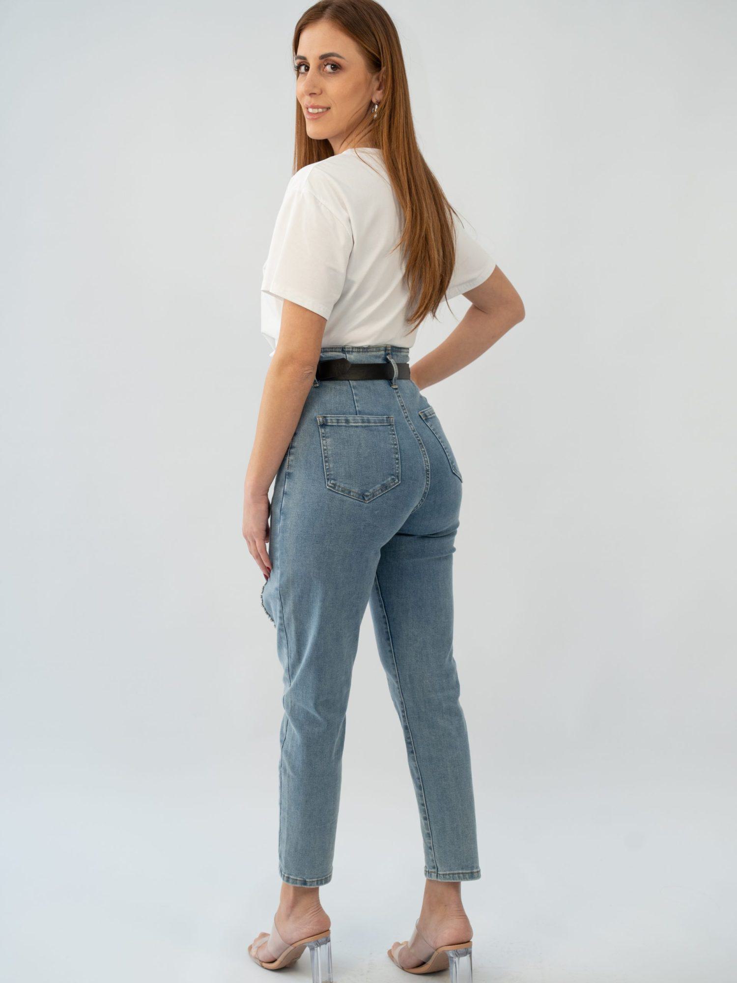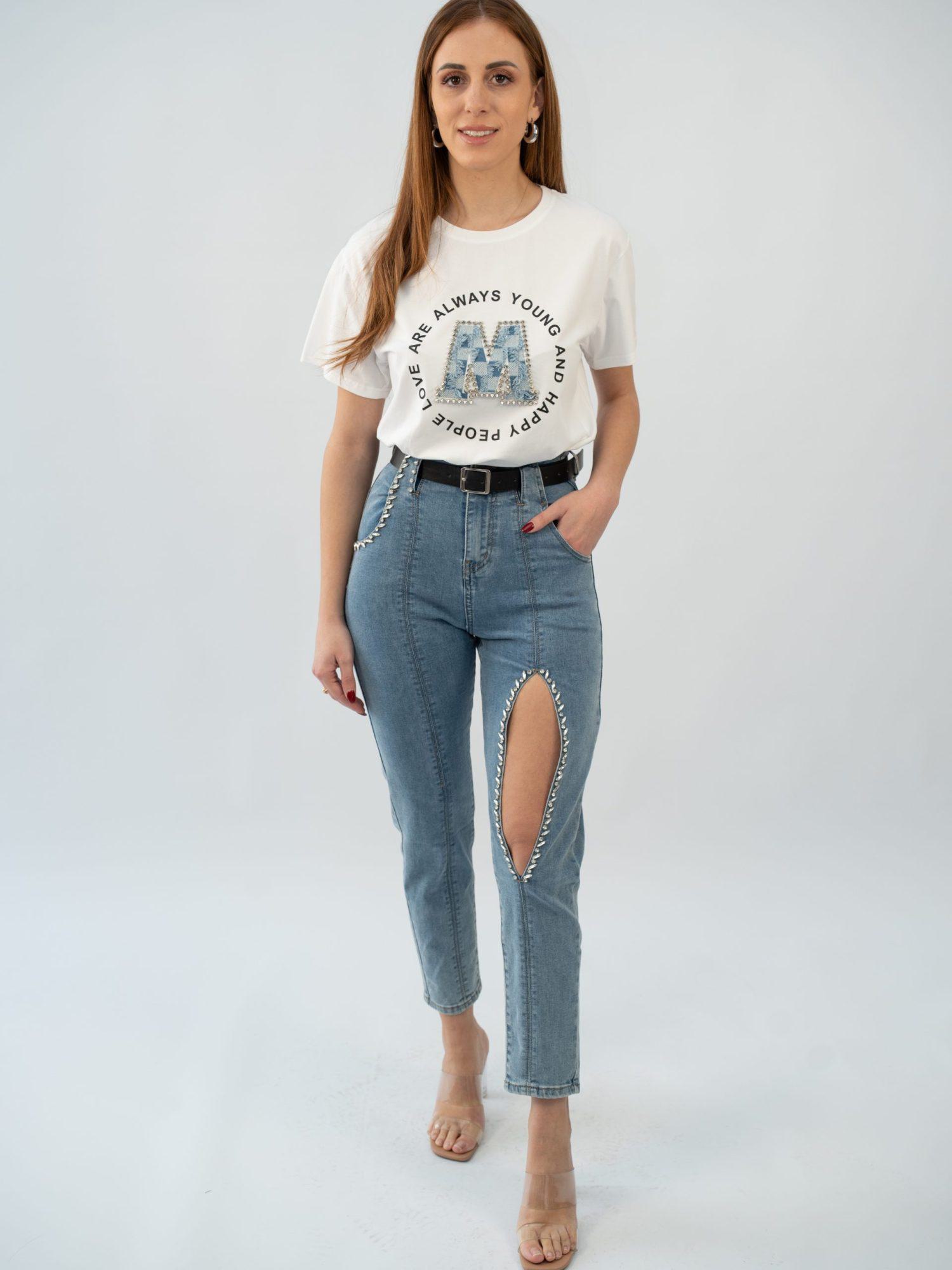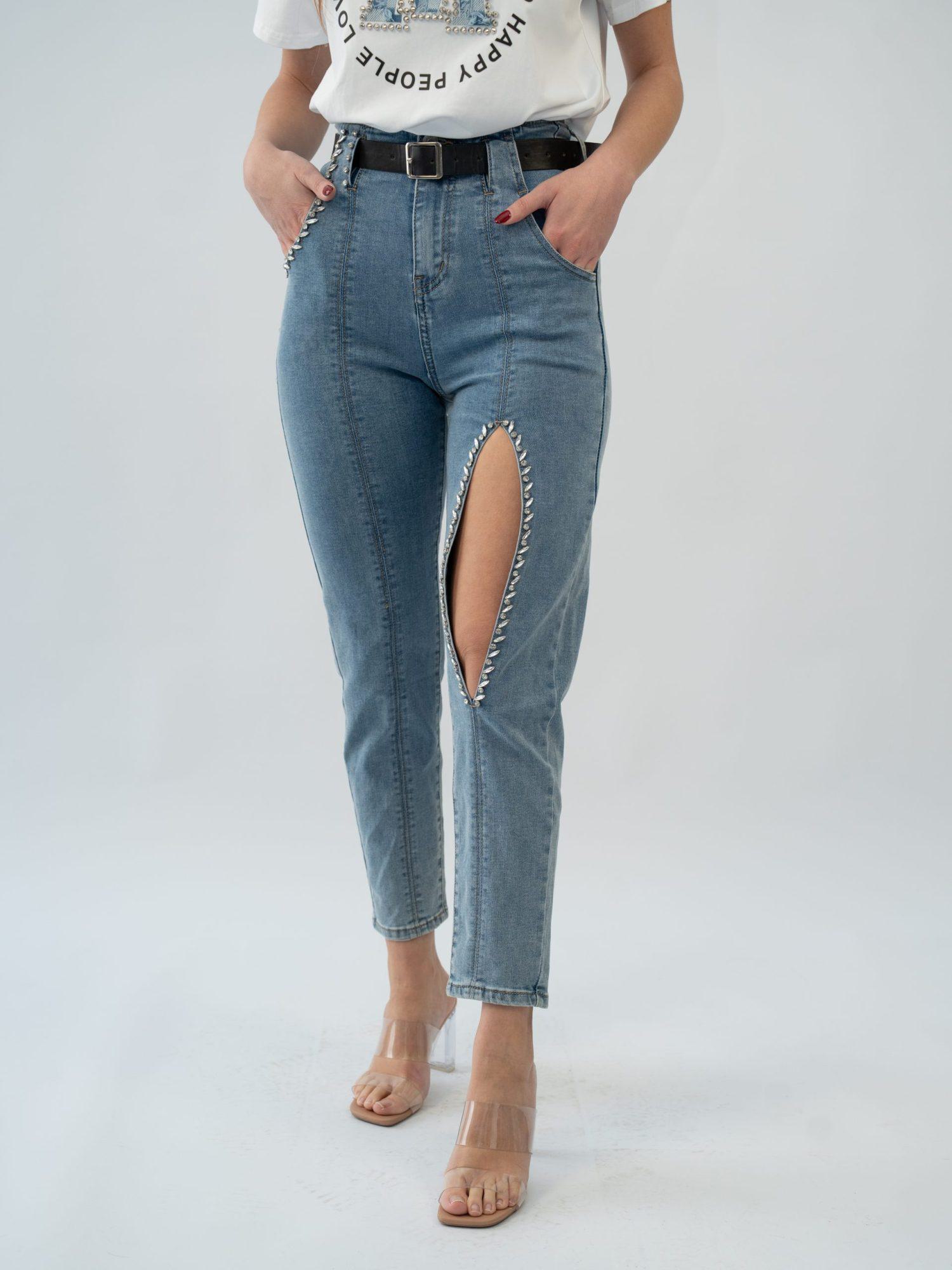 • Μπλέ Τζιν ψηλόμεσο, με σκίσιμο και  πέτρες στρας