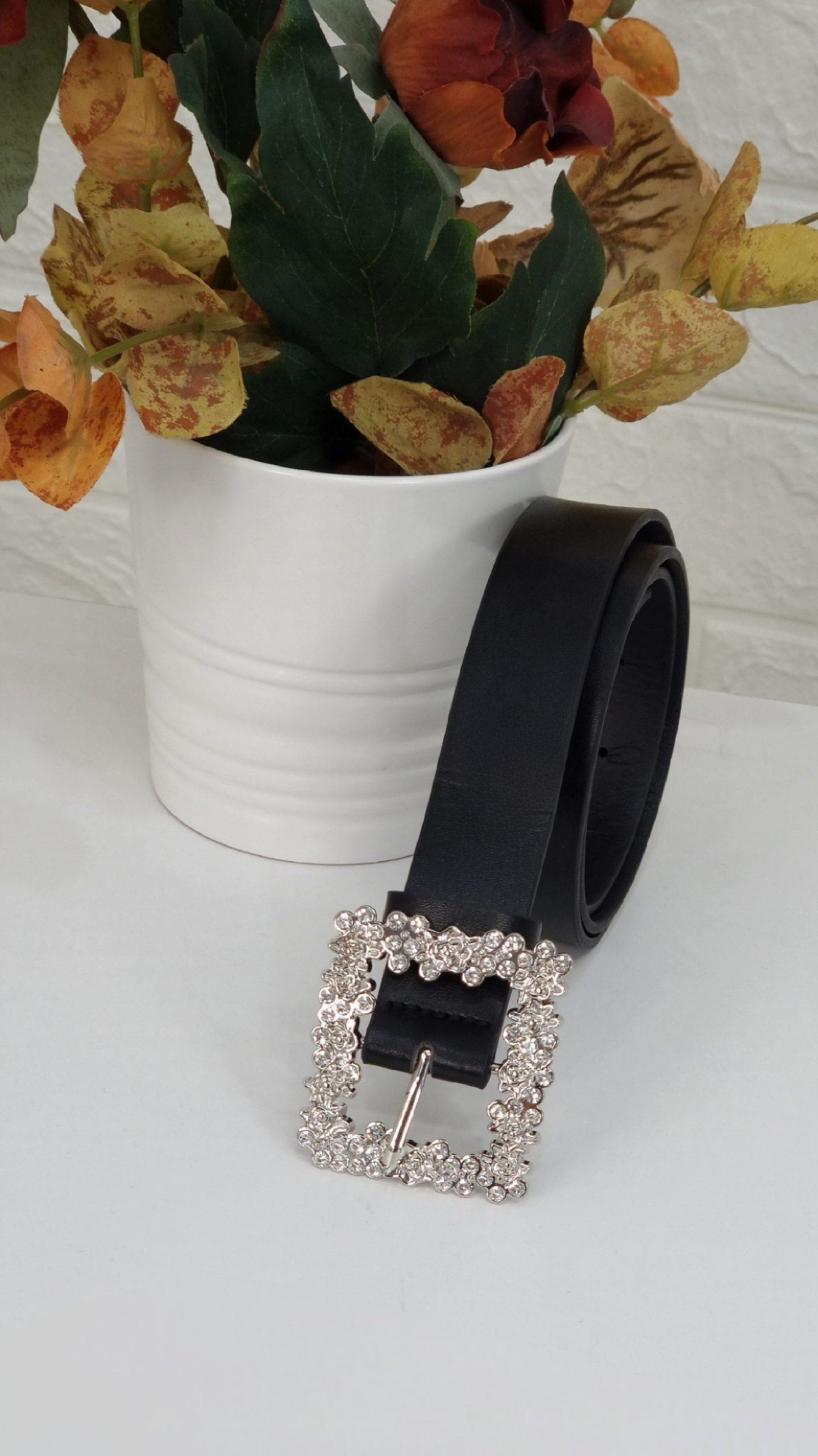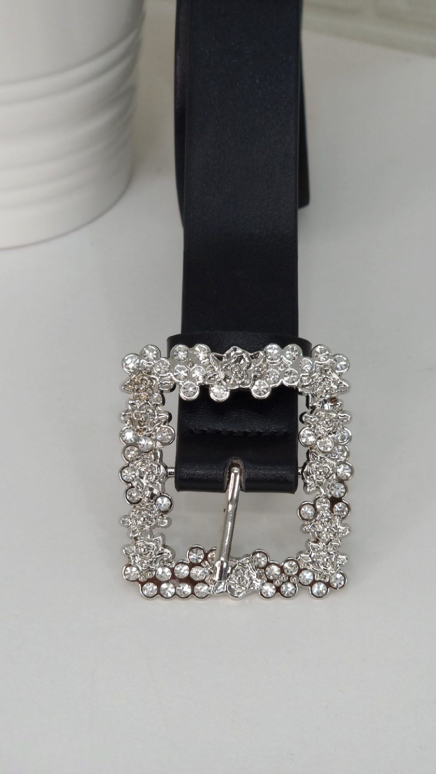 Ζώνη δερματίνη με ασημί τετράγωνο τοκά και στρας