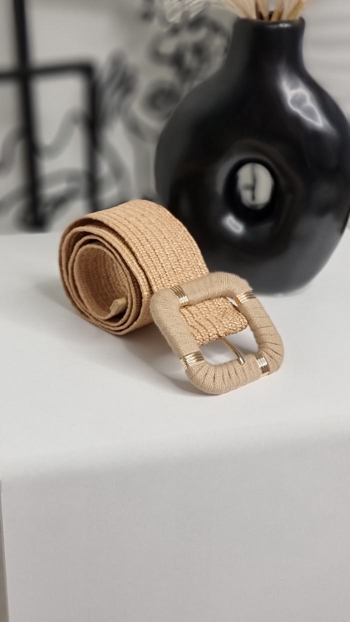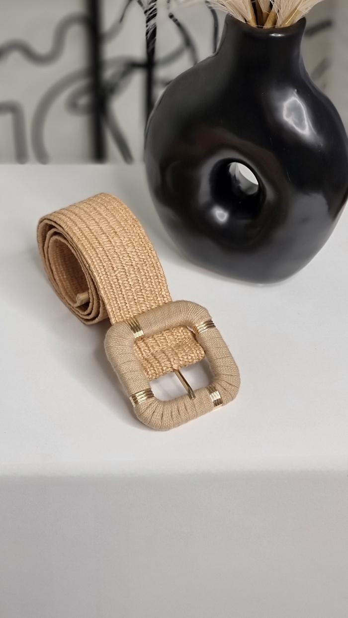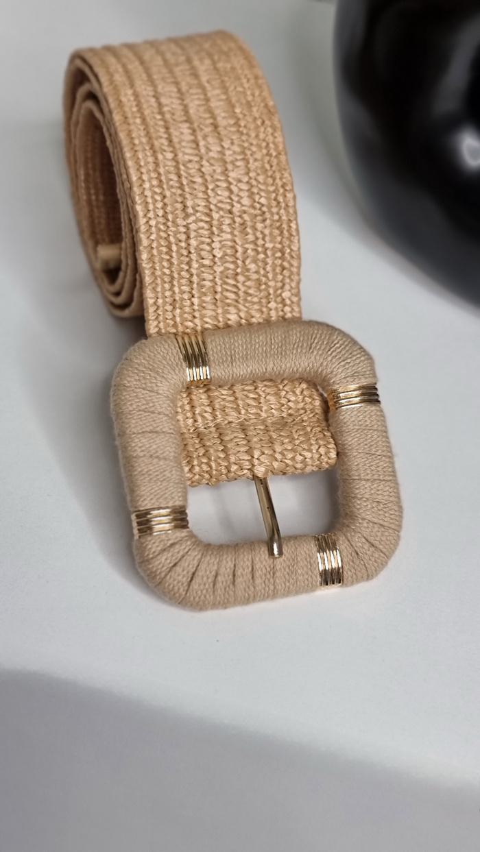 • Μπέζ ψάθινη ελαστική ζώνη με μεταλλικό τετράγωνο τοκά καλυμμένο με κορδόνι