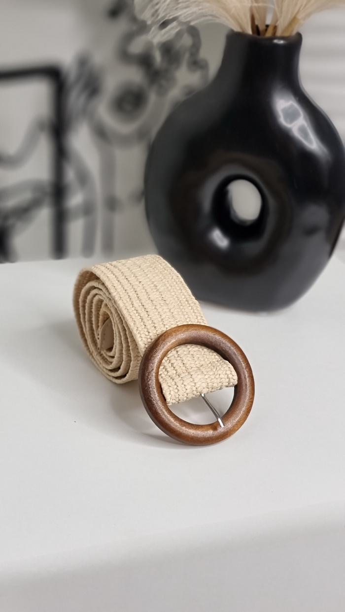 • Μπέζ Ψάθινη ελαστική ζώνη με καφέ ξύλινο στρόγγυλο τοκά